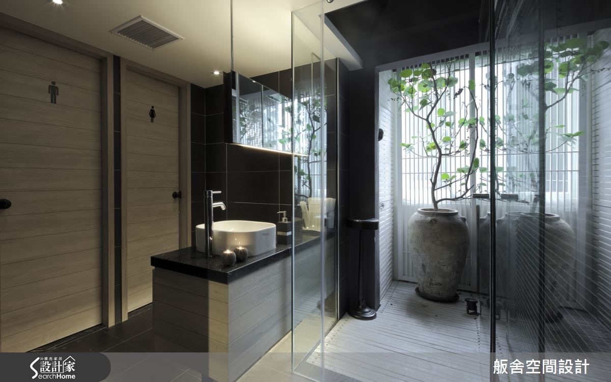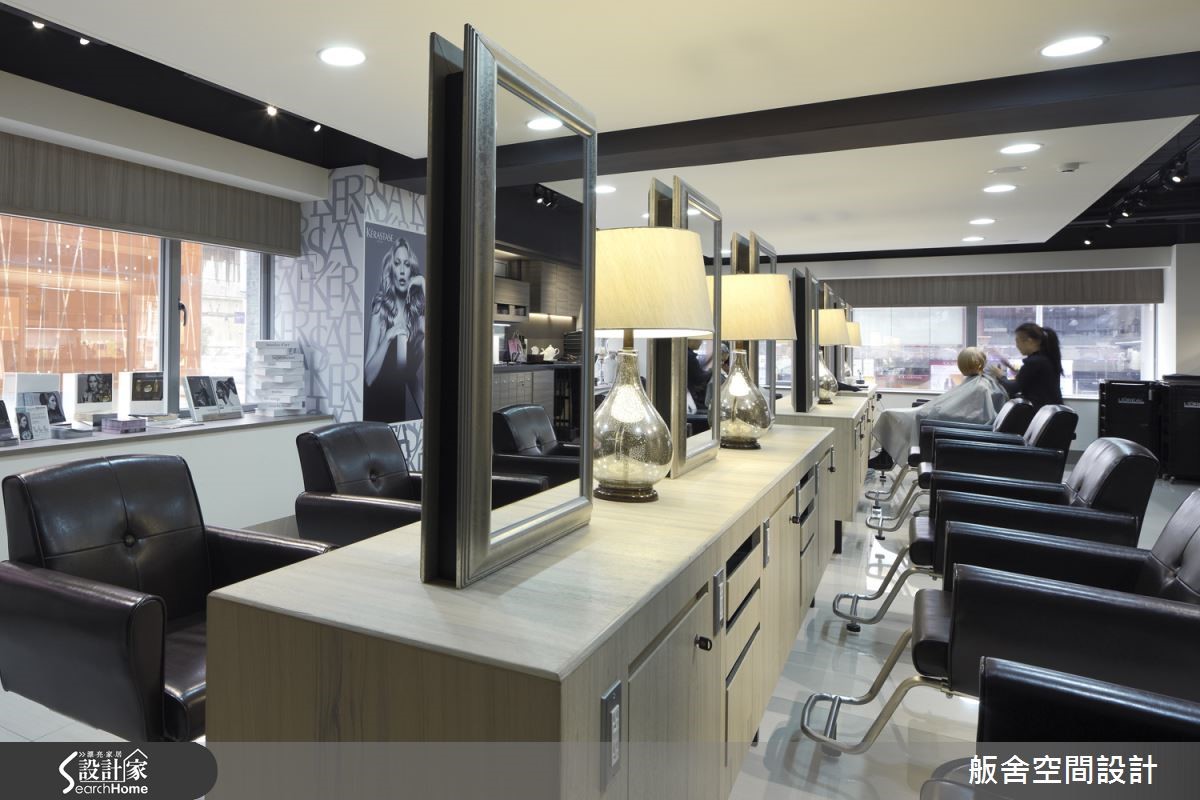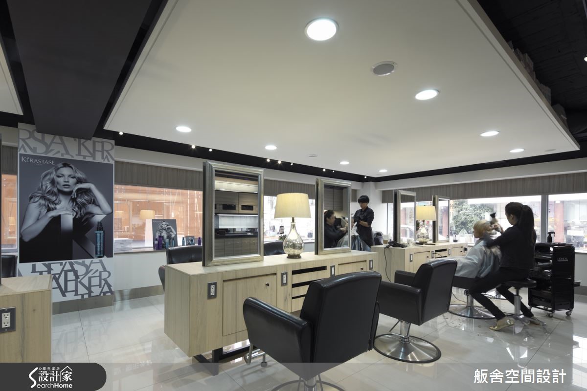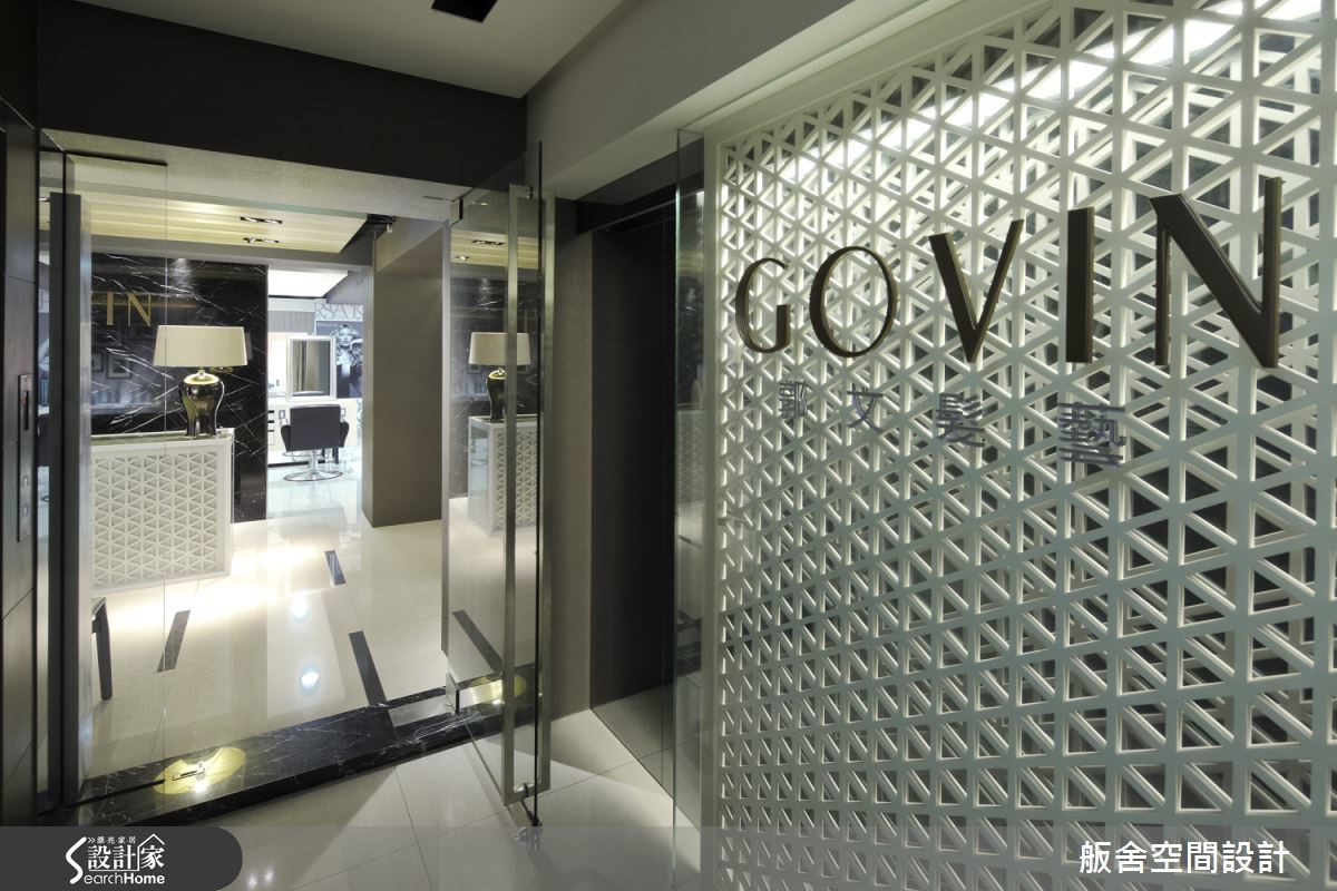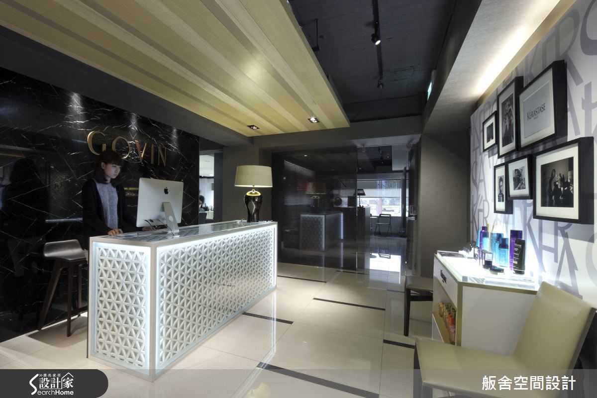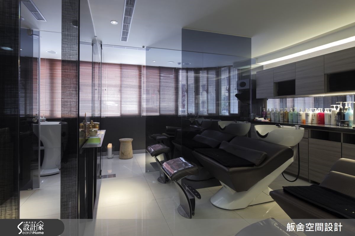 182平米的发廊在室内设计师的规划下,以东方文化概念为发想,西方场域精神为架构,完美融合时尚感与禅意。除了具备潮流元素,更充满有如商旅空间般的惬意情境! 【精致门面设计,营造精品印象】大门入口墙面,设计师采用白色几何元素密集排列,与柜台造型互相呼应,衍生出具东方感的图腾画面,柜台后方则铺述深色天然石材,衬托金色品牌字样,彰显气势与优雅的印象。空间整体以浅色基底结合局部黑色点缀,佐以木质挹注少许温润,营造低调休闲氛围;在造型区将收纳机能隐于桌体之内,细心体贴顾客的置物需求。冲洗区则透过深色镜面的铺排,藉由材质倒影空间虚像,衍伸视觉朦胧感,让人可在此仰躺着获得身心上的全然放松!