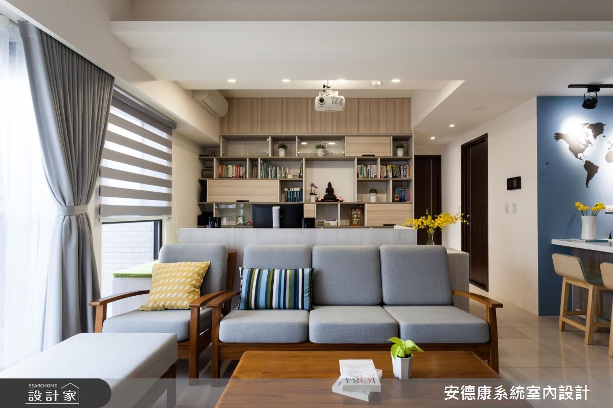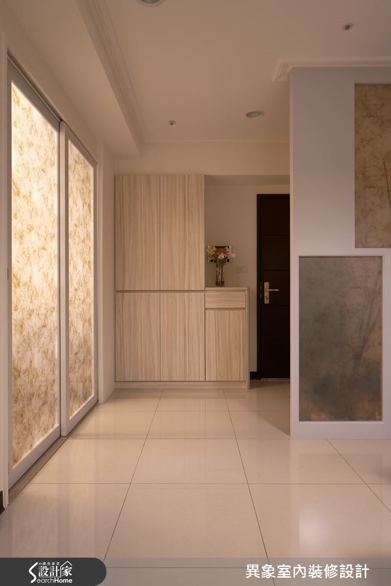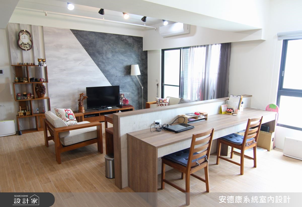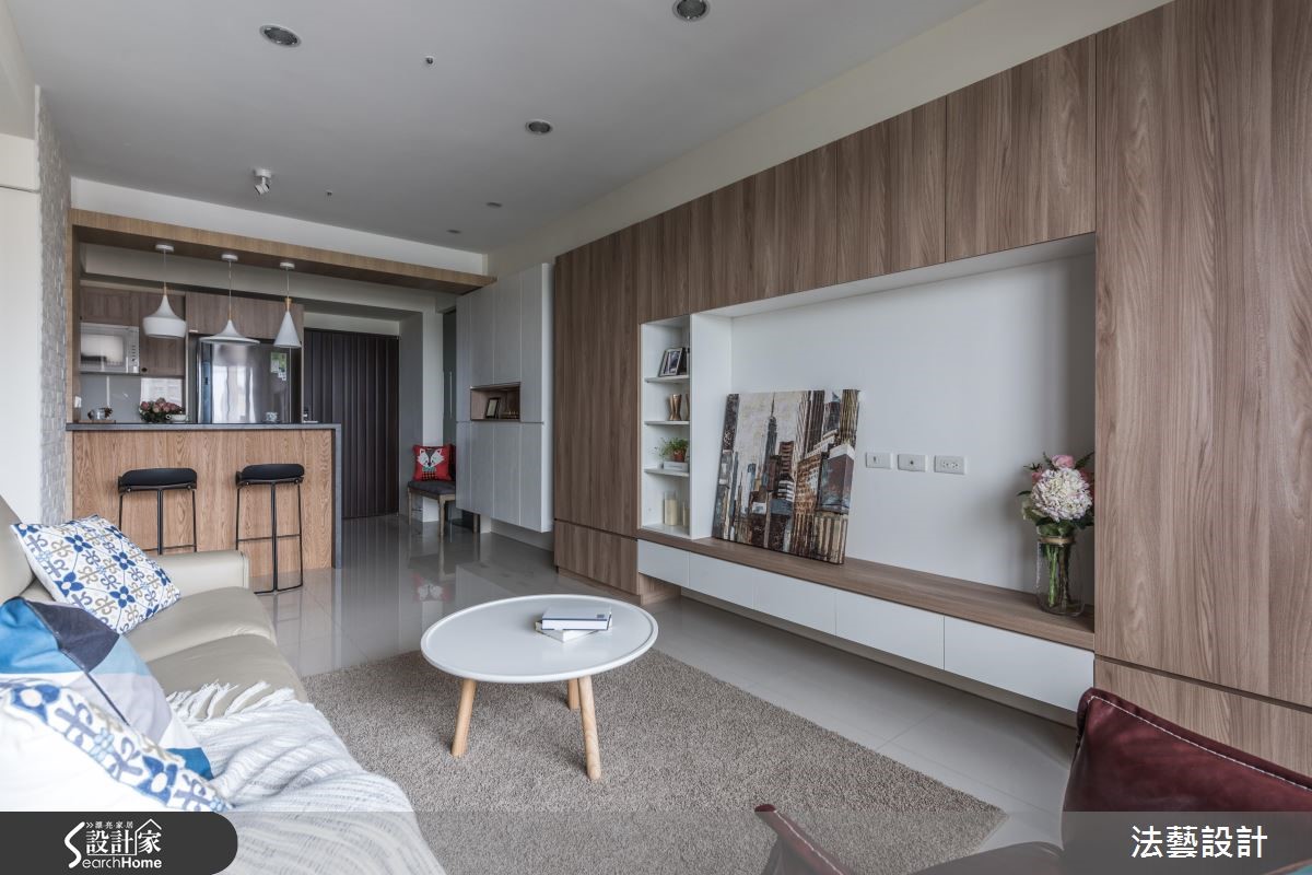79平方米居宅透过隔断调整,规划为两室两厅。同时统一动线,行走更便利流畅。为符合低装修预算,不大动格局,巧妙透过电路工程的调整及灯具光源变化配置上,让屋主坐享现代质感空间。【简洁设计,造俐落视觉】玄关入口规划系统柜体,注入实用收纳机能,并做出木作屏风,与客厅形成界定。公领域则采大面积木纹砖铺贴墙面,以细腻自然的视觉主墙串联客、餐厅。搭配简洁的白色沙发、深咖啡色家具与门片,显得婉转具层次,并采吊柜、抽拉柜结合成电视柜,赋予高机能收纳。设计师特别规划多功能起居室,做出可弹性开放的茶房兼客房、更衣间,门片采双推拉门通透设计,开启或关闭都充满视觉穿透感。主卧则呈现简约雅致的风貌,于床头旁配置白色活动式梳妆台,替空间增添温馨与现代感。