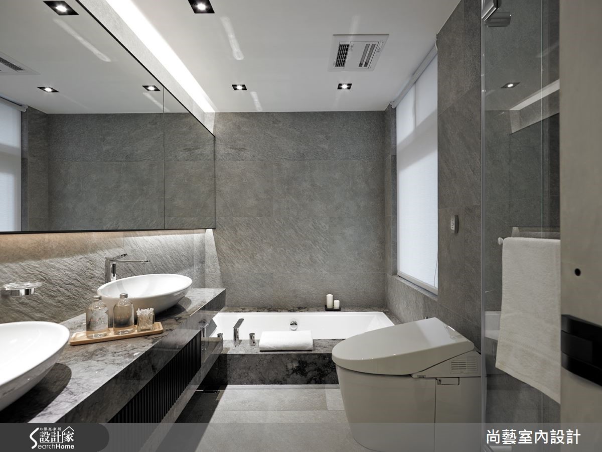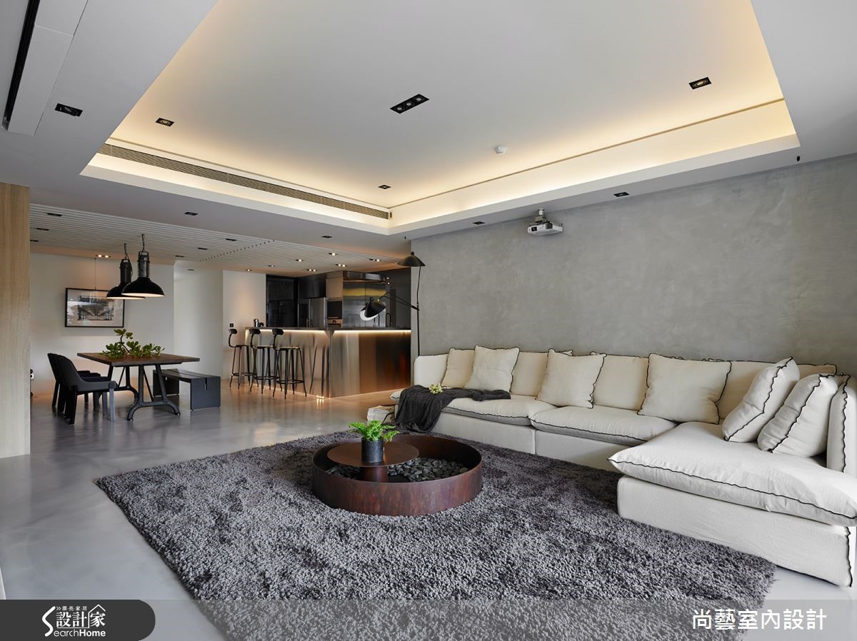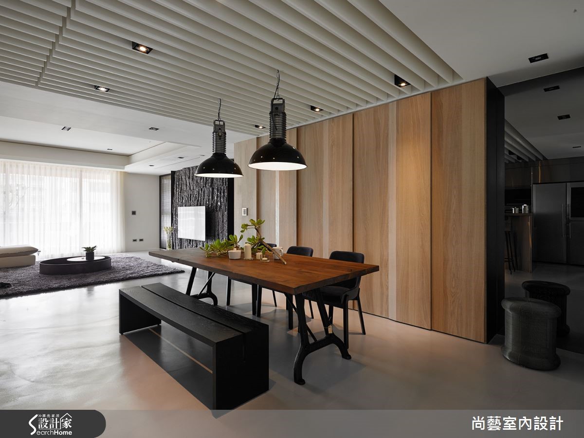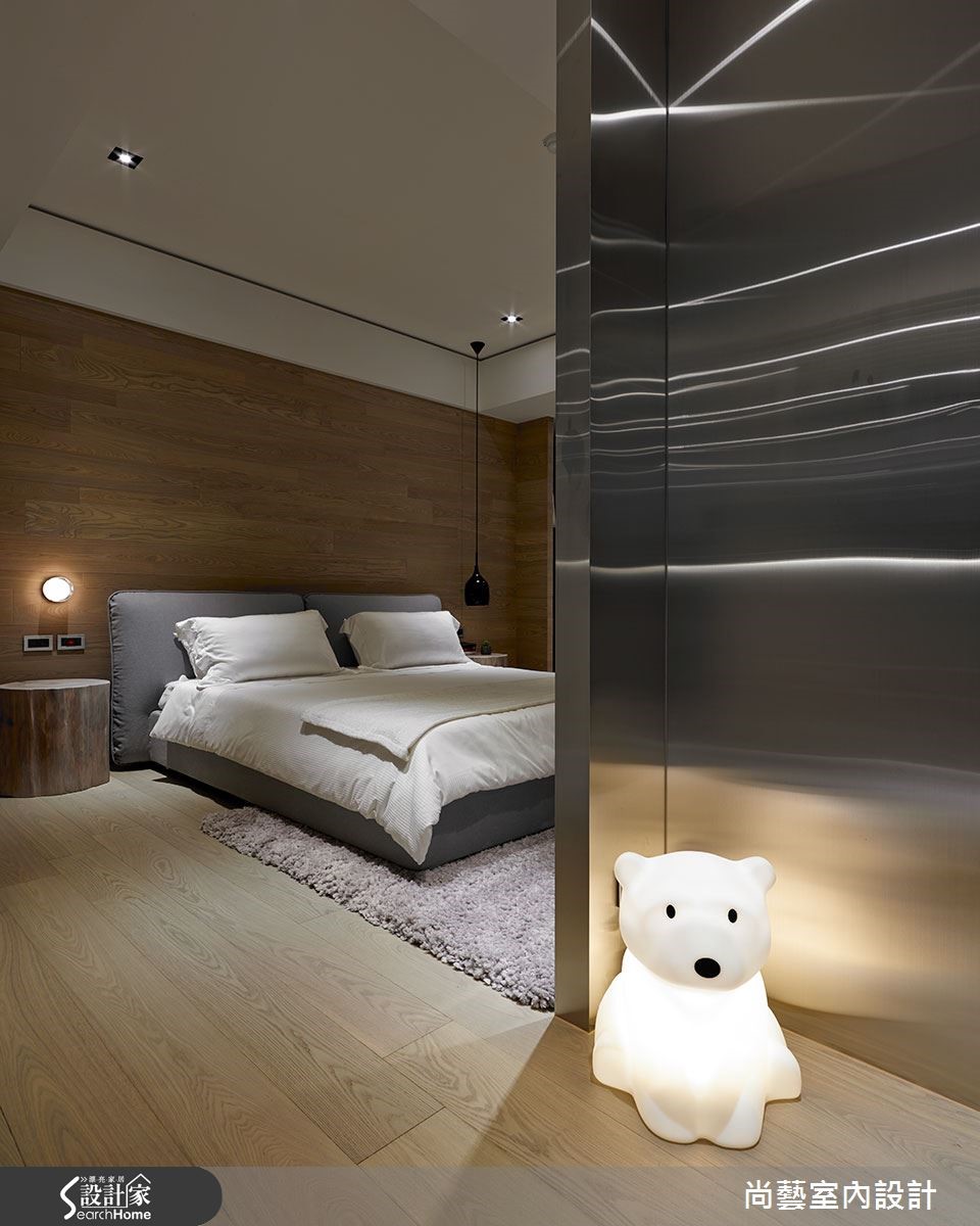 从事服装设计业的屋主,对于居家空间规画有着独到的见解。设计师使用大量特殊石材与不锈钢,为兼具采光、通风两者优势的大宅,打造满盈原始氛围的自然休闲感,令人彷佛置身德国黑森林。 【不锈钢搭木地板,平衡空间温度】玄关采用皇家银钻石材,呈现天然纹理。而客厅则是利用石皮造型电视墙,打造直向的视觉层次,宛若置身大自然,营造全然休闲感。整体空间着重家具家饰规划,客厅搭配铁件鹅卵石桌几,呼应自然气息。更考虑因屋主饲养猫咪,沙发与家装皆采用防抓材质。餐厅运用充满温润的木色质调,而后方厨房以不锈钢材质与底部黑镜打造现代摩登感,以一刚一柔的材质表达冲突美感,并以天花的流线格栅串连视觉。吧台下方的间接照明柔化不锈钢的坚硬,提升和谐度。主卧以木地板与不锈钢墙面相结合,打造罕见的睡眠空间,更在窗边结合书房功能,让阳光与木皮营造静谧的一方小天地。卫浴则以大量石材打造,让自然休闲感在全室蔓延。