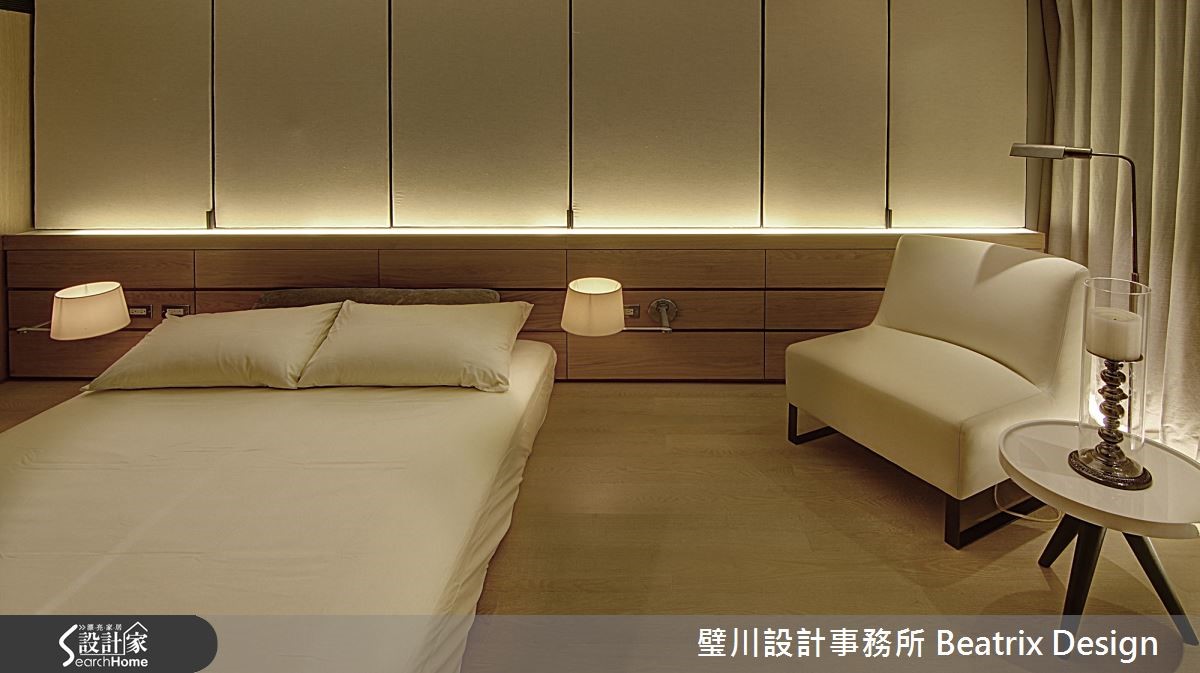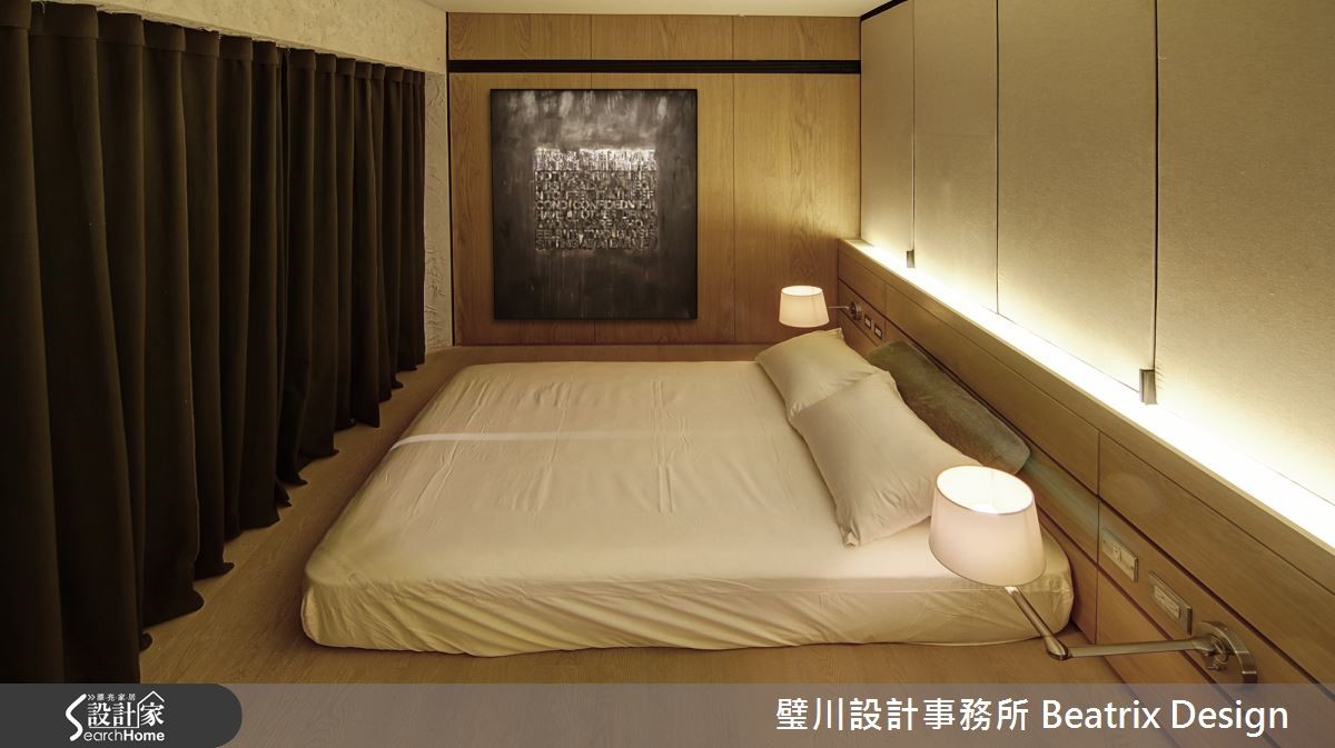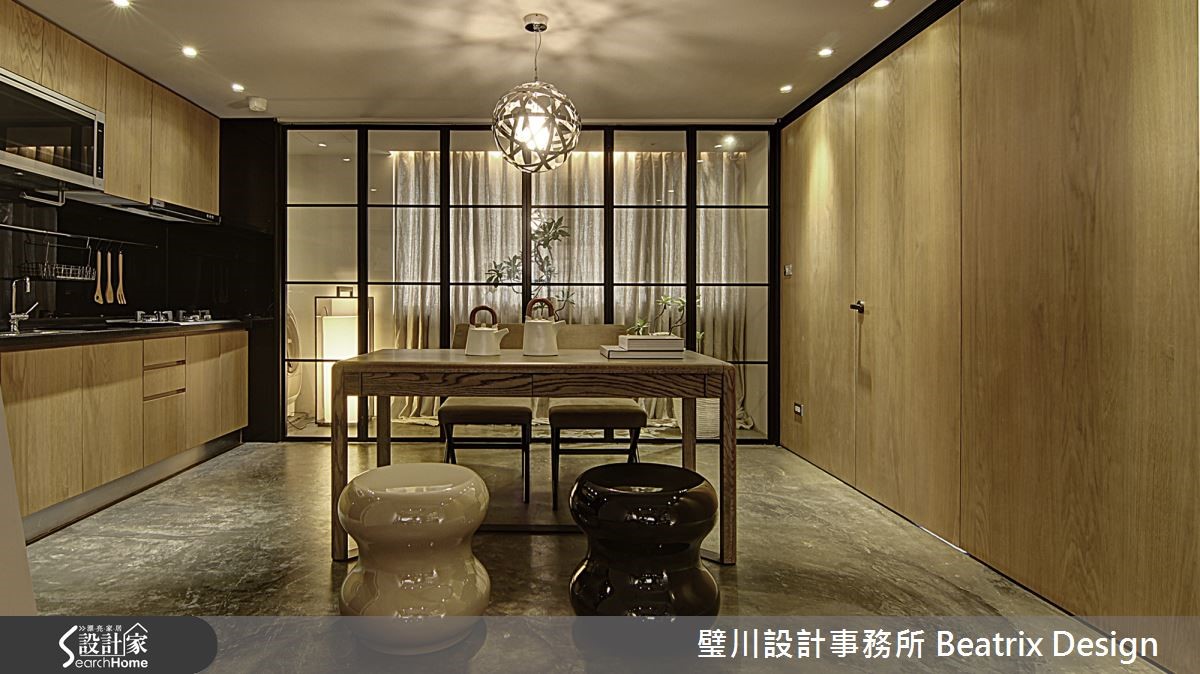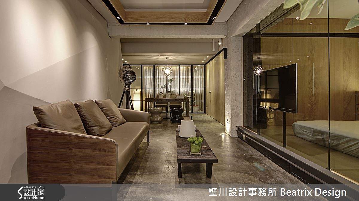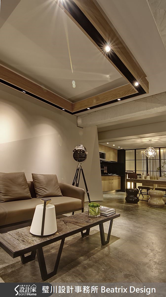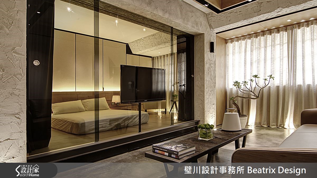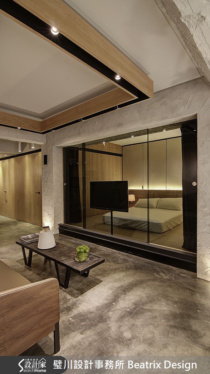 屋龄30年的老公寓改装,解决漏水问题,采用通透隔断赋予自由流畅的生活意涵,裸露的天花配置精致的灯盒槽,让粗犷的水泥质触与光影交融时,轻轻抚上一层微醺光泽,即使是予人豪迈印象的Loft风,也能呈现细腻的精品质感。【开放与穿透设计,达到扩容效果】删去繁复的动线规划,仅以玻璃折门与布帘加以弹性区隔,利用开放式空间连接阳台、餐厅与客厅,将视觉全然解放,推开餐厅旁的格子玻璃门与帘幕,新鲜的自然气息由落地阳台向室内流动,便能迎接阳光与微风。卧室以玻璃拉门与客厅相对,大胆地采用穿透式设计,让整体空间更形扩大,拉上落地帘帷即可保留私密领域的隐私性,调和清爽木质元素,形构静谧舒适的独立空间。