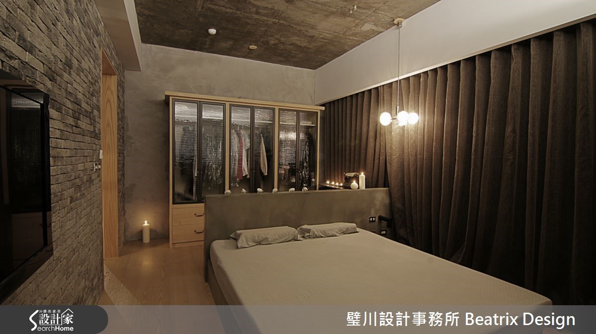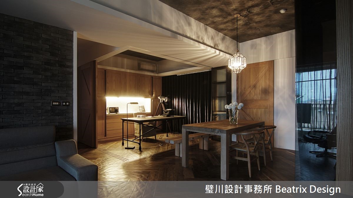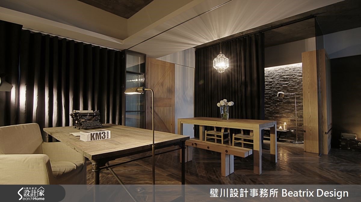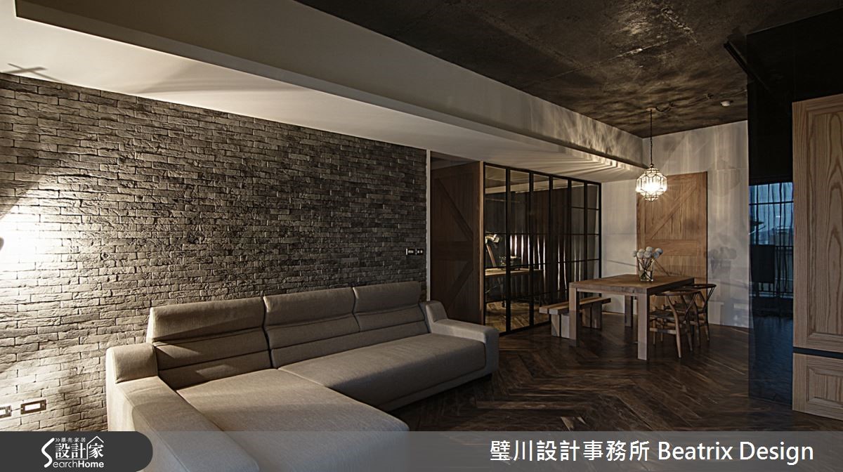 设计师以"不假修饰"的原则,将居家概念回归纯粹本质,透过水泥粉光、木材、石材与铁件等元素,打造粗犷原始的Loft风格,在灯饰与线板等细节增添女主人钟爱的新古典元素与艺术创作,将自然纹理与细腻精神完美融合。【空间回归本质,打造宽敞天地】设计师重整格局后,将客、餐厅及书房改为开放式空间,简约大方的直觉动线,打造专属一家三口的宽敞小天地。间接与单点照明的温润黄光为窑烧石砖墙与水泥粉光天花等冷调元素注入暖感平衡,人字型木地板则更添优雅质感。开放式空间利用推拉式玻璃隔屏与麻质布幔,作出多功能区隔,隐私与层次兼具。主卧内部元素延续公共领域风格,别出心裁以水泥粉光作为床头,衣柜以简约线板装饰,佐以玻璃木质,颇有古典优雅氛围。