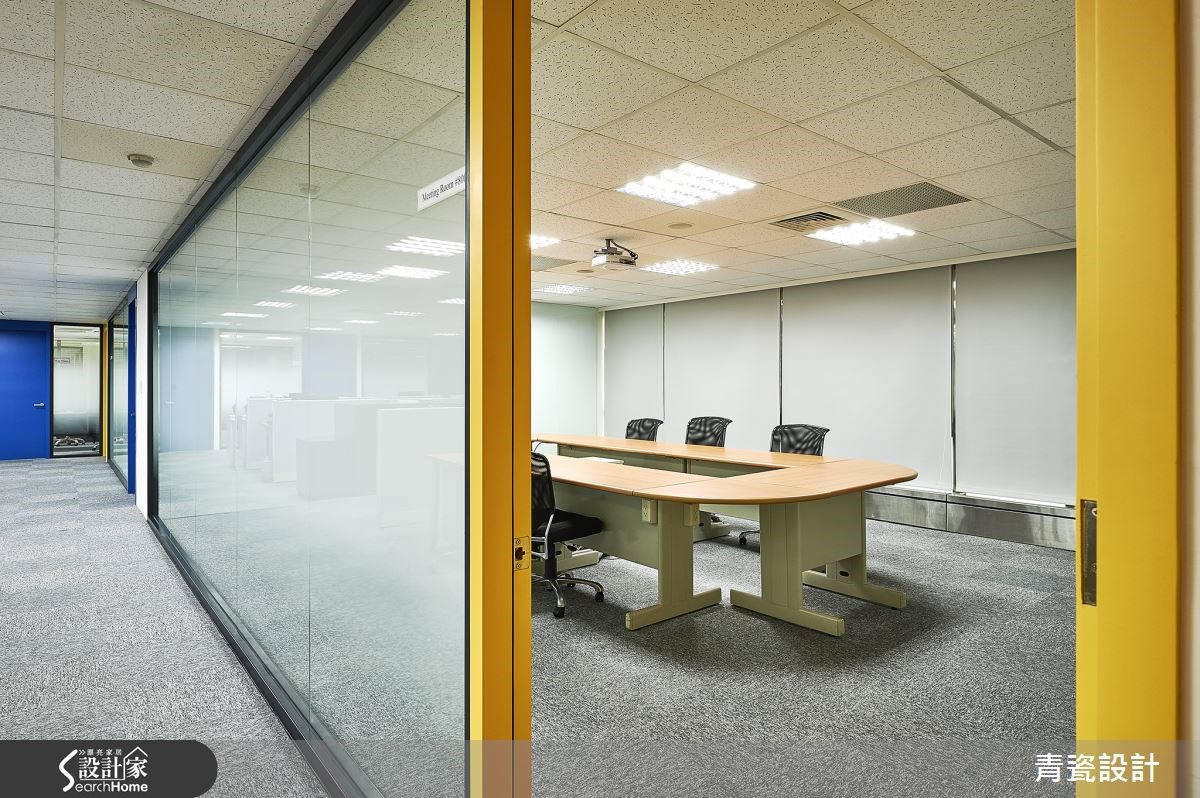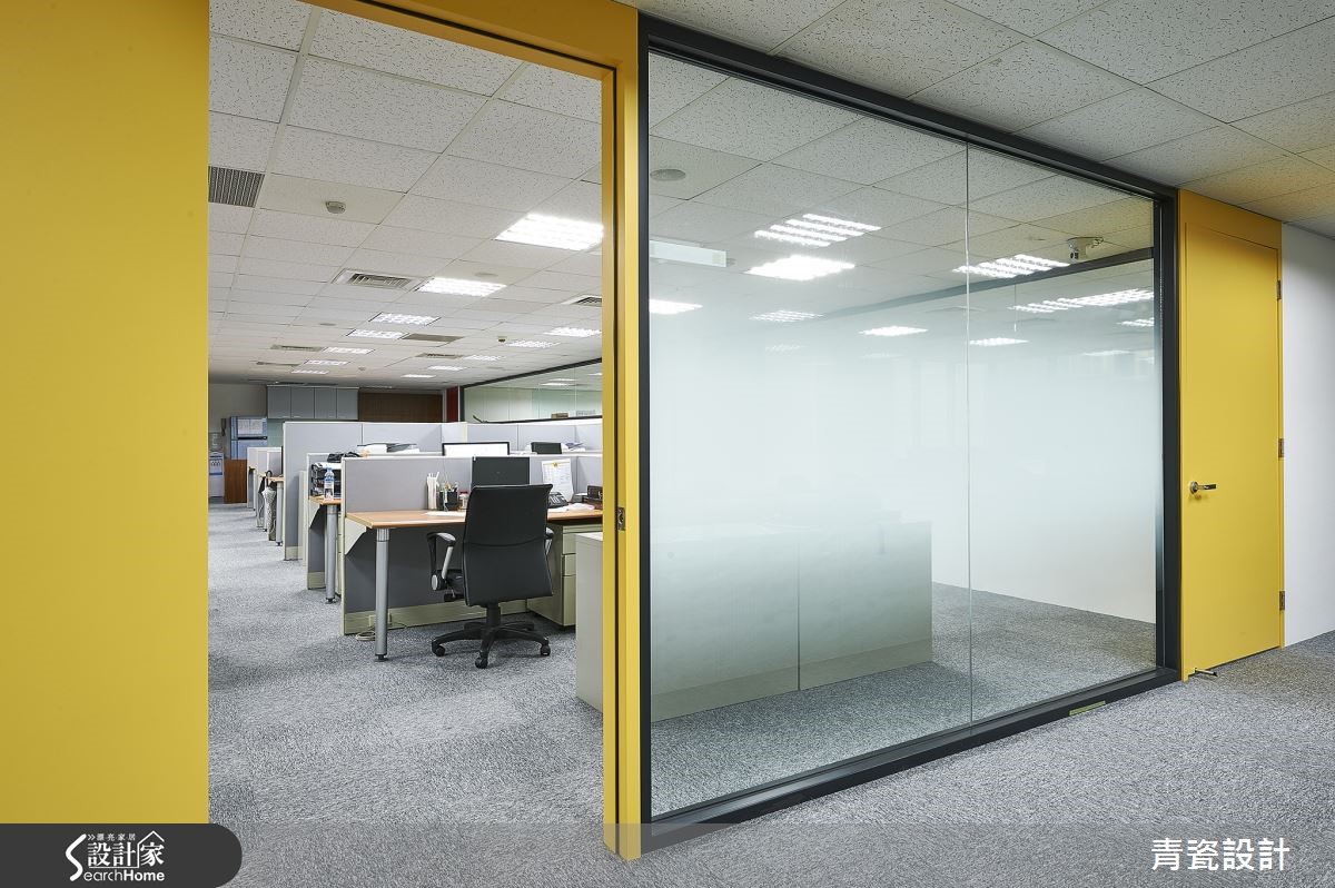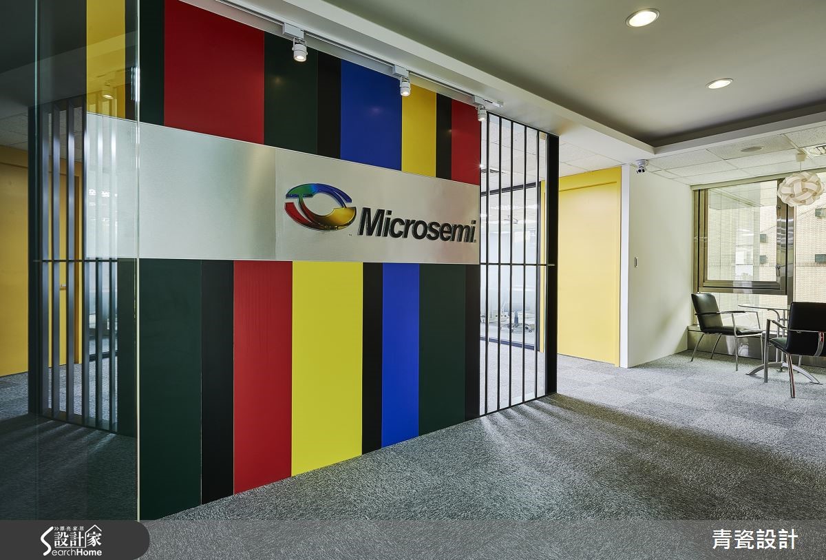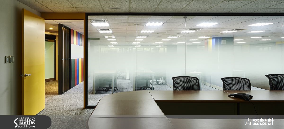 为了转换科技公司的冰冷感,设计师别出心裁地参考公司企业识别系统,抓出红、绿、黄、蓝等四种重点色彩。运用色彩元素替办公空间注入活泼视觉,并达到纾解疲惫与忙碌的效果。 【鲜艳色彩,激发空间活力】设计师让大门方位右转约30度,并让LOGO主墙加入红、绿、黄、蓝四色。来访者可感受到活泼的企业形象,更透过色彩拓宽墙面,与一旁接待区形成延伸画面。同时于墙面加入木格栅屏风,形成内外视野的通透串联。而这四种颜色分别代表着"生命活力、平衡协调、智慧幽默、理性沟通"等涵义,像是充满智能能量的黄色会议室、沉着理性的蓝色主管室等,都在设计师的色彩调度之中,彰显出不同的空间特质。办公室内则延续彩虹色块的拼接,员工在工作疲惫时可感受轻松的色彩氛围。同时考虑到动线便利,吧台区规划于彩虹主墙右侧,方便员工的茶水供应。而为了保有三面采光的优势,会议室、实验室采用玻璃隔断引入光源,中段喷砂处理,达到恰到好处的视觉掩映。