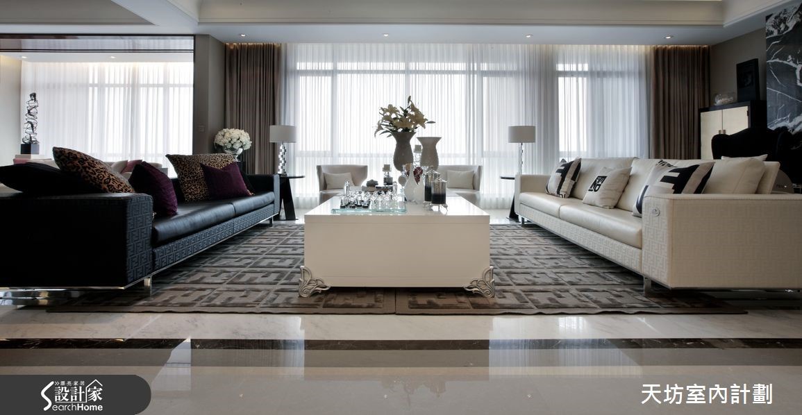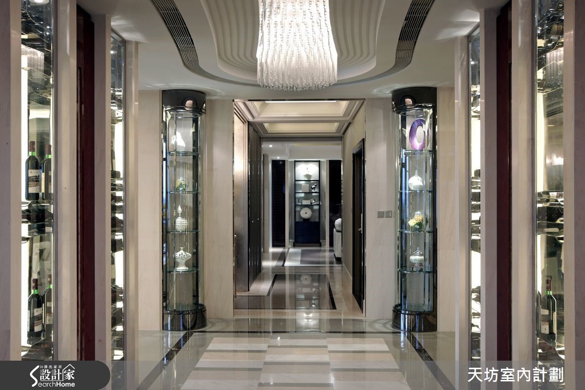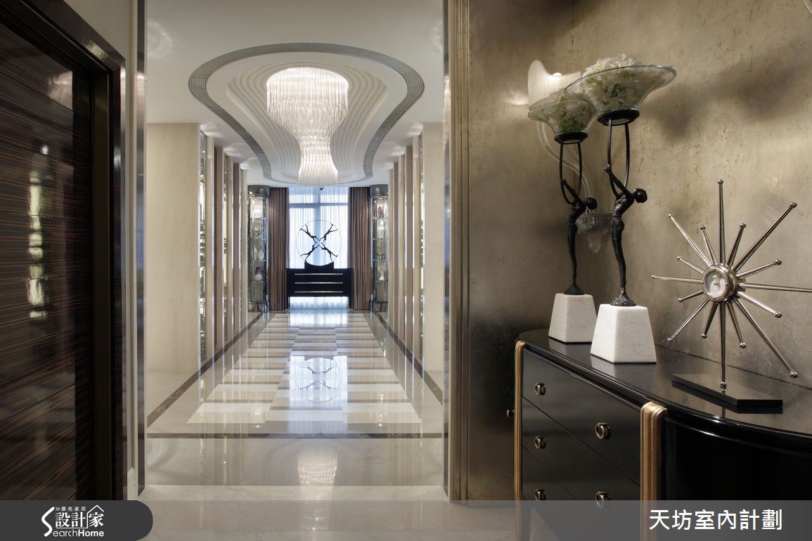 本案定位在跨国界的豪宅,空间融合西方建筑的高科技,并结合东方美学特色,以设计手法将东西方贵族对家居文化的追求和精神向往,汇聚于一体。同时注入丰富机能,满足各种功能需要,彰显当代生活时尚。【以气派廊道强调深度和广度】空间中规划气派的过厅廊道,形成唯美的景深,达到无法一眼望穿厅区的效果。会客厅结合演奏厅、休憩区、品酒区与会客厅,让空间轮廓转折中富有雕塑感,并配置落地玻璃采光。餐厅加入壁砖、水晶灯,再融合铁艺、玻璃和几何线性切割,创造独树一格的古典风情。主卧单独配备男女主人的更衣、洗浴领域,并根据男女主人不同的使用要求,让空间彼此分属,给予附设专属书房、大型化妆间等。并扩大卧室、更衣、淋浴房的比例分配,赋予奢华的生活想象。