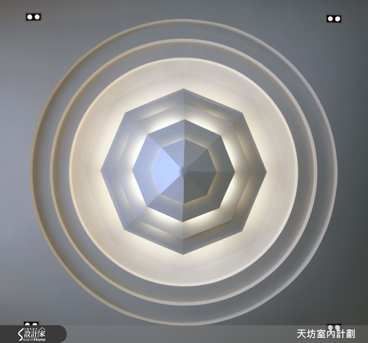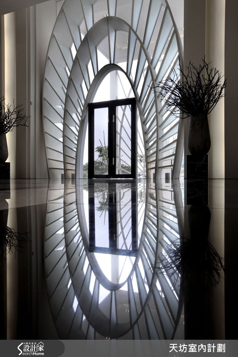 奢华空间是一首巴哈的协奏曲。在此现代风接待中心里,以空间光影代替乐谱,而动线转折与空间过渡则是旋转的韵律,且让材质接口化为弦乐,在高低起伏的奏鸣中,打造出磅礴乐章,成就有情感且动人的空间。【音乐旋律具体化,展现建案深度】在本案设计中,融入了音乐的创作旋律概念,在接待中心的外墙上,以纯美的白作为主色调,呼应未来建筑的设计特色,奠定了接待中心清雅悠扬的基调。而接待外厅则做为建物门面,加入层层放射的半椭圆型元素,远观看去像太阳从地平面升起,放射出夺目的光芒。门厅入口同样采用该造型,前后双层通透设计,增加了空间的深邃效果,让光影在其间自由流转,展现出磅礡的气势。门厅入口在细部做了三叠式展翼设计,背隐灯光,强化了建筑立面的层次感。