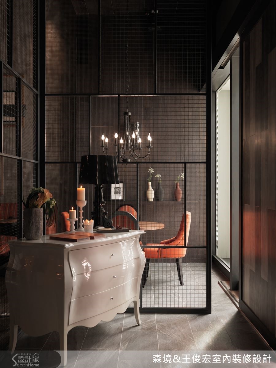 门口的接待区向来是商业空间的入门印象,也是分隔室内和室外的过渡地带。因此特别选用铁件隔屏区隔,让视线穿透的同时,冷硬的金属感也流露粗犷的风格,搭配典雅的古典斗柜和软件,点出古典与工业风格的冲突美。