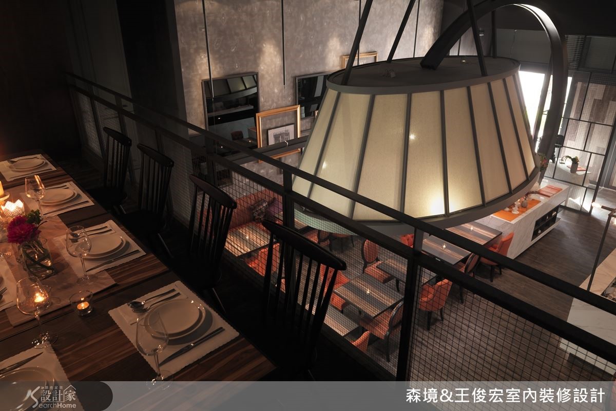 想让用餐体验更舒适,开阔的设计就不可少。两层楼高的空间特地维持原有的挑高优势,不另做吊顶,仅用铁艺巧妙遮掩空调管线,展现高大上的氛围。同时巨大的铁艺灯饰和铁件隔屏,也打造冷硬的工业风格调。