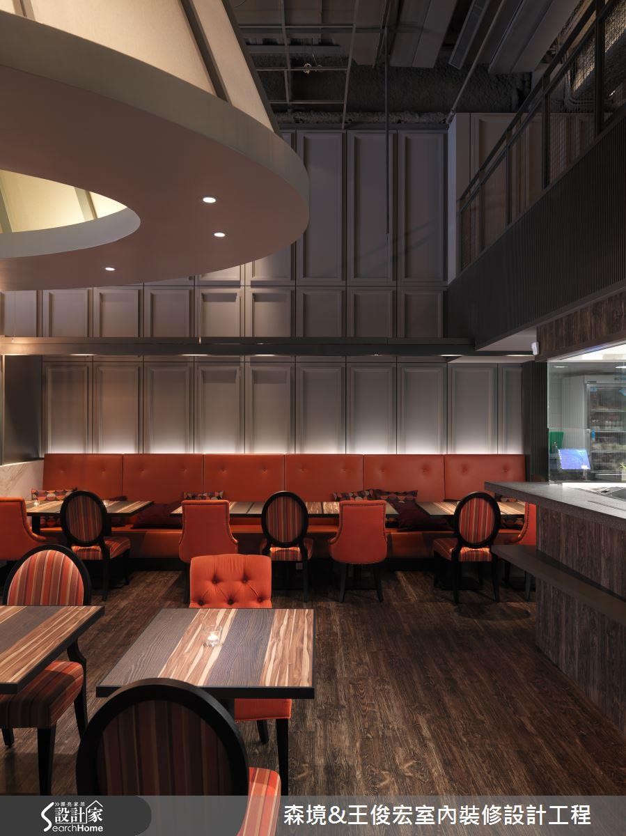 挑高的壁面铺满古典线板,自带贵气的墙面宛若宫廷般的精致典雅,搭配橘红色的沙发、餐椅,亮丽的色系更显缤纷热情,也能增进食欲,特别适合餐厅使用。出奇制胜的设计,打造让人啧啧称奇的商业空间。