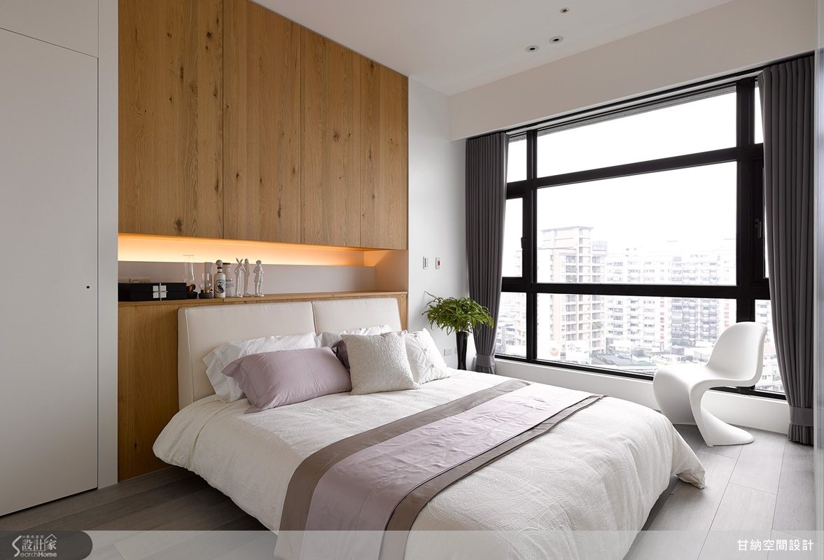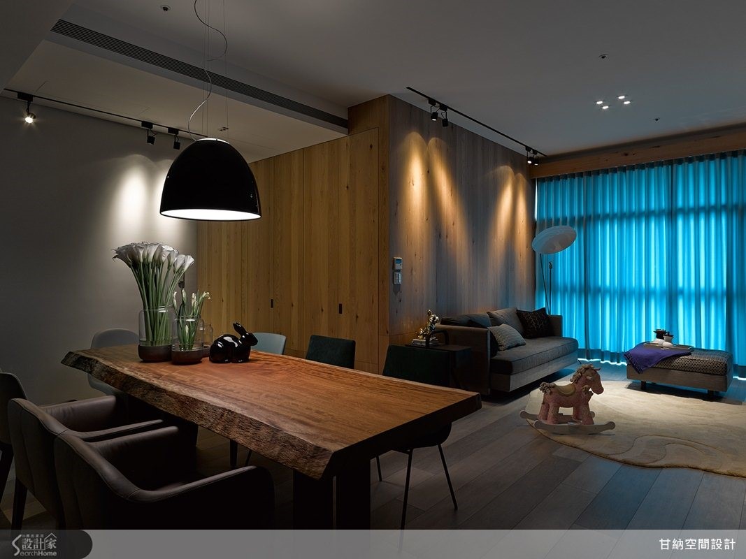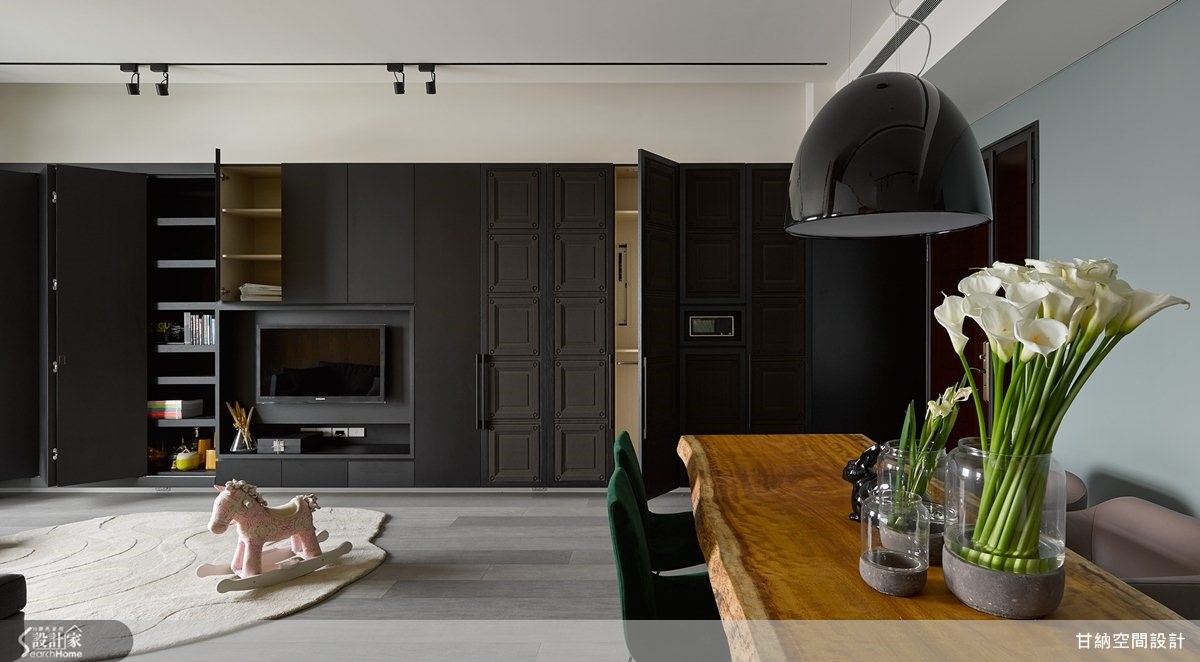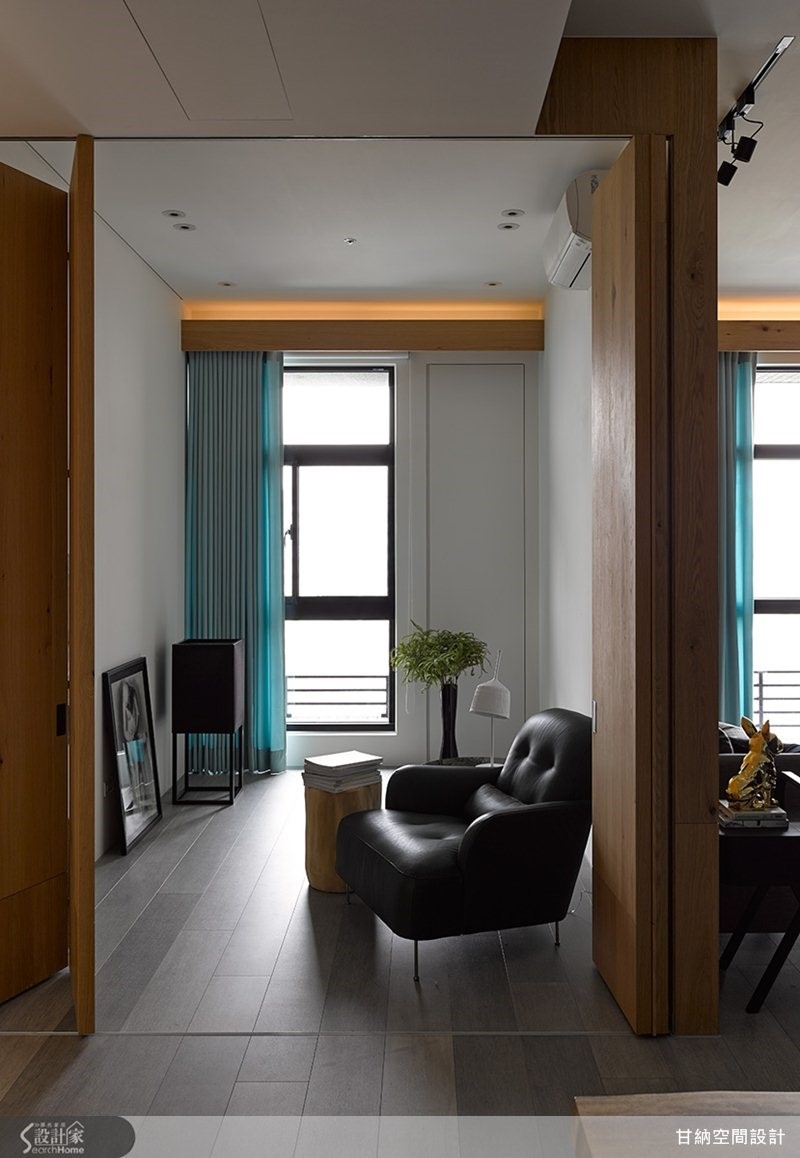 在不变动格局的情况下,设计师顺着空间轮廓与条件,从居住的舒适度来调整,以材质、色彩做表现,为简单小家庭描绘家的风格味道,快跟着小编一起走进来看看吧! 【电视墙面整合收纳机能】整体格局上,将紧邻客厅的餐厅、玄关整并为一大公共区域,透过开放式设定,让动线不受拘束同时富有秩序感;并让客厅电视墙柜体延伸结合鞋柜、收纳柜与书柜,柜面以黑板漆、壁纸做铺陈,且适度加入折迭门元素,为简约利落的居家带来深邃美感。【回归宁静的色彩布局】客厅背墙则使用橡木壁材,保留天然木作原色纹理,创造不一样的视觉感观;餐厅陈列了原木长桌,搭配深浅绿色的造型座椅,增添空间用色的活泼性;主卧舍弃过多色彩,床头加入温暖木皮纹理相映纯白衣柜,赋予居者可真正放松的休息场域!