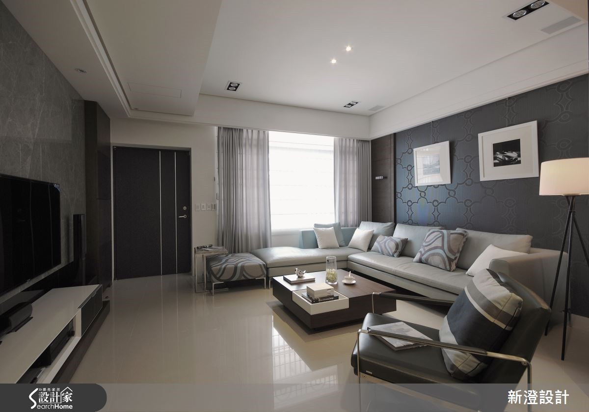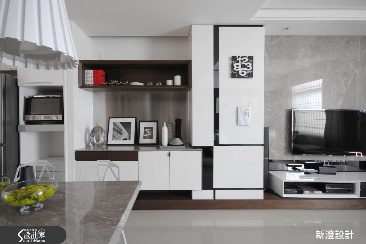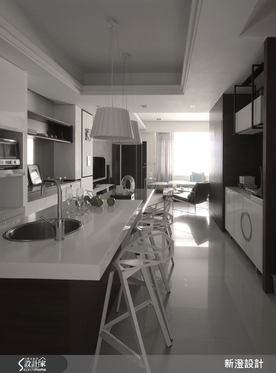 172平方米的别墅,在设计师规画之下,以现代风为底调,给予空间适切的视觉留白,并采用造型利落、色调清爽的软件妆点,减少复杂的生活脉络,还原轻盈的空间本质。【开放式布局,厅区共享明亮采光】整体以开放空间做布局,使客厅、餐厅、厨房共享采光,连贯流畅的生活动线;客厅电视墙采以天然石材打造,沙发墙则铺贴黑色花纹墙贴,在深色背景之下,更加烘托浅蓝沙发的轻盈姿态,再搭配立灯、挂画妆点,勾勒出悠闲时尚的生活况味。【简约白色调,塑造清爽收纳】以钢琴烤漆包覆电视墙旁的结构柱,加入挂钟装饰,形成客餐厅之间的过渡界定,同时连结整排柜体,加入白色调与不锈钢毛丝面钢板,挹注收纳与电器柜机能,建构清爽的餐厨环境;房间内则有别于公共空间的俐落感,透过大量的木建材使用,展露温润纾压的空间底蕴!