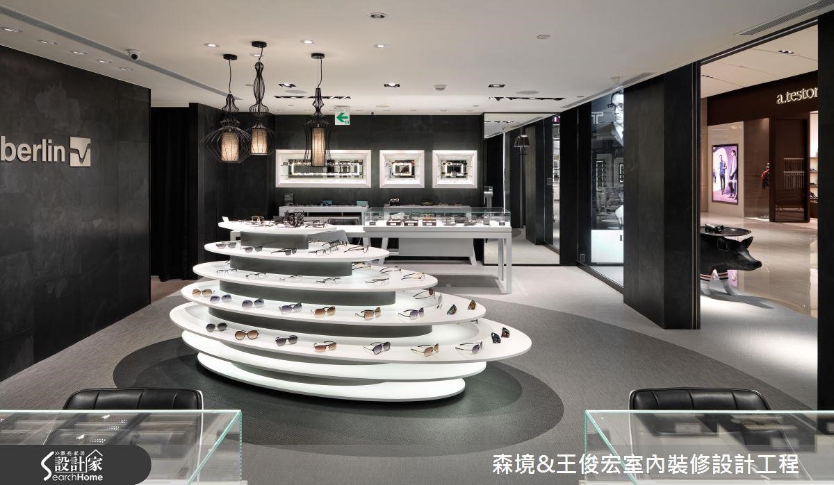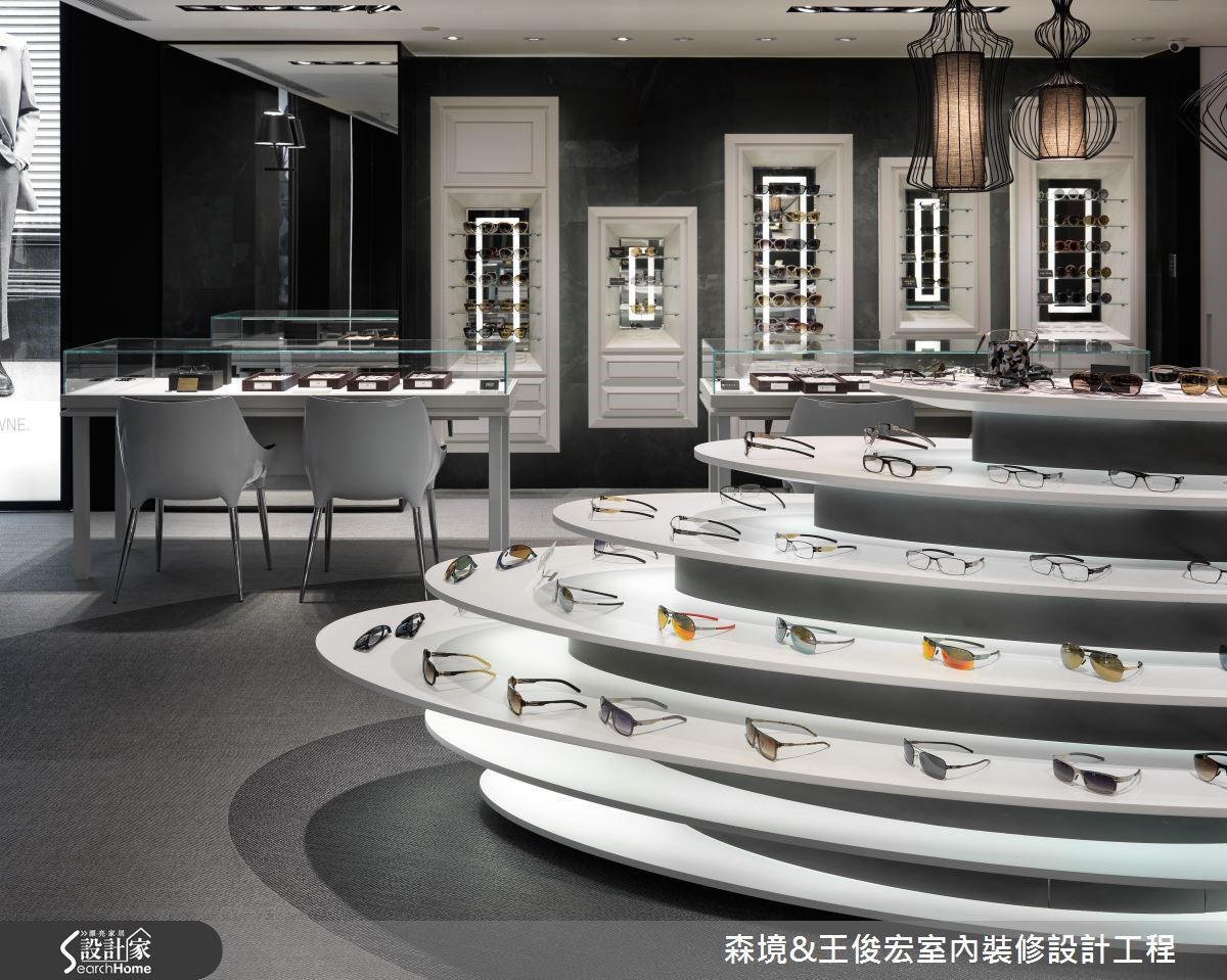 店家中总有一区要特别引人瞩目,就是能够吸引人流的主要展示区,主力商品都会放在此。因此主要展示区必须创造出趣味的话题性,同时也要符合品牌精神。像此案是一家眼镜品牌,主要展台就是以瞳孔扩散概念,创造出如同心圆般的设计。