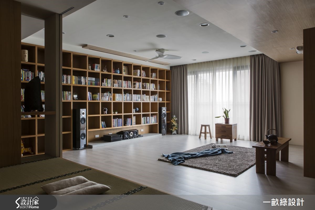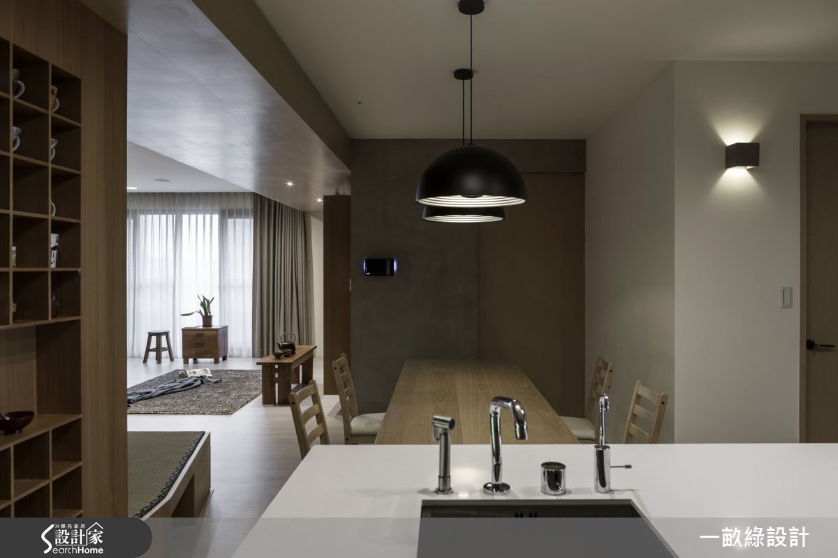132平米的住宅空间,在设计师重新布局之下,将餐厅扩大两倍,满足女主人的烹饪需求。为了满足屋主喜好阅读的习惯,配置壮观实用的整面书墙,开放的公共空间,亦能同时作为亲子的游戏场地。运用现代日式风格的营造,体现一家人对生活的美好想像。【开放设计,扩增孩子活动领域】在客厅中,设计师顺应着居宅梁体深度,规划一整面木作书墙。不仅巧妙消除梁体存在感,并运用柜体的大面积延伸,及木色的温润延续,形成舒适一致的和谐视觉。同时运用格局重塑,将既有卧室领域释出,让给餐桌与储藏室,再利用开放式规划导引光线,改变餐厨区的晦暗氛围。中央增设一座中岛,让女主人在尽情享受下厨乐趣之余,亦能够过开放的空间对话,家人互动更亲密。公领域一隅则将局部地板抬升,铺上和室榻榻米打造坐禅区,并在座榻下方暗藏收纳空间,孩子不仅多了活动空间,也能兼顾生活实用。客厅舍弃了制式的沙发,仅以矮几、地毯取代,不仅使空间感更为辽阔,更营造出贴地放松感。