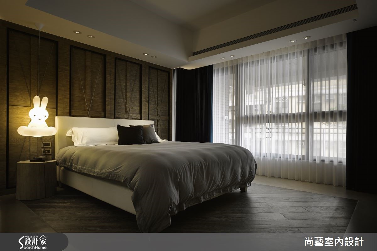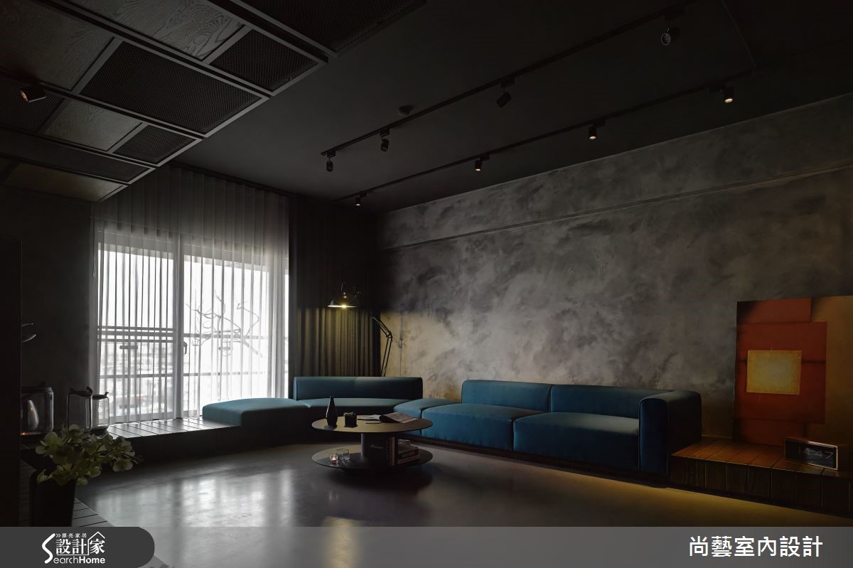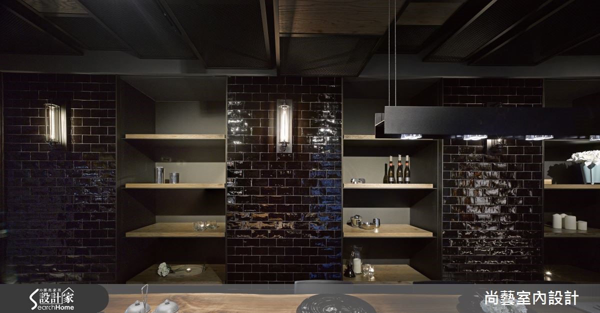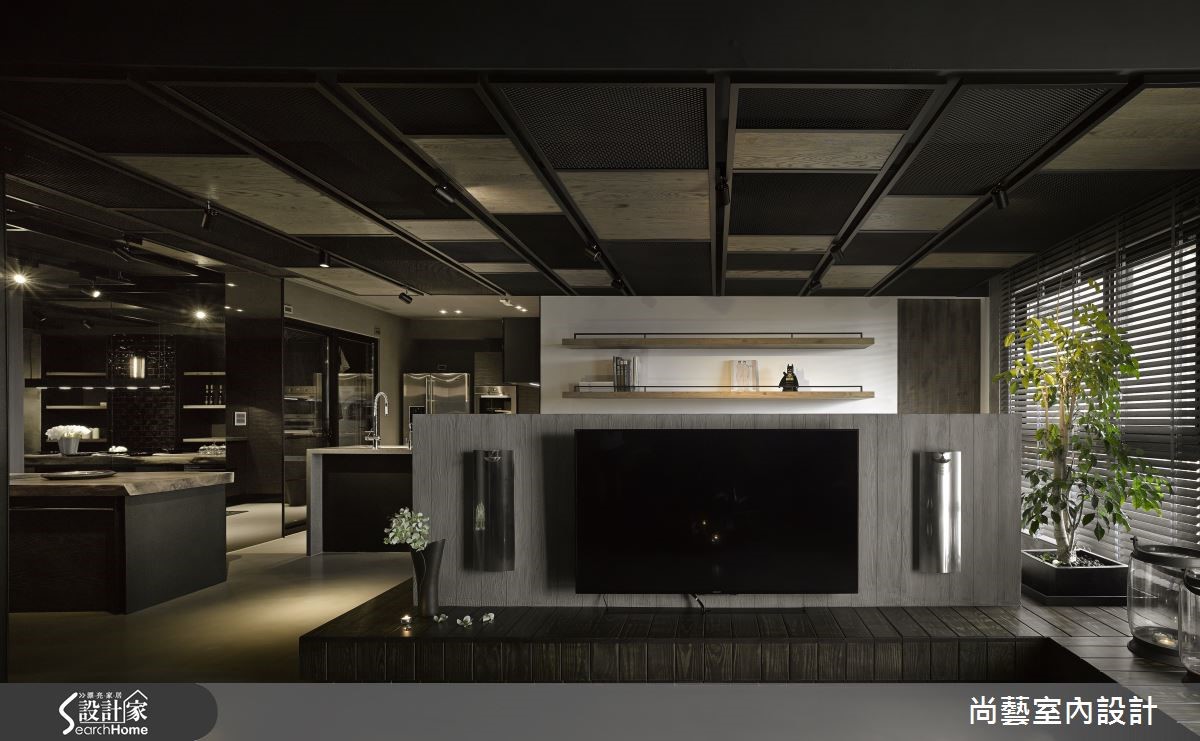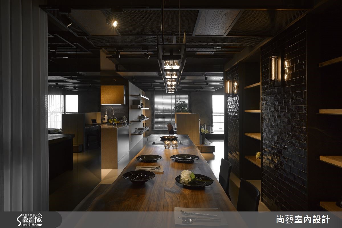 打破对住宅的既定意象,天花大胆选择铁件、铁网等素材,以条状方式排列延伸,利用高低起伏的律动造型定义公、私领域疆界。却又在材质上彼此串联,将粗犷、不修边幅的 Loft 意象再次升华,成就低调内敛的品味。【以木质基座延伸,区分公领域动线】整体规划上以餐厅做为中心点,狭长的空间以四米长的实木餐桌贯穿餐厅,兼具吧台、餐桌、烹饪、酒柜等功能,成为吸人眼球的品味设计。侧边墙面收纳柜以醇厚酒色壁砖装饰门片,同时也将粗大梁柱消弭于无形,加上壁灯渲染出复古层次的色调,营造彷佛在公爵古堡用餐的情境氛围。另一侧则使用镜面大幅延伸空间视感,形成对称和谐的效果。客厅沙发下方打造木质基座,并自窗边延伸至电视墙,同时也成为与阅览区域的自然界定,让开放式空间更加开阔。主卧室造型墙援引大量粗犷木纹,地坪也利用斜纹木地板与异材质拼接,打造个性魅力的私密领域。