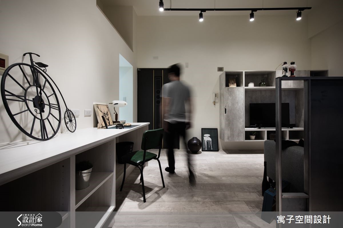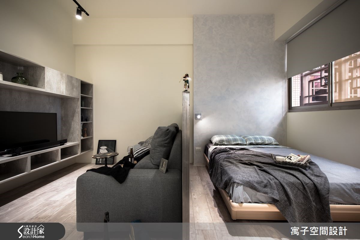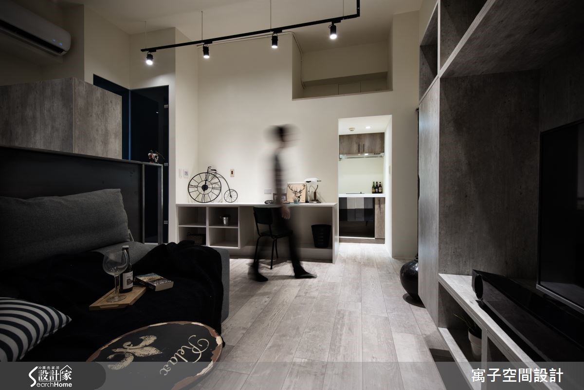 设计师在拥挤的都市精华地段中,为30平方米的老屋空间重新改造,利用灰白色调与木纹地板,呈现粗犷中带有清新的轻工业风格,为单身女屋主钟爱的工业风,做出更加细腻的诠释。【雾玻璃和灯光辅助,更添明亮】进门即以长型多功能柜体作为入门视觉,提供收纳与阅读等复合机能,并利用雾面玻璃巧妙援引光源,配合开放设计与单纯色调,进一步扩容空间。利用错落的灰白色块接壤与L型轨道照明,以不同的灯光角度,为每一道墙面与艺术装置打造光影表情。客厅与卧房之间以未上保护漆的铁件区隔,随时间的自然锈化,产生怀旧的复古气息。客厅电视吊柜以灰泥纹理质感的表面,与后方卧房墙面相互呼应。此外,设计师更利用系统柜规划独立厨,让机能更臻完备。