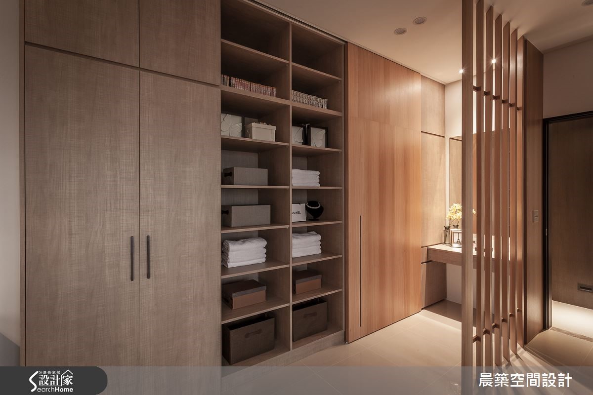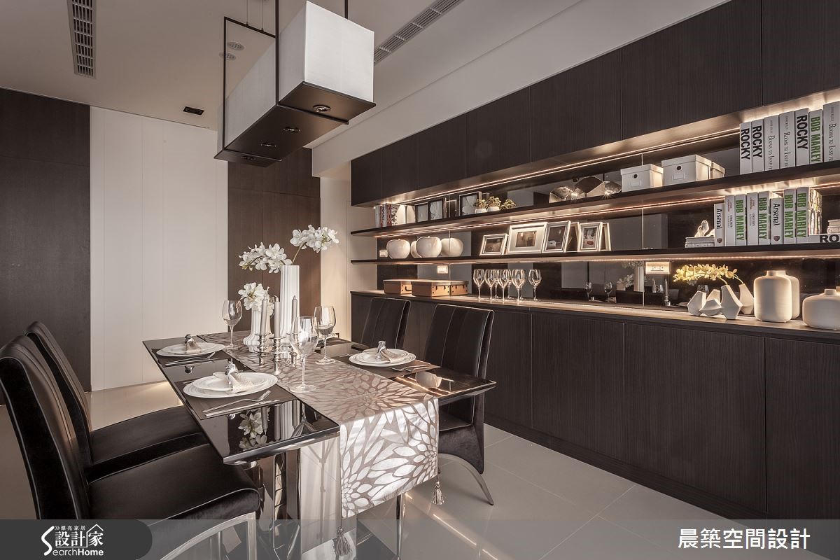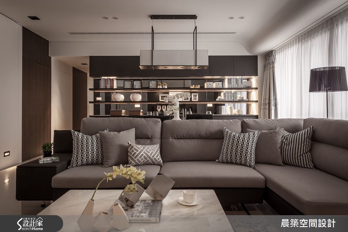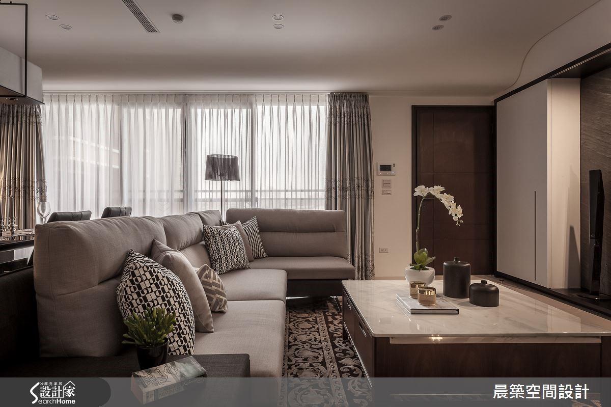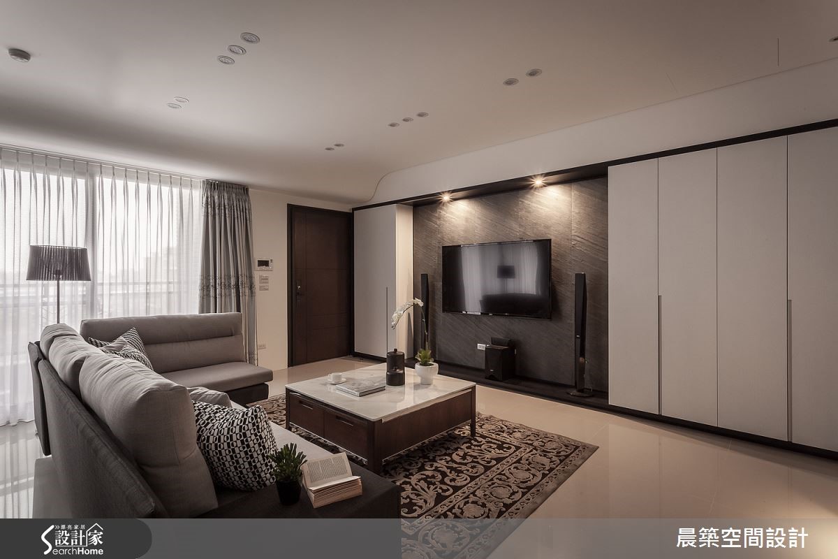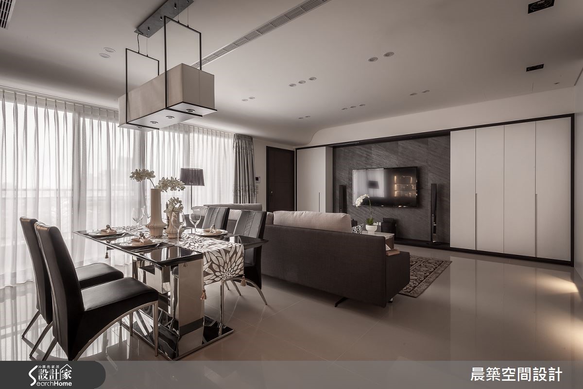 面对新家全新的动线与格局,要如何适应与融入呢?设计师在单层空间注入大量收纳机能,延续了屋主的生活习性,并利用灰阶基调,打造高雅的现代风格,让一家人开心入住。【简化空间线条,暗藏收纳机能】设计师为原先住在独栋楼、物品众多的屋主一家,设定了现代简约风格,除了让整体视觉简洁利落外,更纳入大量的收纳功能。由于大门位置与竣工图相差了 5 厘米,导致鞋柜深度不足,因此以不影响外观的情况下变更电视墙比例,巧妙解决问题。电视墙两侧皆有大面积柜体,满足收纳需求,并以纯白色调呈现,除了突显电视墙石材纹理外,更让视觉不显紊乱。宽敞的开放式客、餐厅空间依序排列,营造整洁的视觉层次。在家具的选择与布置上匠心独运,利用灰阶调和镜面材质,让整体空间高贵且优雅。