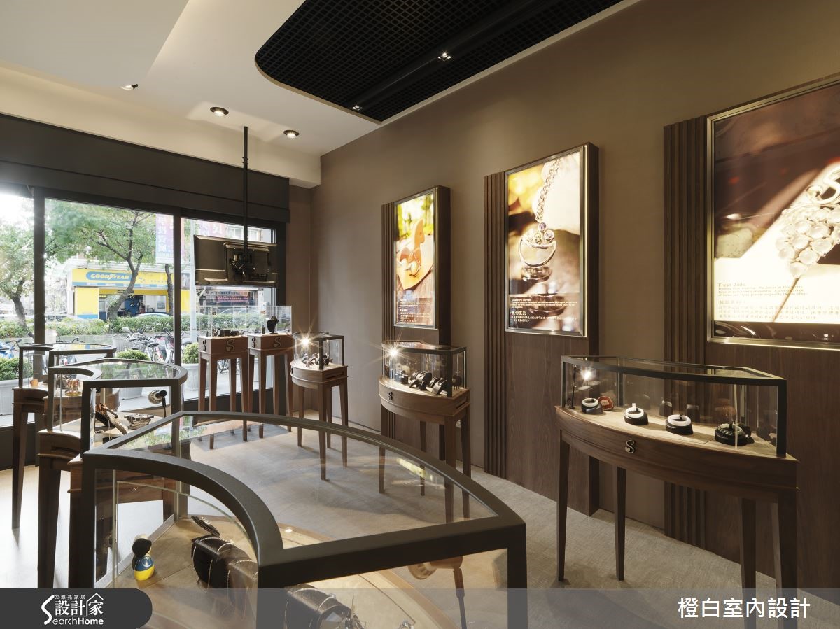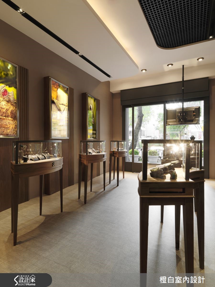 66平方米的原创设计珠宝店,一楼实体店面主要销售珠宝饰品,二楼则规划为 VIP室,整体以时尚高雅的风格定调,挹注清晰分明的展示动线,引领客人深入赏览饰品之美,快跟着小编一起走进去看看吧! 【古典展示柜形构动线与高雅情韵】建物外观以深色打底,透过灯光衬托招牌字样的立体流线,展现高雅形象。走进店内,墙面采以木作线条妆,加入海报广告牌与投射灯光,打造艺廊般的展示空间。同时,规划清晰的走廊动线,两侧陈列古典造型玻璃柜,天花则堆叠利落层次,黑白色调搭配嵌灯塑造时尚风情。楼梯于墙面规划内凹展示平台,搭配光带或投射灯源的低调点缀,使梯间充满赏心悦目的情调。二楼VIP室不同于一楼的起居规划形式,以皮沙发、木百叶等休闲元素,导入具隐私的闲适韵味,给予客人宾至如归的舒心感受。