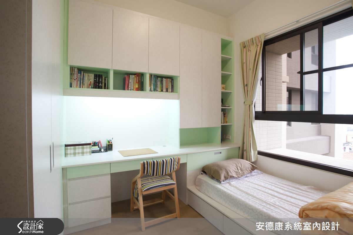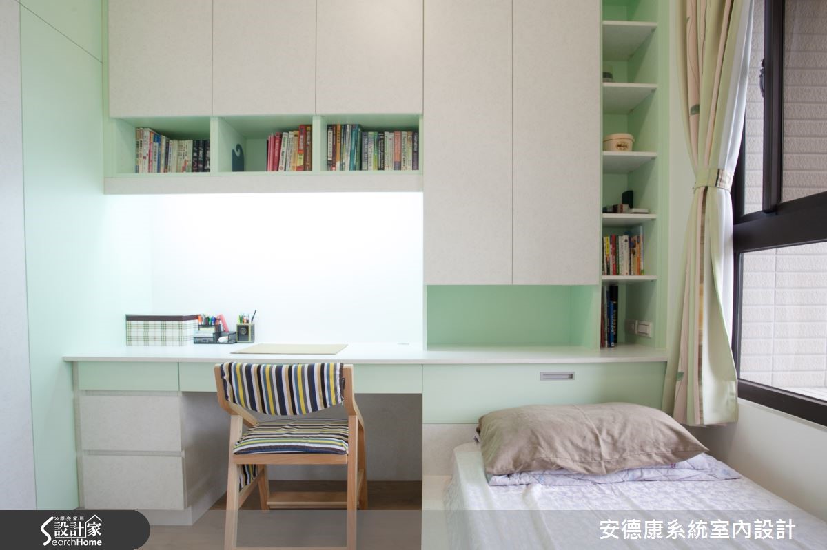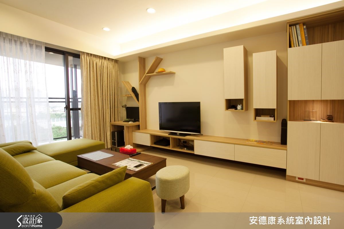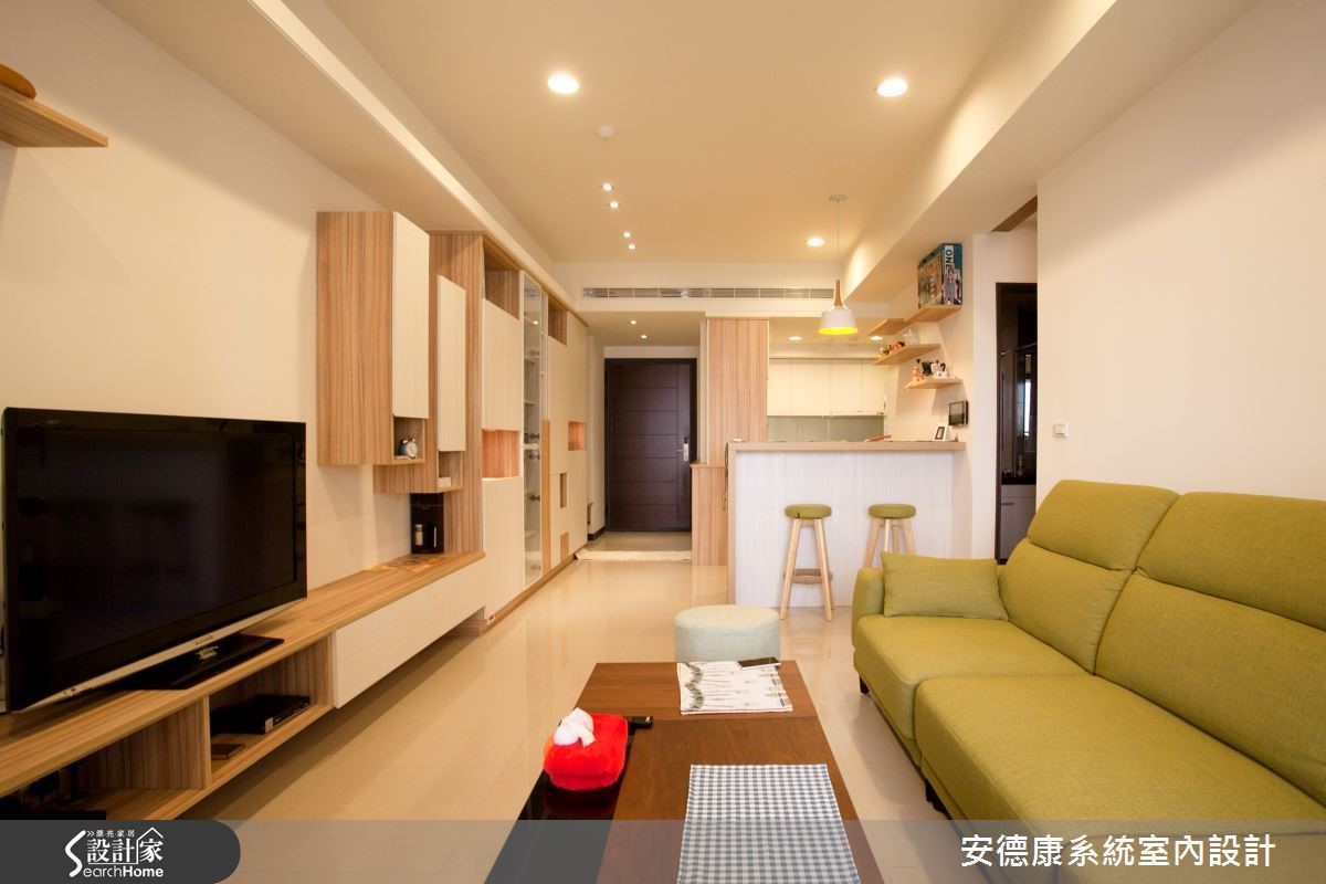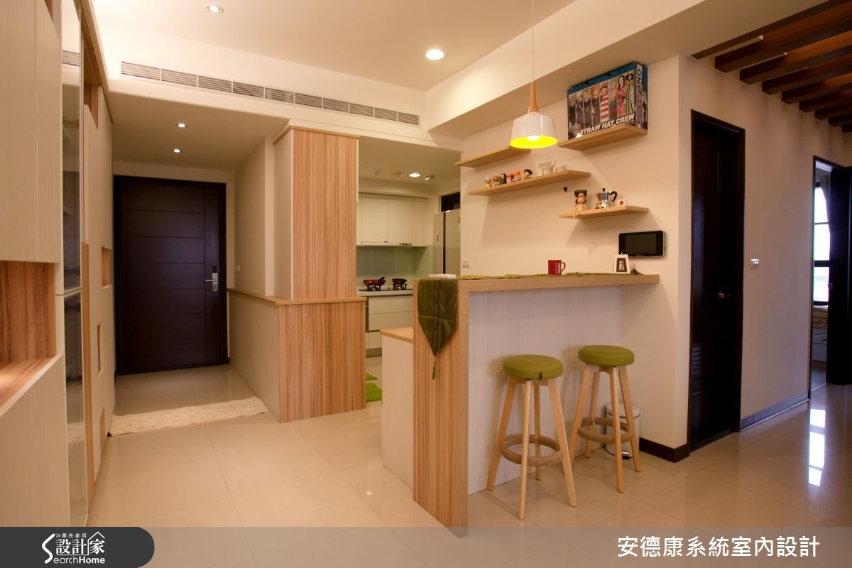 89平方米的新屋中,原本的厨房天花较客厅低,因此设计师将过低的厨房天花延续至玄关处,营造和谐一致的视觉。同时增加吊隐式空调主机的设置空间,也利用大面积系统柜注入丰富的收纳机能,增加日常生活的便利。 【树状系统柜,趣味和机能并存】考量到进屋后的收纳,玄关柜除了能收纳鞋子和雨具,连衣帽和外出包也一起纳入。并以灰镜隐去电箱的存在感,让视觉更俐落。由于男主人有收纳公仔的兴趣,特地在玄关处规划玻璃展示柜,在出门或进门时,都能看见心爱的搜藏品。客厅电视墙利用系统板材做出树状开放展示架,在浅木色与草绿软件的映衬下,为喜爱简约感的屋主夫妻,打造清新自然的好收纳居家。餐厅则因应屋主的生活习惯,舍弃餐桌改设置吧台,厨房旁增设电器柜,并以柜体板材延续整体和谐视觉。