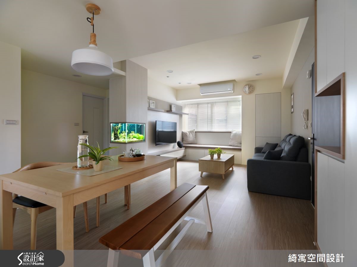 老屋空间,仅有单边采光,空间感较显阴暗,且大门正对卫生间,于是设计师更动格局,将卧室改为和室,且缩减和室局部面积让出空间变成餐厅,使和室侧边采光得以进驻,注入明亮的气场,打造出简约美感的轻质空间!【MUJI融合北欧,演绎利落简约】空间采用北欧简约融合日系MUJI风格,透过大量木质感元素,佐以利落简约的量体美感,形成放松无压的氛围,并将电视墙旁的结构柱结合鱼缸端景,满足屋主养鱼爱好,也藉此挡住后方客浴门,化解大门面对卫生间的顾虑。透过格局重塑,让和室呈开放形式,与餐厅相衔接拉长视野,搭配厨房、和室采光引入,创造轻盈场域;并考虑到女主人喜爱下厨,期望可拥有收纳量充足的厨房,将和室、厨房的墙面予以拆除改成双面柜,让收纳机能瞬间扩增!