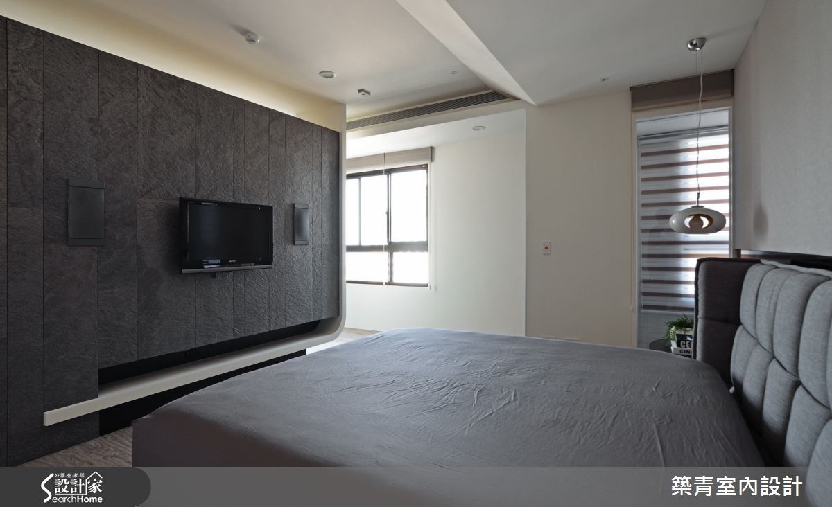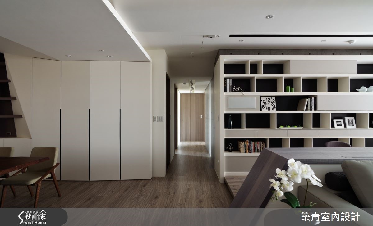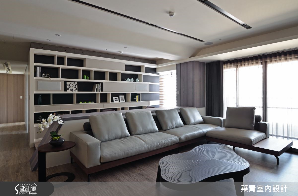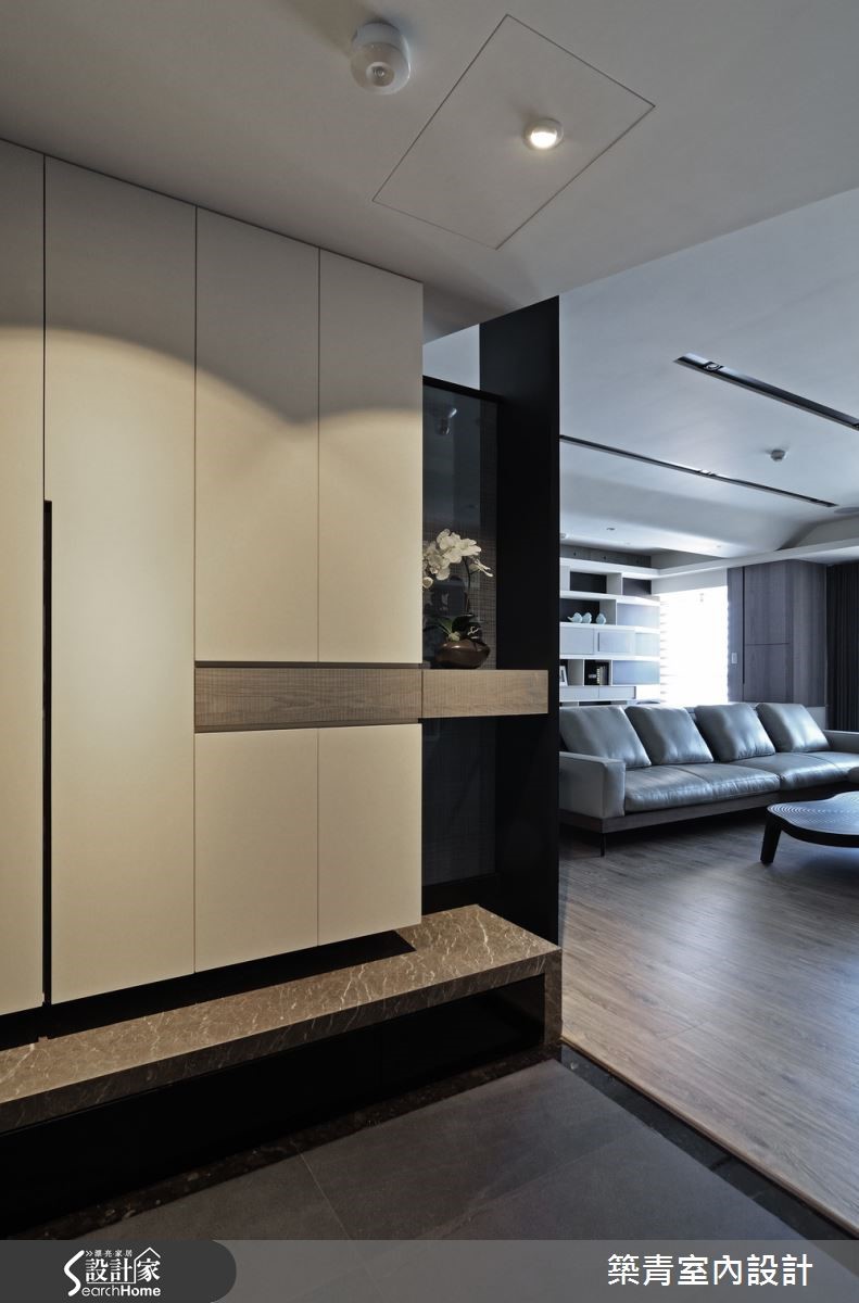 业主因工作因素,长期作为空中飞人,期望231平方米的居宅可当作舒适落脚处,于是设计师发挥巧思,跳脱高彩度规划,以黑、白、灰三色替空间打底,并融入流畅设计,交织出北欧风特有的宁静面貌。【造型天花,增添活泼与视觉延展】玄关地板采灰黑色石材铺述,并于立面结合展示收纳机能,悬空手法配上木质纹理,让柜体不显压迫;透过素朴的色彩挥洒,予人平和稳重却不呆板的视觉印象。公领域让客、餐厅、书房延展开放,天花加入弧型的包覆修饰,弱化大梁突兀感;搭配嵌灯线条的延伸让空间更为修长。书房书桌作为沙发背靠,以大幅格状书墙型塑背景,对应着铁灰薄板岩电视墙,构成理性秩序与粗犷自然的趣味对话。餐厅天花做吊顶设计,连结墙面柜体的折线造型,柜体的深色木皮延伸至天花。塑造一体成形的视觉,营造丰富的线条架构,同时考虑到油烟散逸问题,于厨房外加装黑玻滑门,保有清爽通透的用餐环境。主卧延续了活泼的天花线条,并承袭低调的色彩计划,规划黑色电视墙替空间压色,在墙面上方保有透空,分享后方的更衣室光源,巧妙化解压迫的视觉感受。