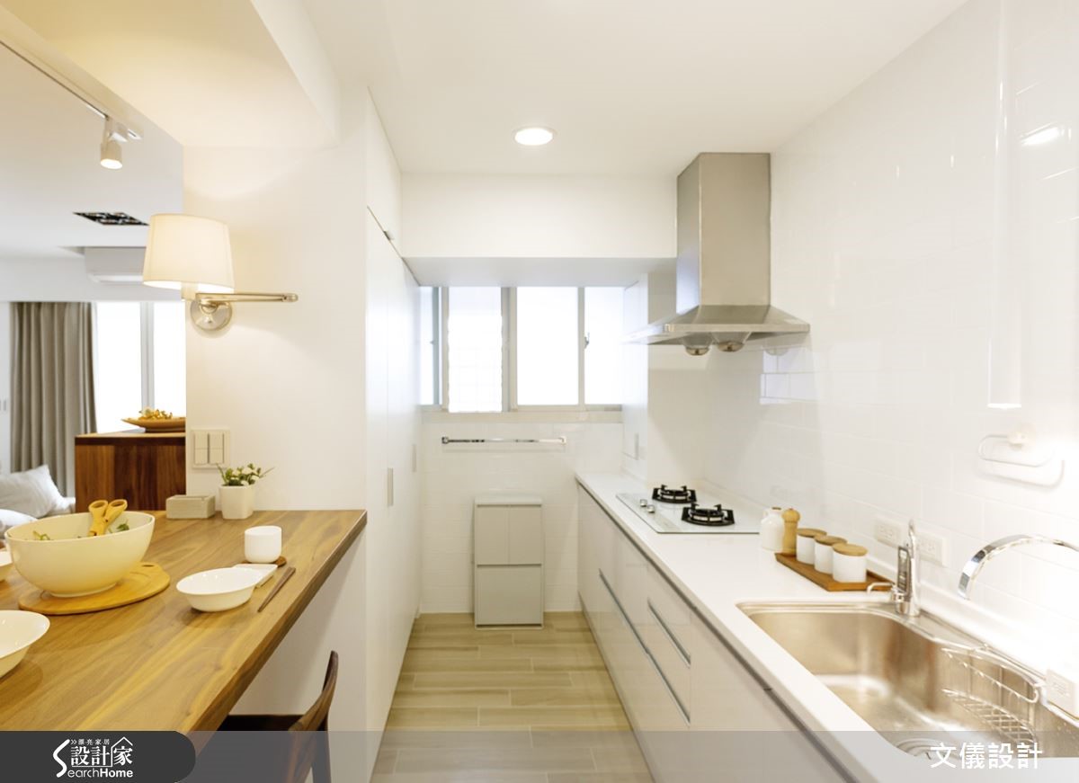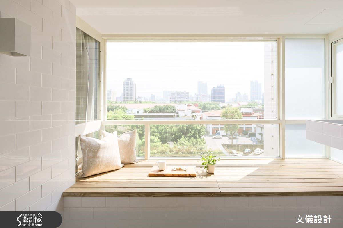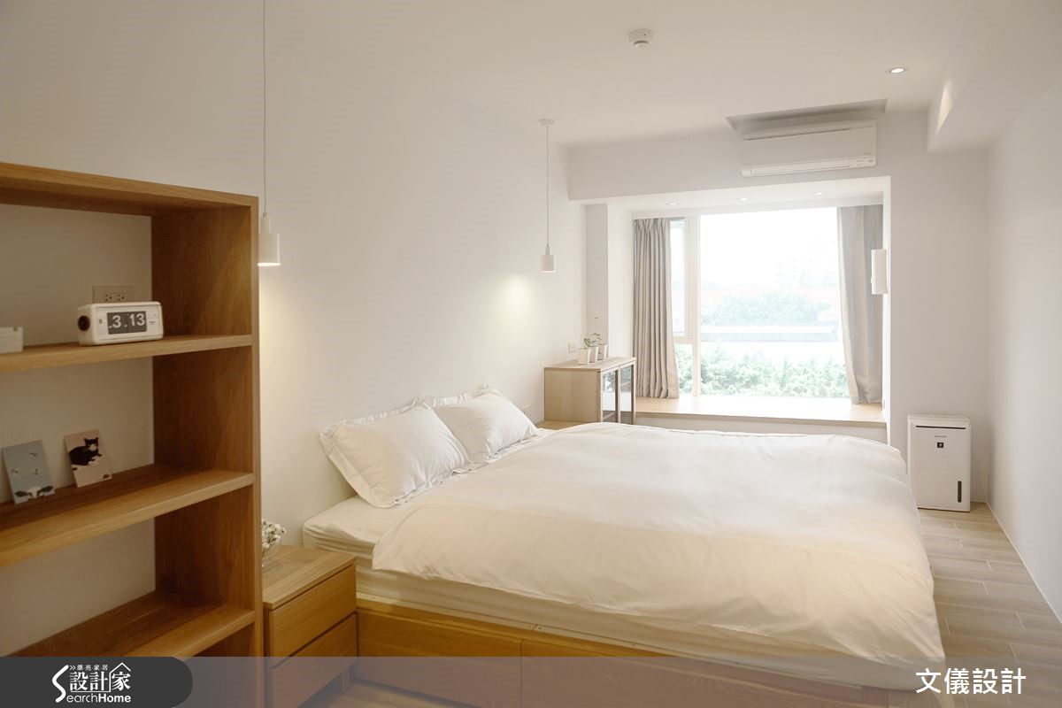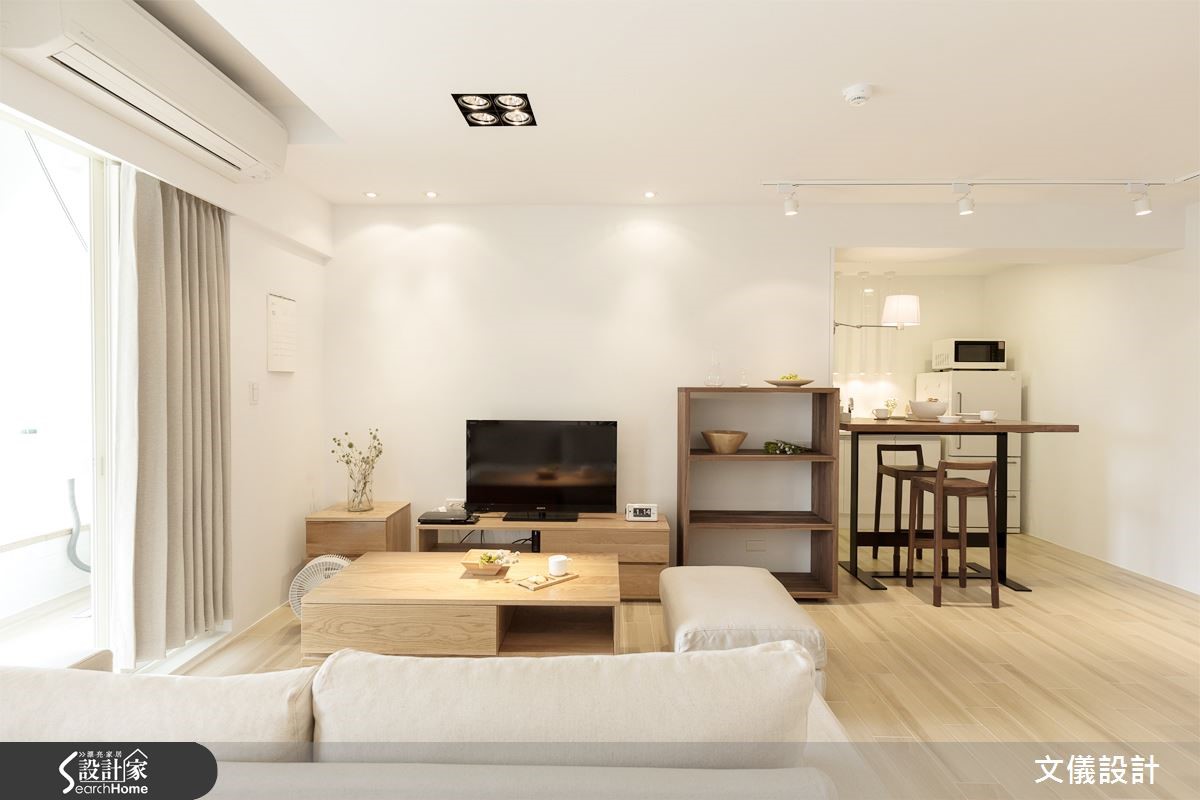业主希望在50年老宅中享受疗愈的居家生活,设计师选择以纯白色调与木元素的合宜搭配,彰显轻柔暖度。更设计飘窗区,伴随着舒适的绿景,感受日光和微风轻拂,空气彷佛也更加清新。【减法设计,生活空间更轻盈】公领域以减法设计简化视觉,客厅、餐厅和书房全然去除隔断,打造开阔视野。搭配移动式的轻盈家具,不仅便于移位,低矮小巧的设计,也不占空间,留出宽阔走道。采用纯白与浅木色的家具,让老屋漫溢清新质调。厨房在梁柱旁加设小巧吧台餐桌,打造日式感的清爽空间;进到卧室,也运用木质收纳家具,打造优雅质感,而书房、卧室有著得天独厚的窗景,设置悠闲的飘窗区域,形成疗愈风景。