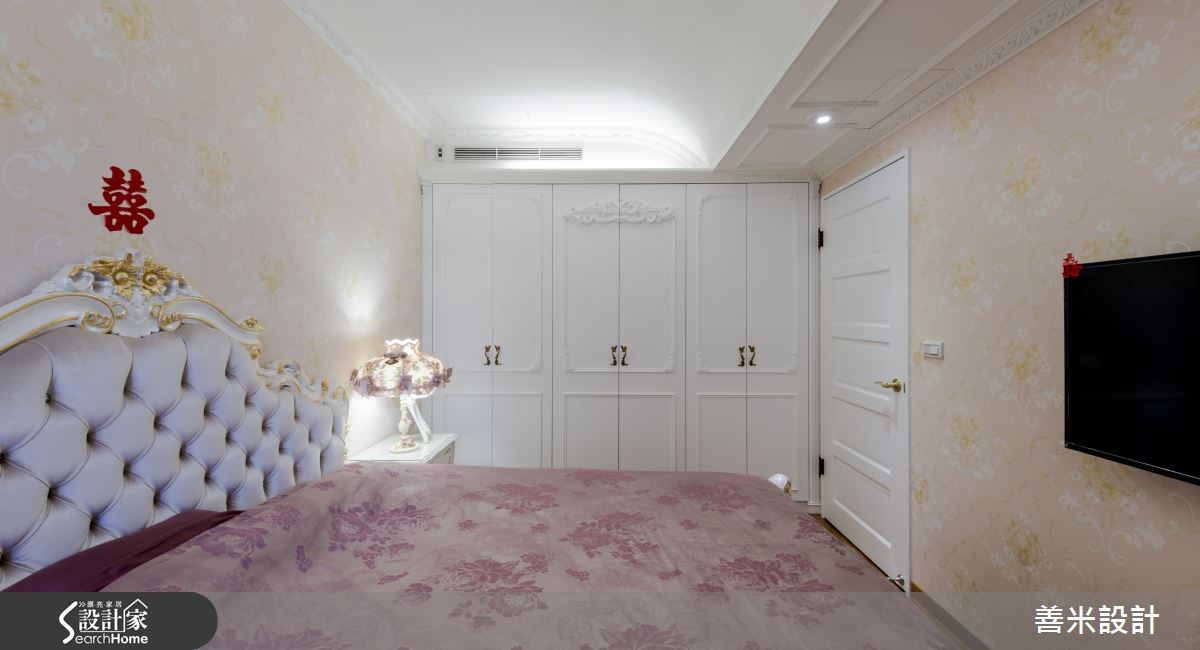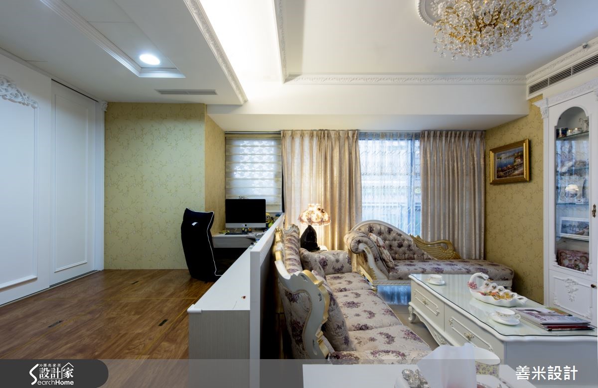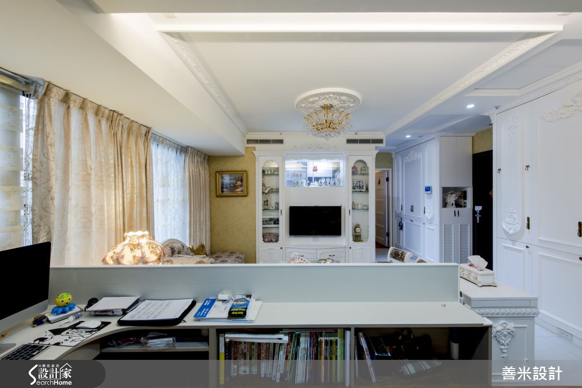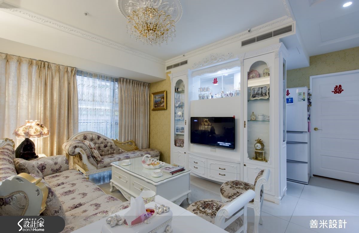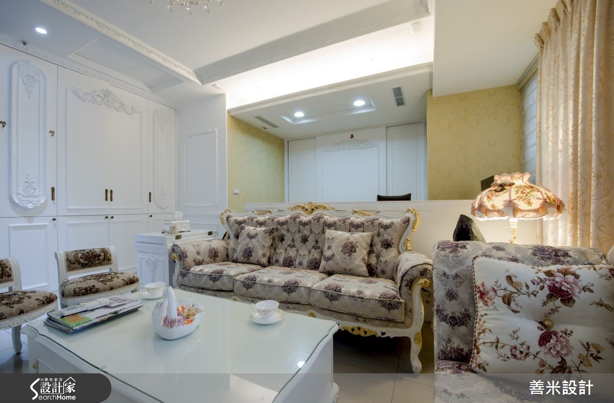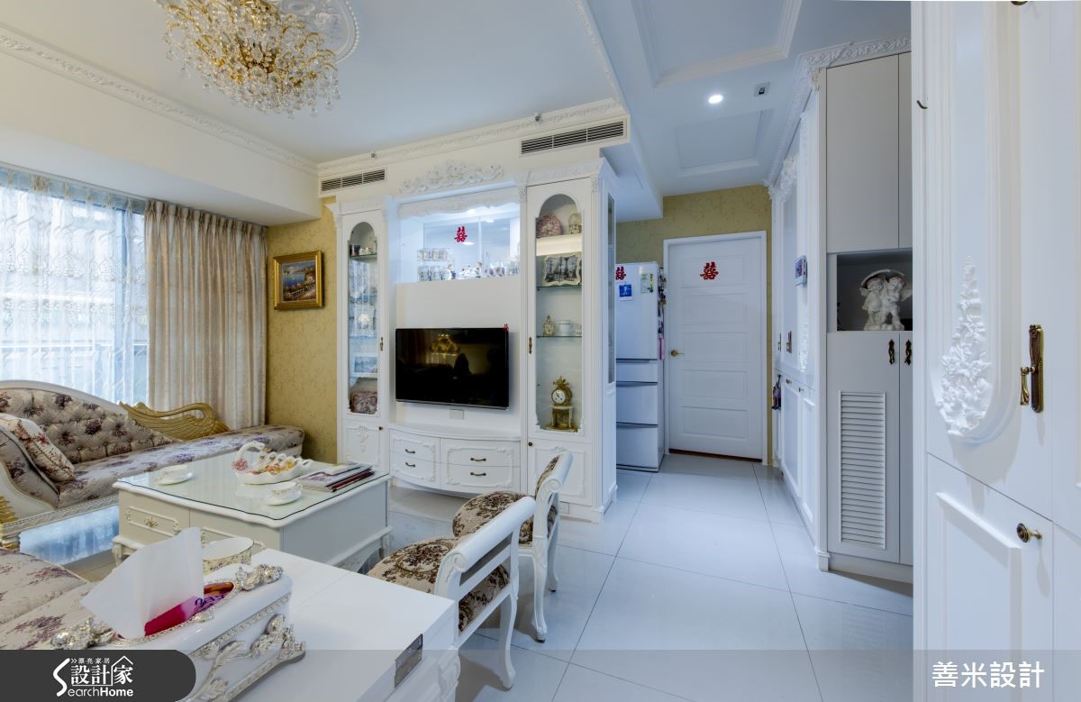 设计师以有限的预算,打造46平方米新古典居宅,由于空间较小,规划另一间和室兼做书房与储物室,并考虑到未来十年的居住形式,将此房预作为未来的小孩房,以充满弹性的格局配置,加入充裕的收纳机能,打造麻雀虽小、五脏俱全的梦幻小豪宅!【线板与雕花,衬托新古典氛围】整体以白色为底调,搭配局部的金色壁纸铺述,于墙面、柜体处搭配白色线板与雕花,堆叠成丰富层次感,并在天花悬吊水晶吊灯,搭配素雅的风格家具,呈现带有乡村况味的新古典氛围,电视墙则结合展示收纳柜体,与上方空调出风口融合,营造均衡稳定的对称画面。【利用地板下方打造置物空间】厅区后方架高木地板,于地坪底部暗藏置物空间,作为开放式书房兼飘窗场域,与客厅形成自然的对话情境;卧房则延续公领域的线板、雕花语汇,于墙面铺陈粉嫩壁纸,并在床头、把手等细节处点缀金漆元素,阐述精雕细琢的优雅风尚!