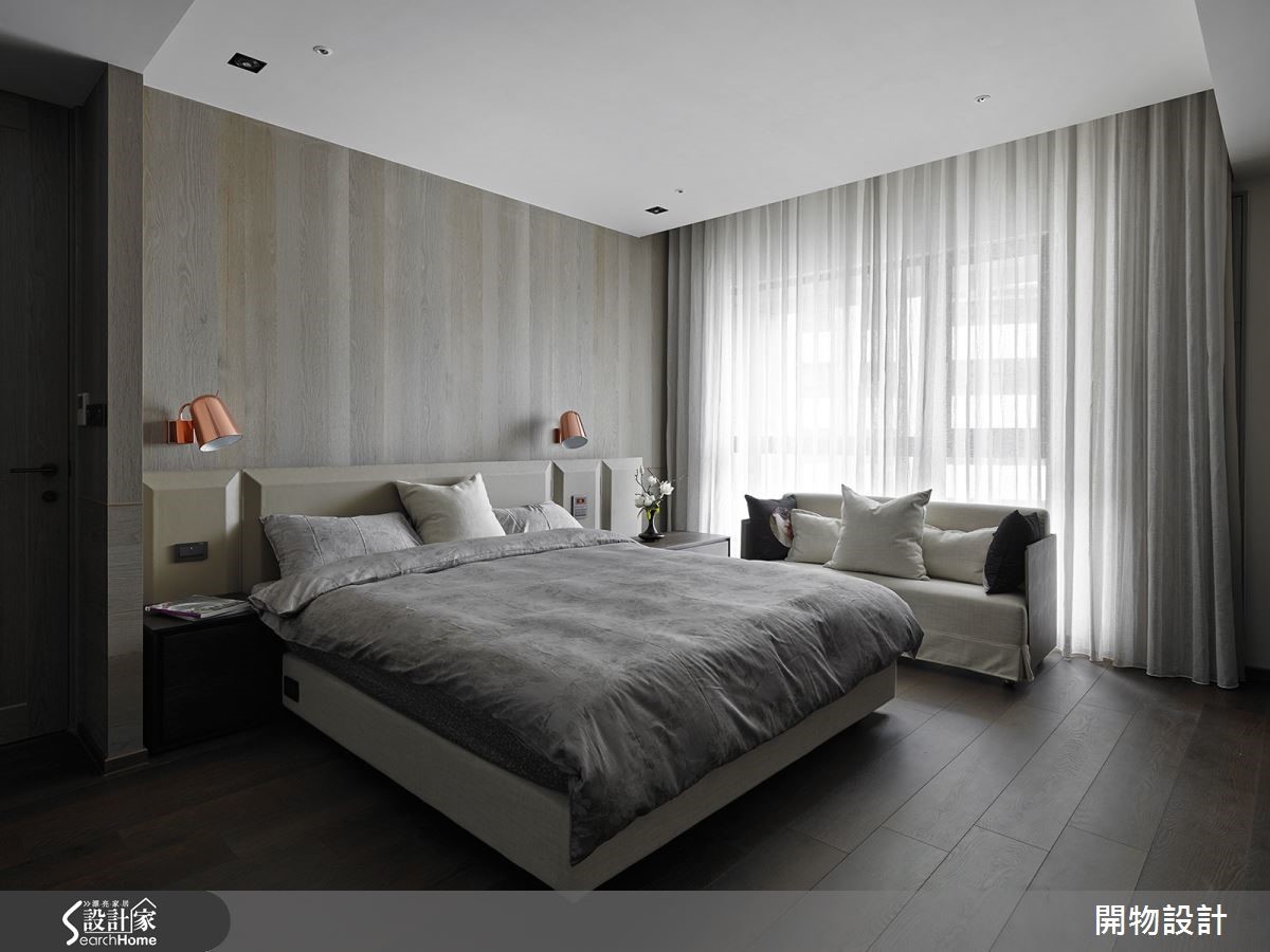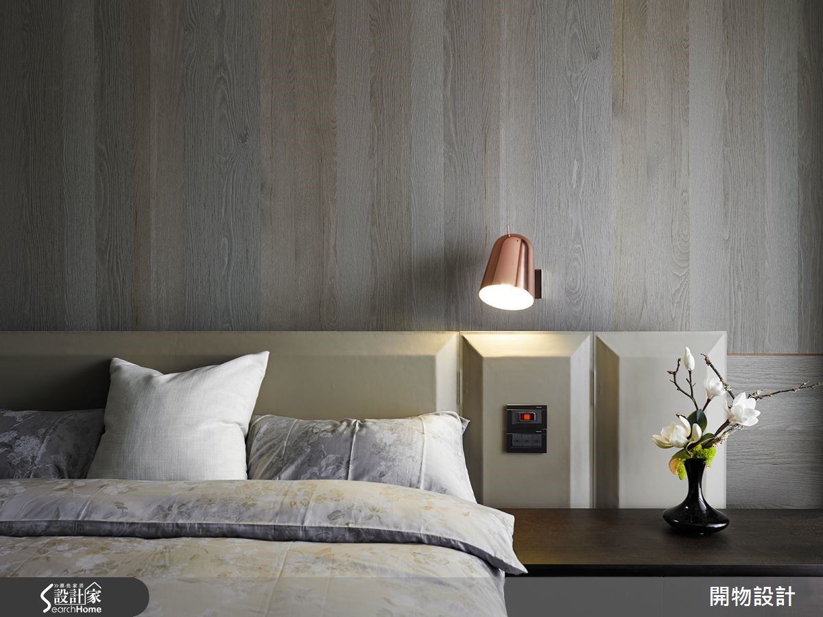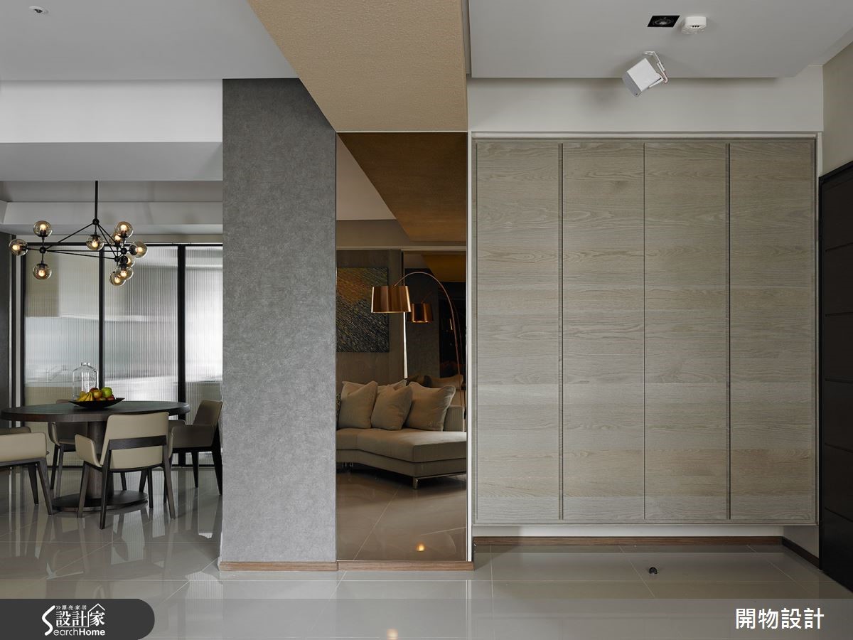 两户新成屋的单层双并宅,设计师将其中一户的客厅另外安排为宴客餐厅,整体空间规划以沉稳色调勾勒生活轮廓,再利用灯光、茶镜及金属,缀饰细腻流金质感。自低调内敛的氛围中,展现出时尚人文品味。【石材主墙,营造艺术性视觉】从门口进入后,石材粗犷纹理的电视墙便映入眼前,成为磅礡的艺术视觉。公共区域结合餐厨,形成宽广格局。天花与梁柱以铜金色跳色,下方两侧墙面局部设置茶镜消弭梁柱压迫感,延伸空间。在厨房处加入玻璃拉门设计,既区隔界线也能引进光线扩容视觉。除了家人的用餐空间,也增设大比例的宴客餐厅,后方以金属板打造现代时尚的展示墙,在内敛氛围中隐隐流动奢华韵味。来到卧室,除了在地面铺设木地板,也将木质的温润纹理蔓延至墙面,描绘舒适的睡眠区样貌。床边两侧两盏玫瑰金色壁灯,更添精致度。
