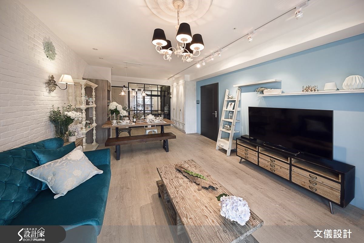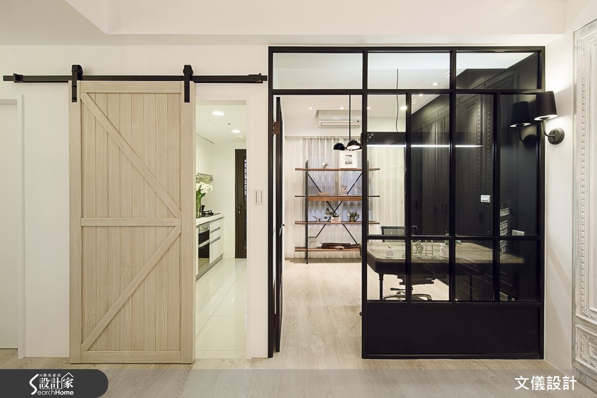 这间93平的新屋,设计师加入朴实的乡村风格,结合高雅的法式情怀,交织出一股非写实的空间意象。同时运用铁艺、文化石和色彩交融之下,满足一家三口的对家的想望。【通透材质,大幅扩展视野广度】客厅中两面墙分别以淡蓝色、白色文化石搭配朴实家具,并于柜体点缀线板,带出法式轻柔感。餐厅透过不同样貌的柜体陈列,以木质承袭温暖元素,再用小鸟造型灯饰营造活泼视觉焦点;厨房采用横推式木质谷仓门,更显朴实。书房则以黑色铁艺推拉门作出分野,采用深邃色彩突破一贯浅色基调,作为男主人专属领域,并透过通透材质使视野更形宽敞,随时保有与客厅的交流。卧室以洗白色调搭配木质地板带出优雅气息,并加入机能柜体的铺排,展现甜美的生活风景。