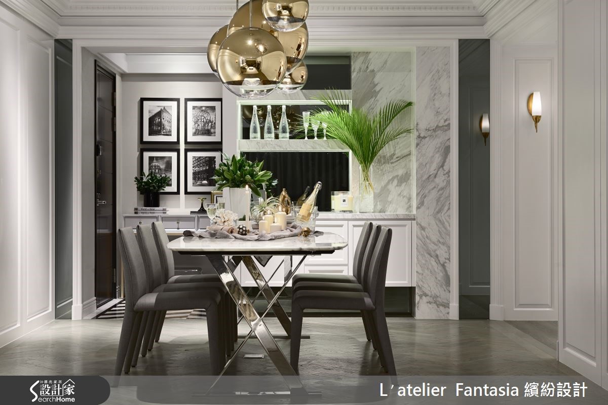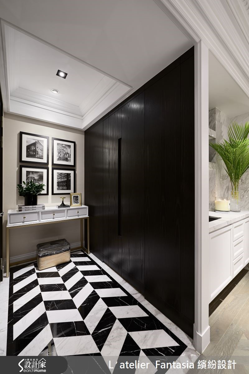 新古典风格的优雅品味以及细腻工艺手法,总是令人爱不释手,而设计师在干净利落的黑白色系中,加入曲线圆润的灯盏佐饰,即使是难以驾驭的金色细节,也能与摩登典雅的氛围巧妙交融,点缀艺术气质。 【金属灯饰点缀,提升精致度】玄关处以比例相当的黑白地砖勾勒几何轮廓,营造利落时尚个性,一进门便令人印象深刻,侧边安排为衣帽间,类巴士门的设计在开阖门板时,可更加节省空间。客厅与餐厅利用开放式空间连贯宽阔尺度,木地板以人字拼方式铺排,承载彷佛欧洲贵族的人文意象。餐桌天花设置三种不同大小的金色圆形灯饰,从黑白的色调中脱颖而出,渲染精致而温暖的亮度,创造具不凡的艺术主视觉。主卧卫浴以石纹砖取代沉重石材,并加设纯白木百叶窗,使整体风格营造上更加完整;客浴则铺上复古花砖,让绚丽花纹恣意蔓延,增添独特气质。