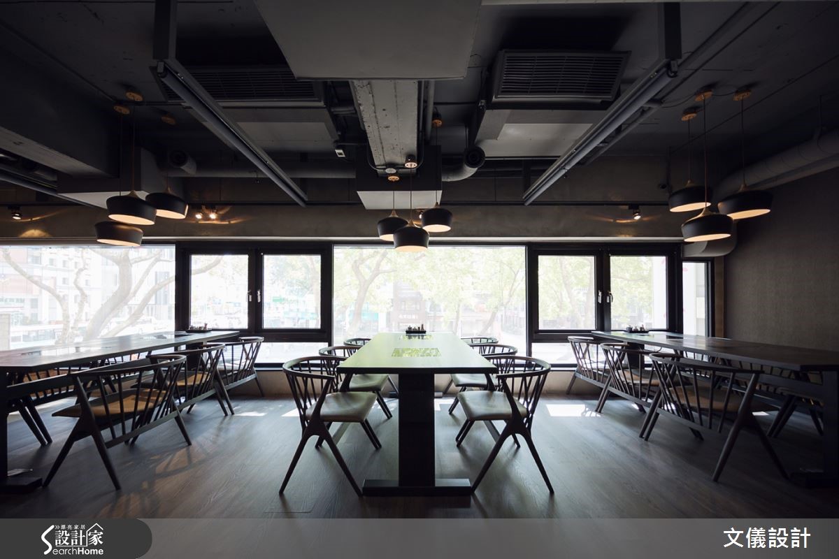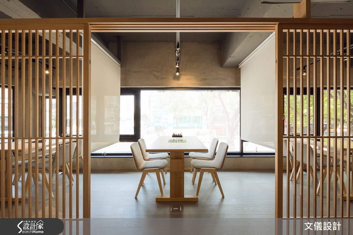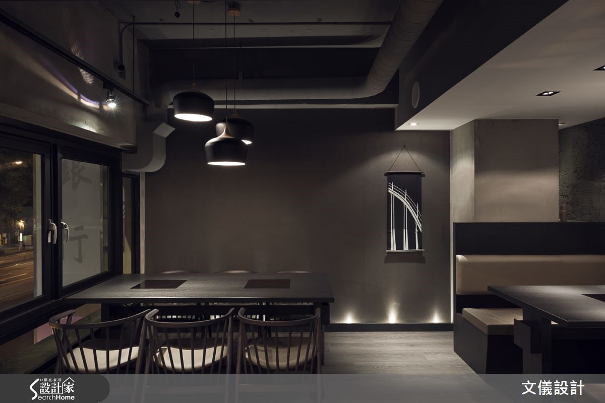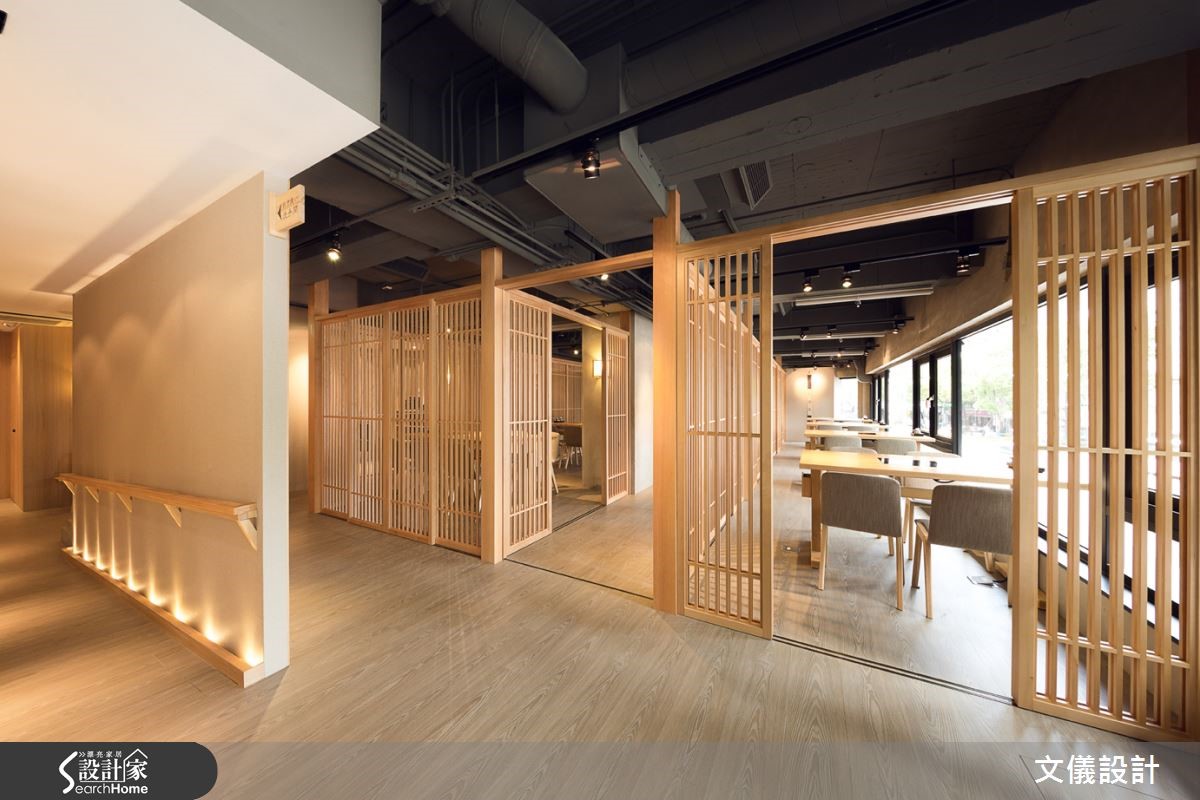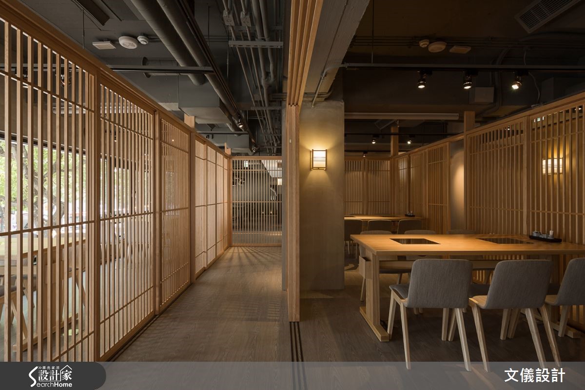 此寿喜烧日式餐厅由二手房改建,建筑历经50年岁月,设计师保留斑驳的水泥材质,融入带有香气的木头质地,传达温润凋零美感,阐述着日式侘寂之意象,让顾客品尝美食之余,亦获得心灵的美好!【细腻榫接工法,展现原木魅力】尊重建材本身的减法设计,减少对建筑结构体的负担,将木头、水泥相互融合强调日式静寂之美,再引入丰沛阳光多变的折射角度,彰显材质的魅力。并配置格栅栓木门搭配光影,视线得以穿越透空。而可挪动式木门设计,可将包厢瞬间变为大宴会厅,空间充满使用弹性。空间中的一梁一柱皆本持爱惜木头的精神,不采用钢钉,传承细腻的榫接工法,表现日本地道的茶道精神,刻画日本传统风情。而开放用餐空间则转化为深沉的黑色印象,以区域间不同的色调变化,转化空间情绪。在现代简约风格之中,隐含水泥斑驳的纹理,低调中带有质感。