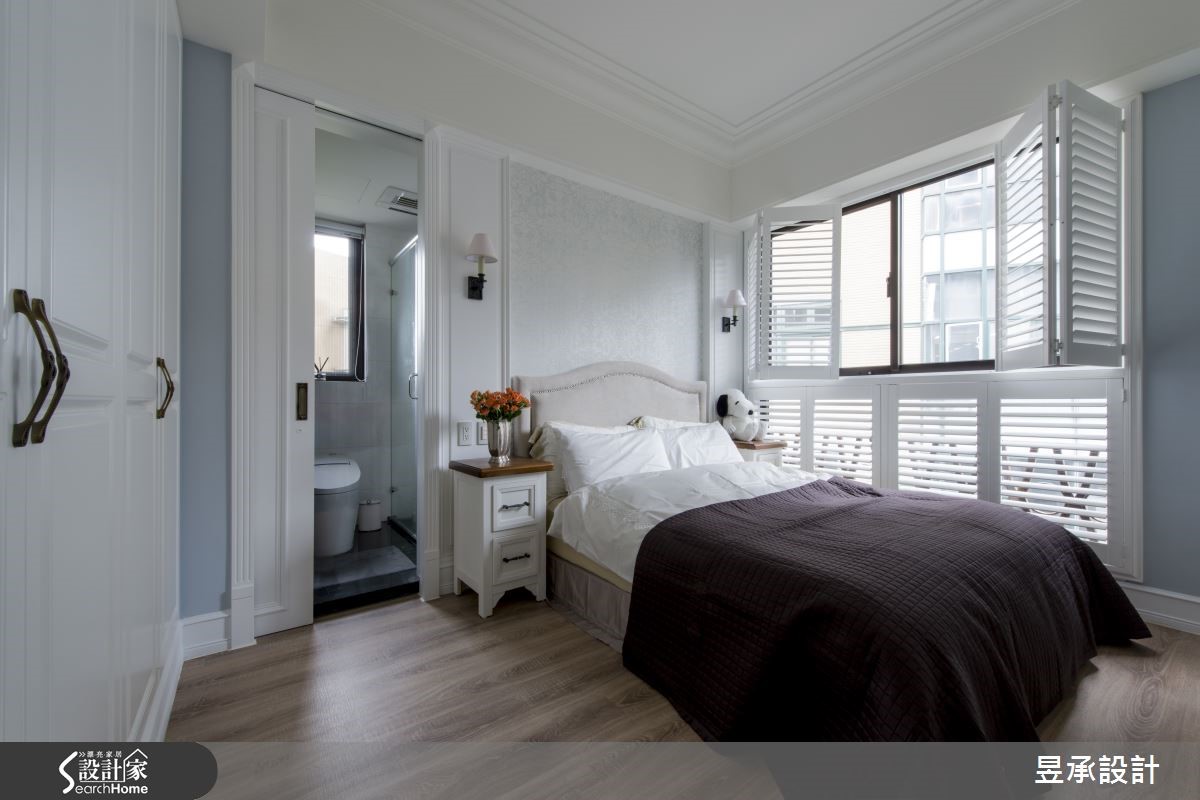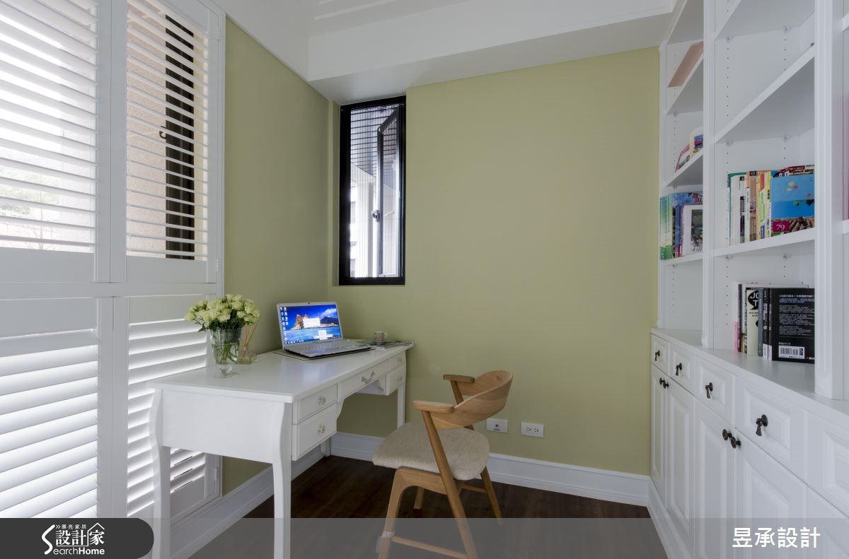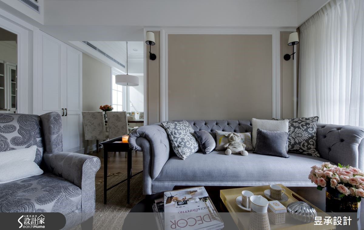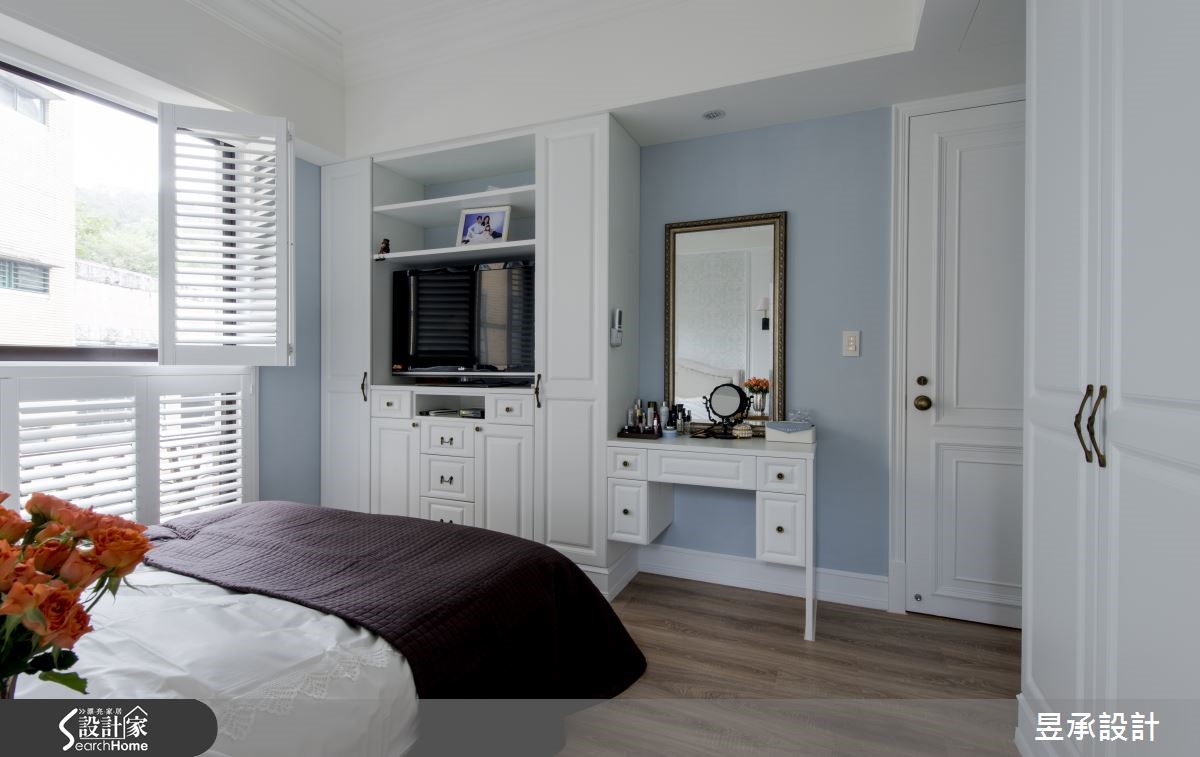 由于新屋的格局方正,不打算大作更动,于是将设计主轴放在提高收纳量与扩容两大重点上。以化零为整的手法,为126平方米的住宅展现美式大宅风范,却又增添细腻雅致的氛围。 【延长墙面,统整动线与收纳】延长入口左侧的客浴墙面,以利增设收纳柜;同时以对称门片框设长型镜门,打造清新雅致的墙面。客厅利用藤色系墙面搭配白色线板,营造清新对比感,同时利用开放格局转移焦点、补强沙发背墙不足问题。背墙后方设置双排柜,为餐厅与书房提供大量收纳空间,更利用书房的格状玻璃门片为采光不足的餐厅引进充裕光线,成功营造明亮清爽的视觉感受。调整客浴与厨房空间比例,将原先狭小的一字型厨房转变为L型厨房,电器收纳和操作台面的空间更为广阔。水蓝墙面主卧以纯白木百叶与原窗做双层设计,提升视觉整体感。粉紫色女儿房则以悬空床架响应游戏空间需求,色墙与墙纸的搭配,也让小孩房更活泼。