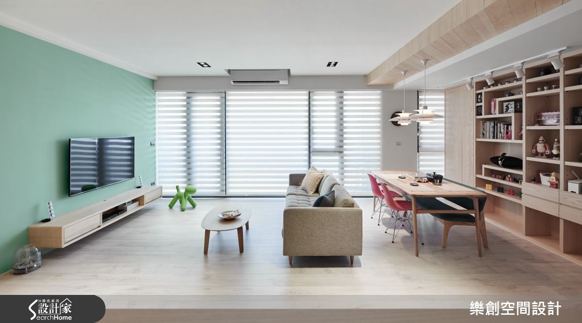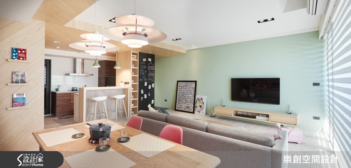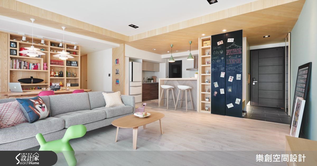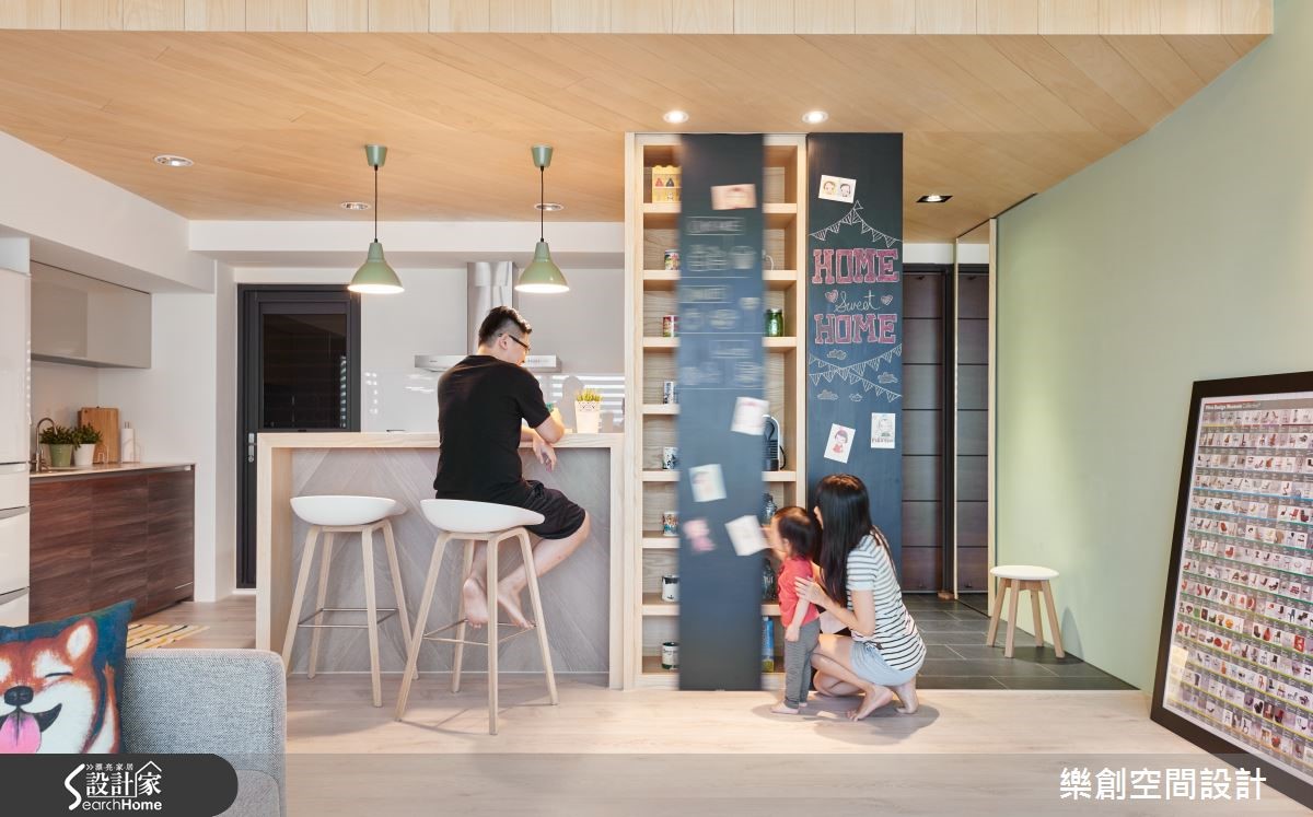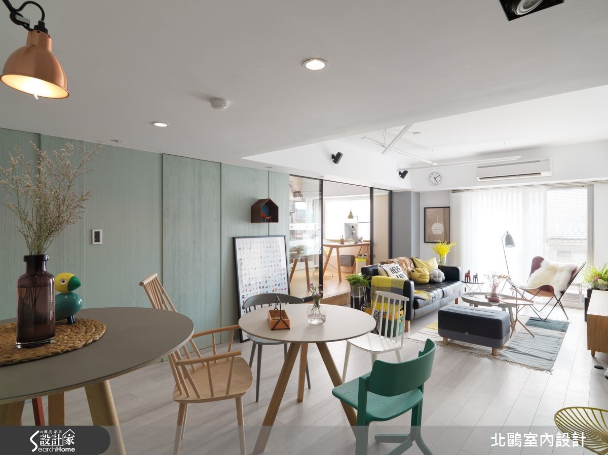 北欧家庭着重在"家庭欢聚时刻"上,设计师以此为设计主轴,利用大量的木质建材,为采光优良的 101平方米小户型,注入特有的亲密家庭氛围;并结合缤纷色彩的家具家饰,点亮温馨亲子情。【缤纷色彩点缀,活化空间表情】玄关设置仿板岩砖的超耐磨地板,以色调与室内空间做出区隔。穿鞋座椅上方特意设置圆柱形悬吊设计,搭配转角的落地黑板门片,相当具有俏皮的童趣精神。公共空间拥有充足采光,采全开放设计,让客厅、书房与餐厨空间的分配呈现简易的"品"字动线,仅以吧台为区隔,让全家人在公共区域的互动毫无阻碍,同时也符合北欧人"无私开阔"的生活概念。客厅的天花大梁以实木皮包覆设计,搭配色调轻浅的开放书柜,让温润的实木质感满盈室内,提升居家温度,草木绿绿墙面则更添自然气息。主卧与儿童游戏间延续公共区域的清新氛围,点缀紫外光和马卡龙粉色,营造清爽的舒眠空间。