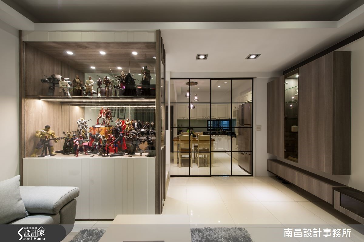 设计团队因为考量到屋主预算有限,同时又需涵盖美感与机能展现,于是简化不必要的繁琐设计,给予现代风格与简约灰调,让空间显得俐落大方,正好符合男性科技工程师沉稳的性格。同时将机能集中于玩具柜及电视主墙内,满足屋主的收藏爱好。【引入清玻材质,视野保有延展】设计师采用灰阶做为空间基底,透过窗帘、地毯等软件,衬托整体色彩的协调层次,并于居家柜体妆点染色木皮,彰显自然纹理。电视柜则呈不落地设计,更显轻盈,减轻视觉压迫感。餐厅墙面穿插矩状镜面材质,充满时尚现代的俐落表情。局部结合清玻材质,让视线保有通透,同时亦兼具展示机能。并规划一座专属的公仔展示柜,以凹凸线条增添柜面立体表情,并给予大容量置物空间与灯光照明,满足屋主的收藏需求。