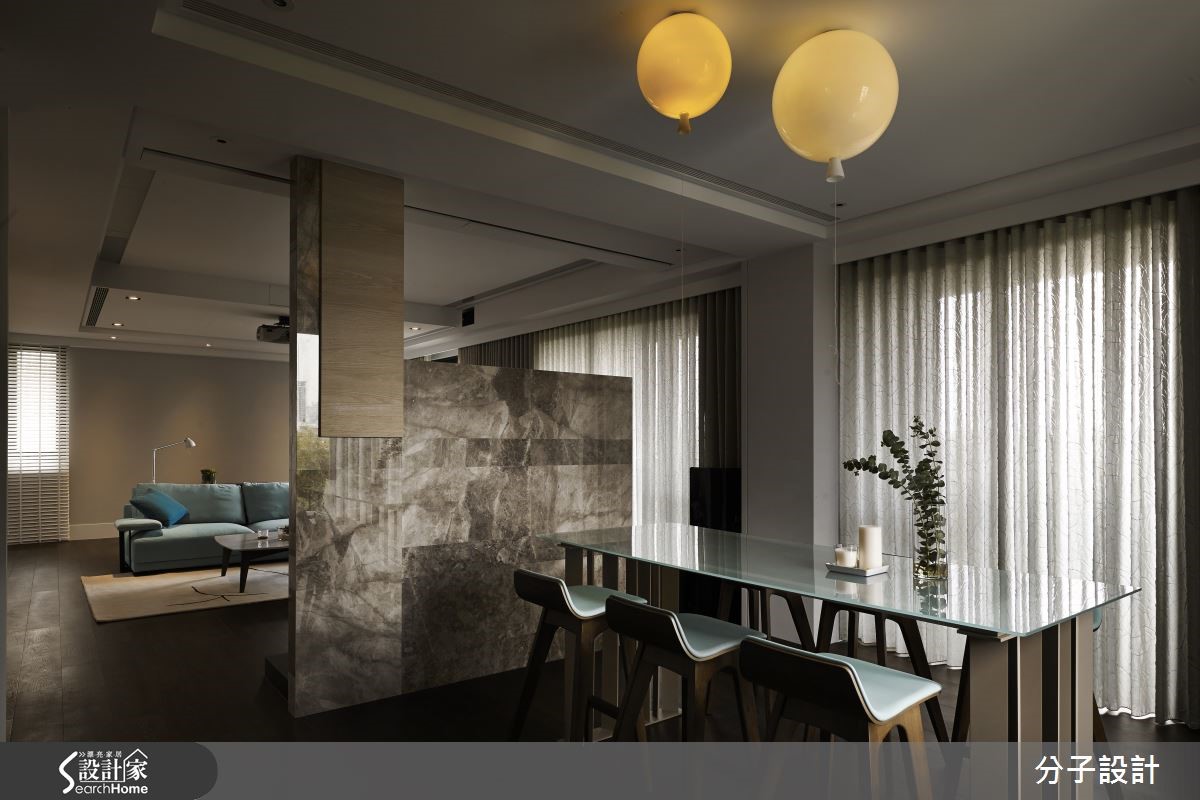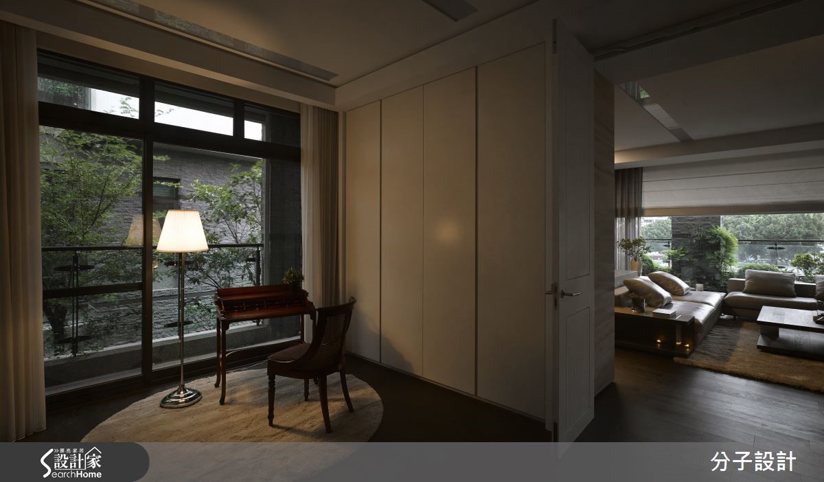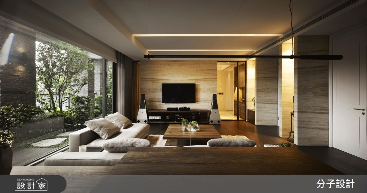 可分层规划的独栋别墅,有着风格编排的自由,在6室4厅的格局铺排下,每位家族成员皆能坐享不被打扰、专属个人的生活领域;设计师在此案中,挹注宽广大器的空间布局,并完美连结室内外景观,将沉稳、低奢、人文等元素演绎得面面俱到。【落地窗与浅色调,打造悠闲氛围】室内以大面落地窗引入绿意景致,并给予畅通的走道动线,墙面加入隔板灯照明搭配艺术展示品,丰富立面表情,一旁则规划品读场域,与窗景植栽对望,打造不受干扰悠然气氛;居室延续轻浅色调,以简约线条搭佐温煦光影,带出怡然自得的生活情境。【橘红色沙发,闲情空间增加彩度】三楼为儿子专用的起居领域,厅区内透过展示架、隔板刻划黑色转折线条,框架墙面的立体美感,并以电视墙区划客、餐厅之间的回字动线,让餐厨自成一格,兼具完善机能与沉静气氛;居室则融入书房与睡眠机能,并摆放橘红色单人沙发,替空间提点彩度、画龙点睛。【圆弧流线,为舒适场域增添时尚气息】四楼则为女儿的生活场域,厅区以墙纸呼应电视墙石材纹理,彰显低调但生动的材质表情,且陈列天蓝色沙发带出清爽气息;居室床头以大面积圆弧流线的木质包覆,兼具前卫时尚与舒适温暖,地面则做出高低落差,简单区划睡眠与日常起居,呈现宽阔无压的空间感。