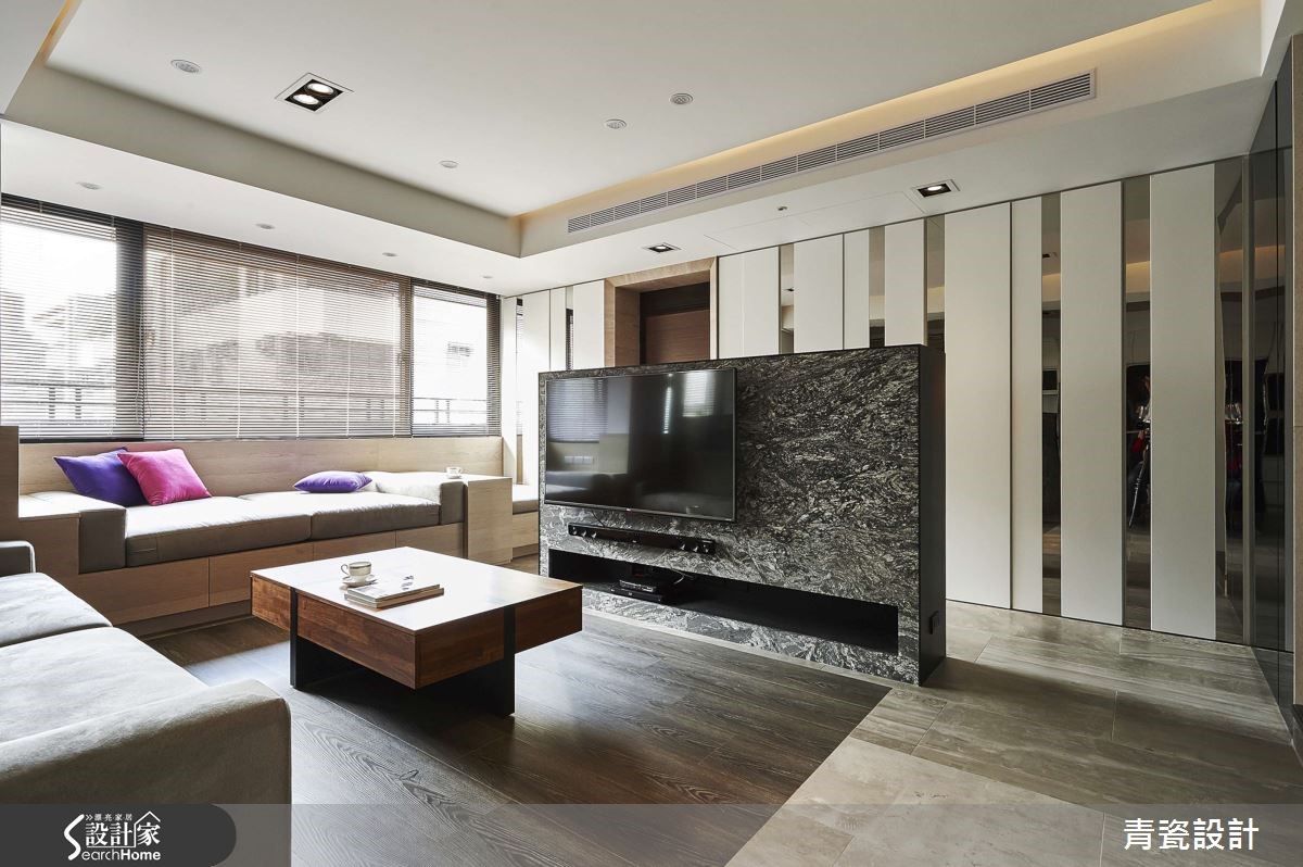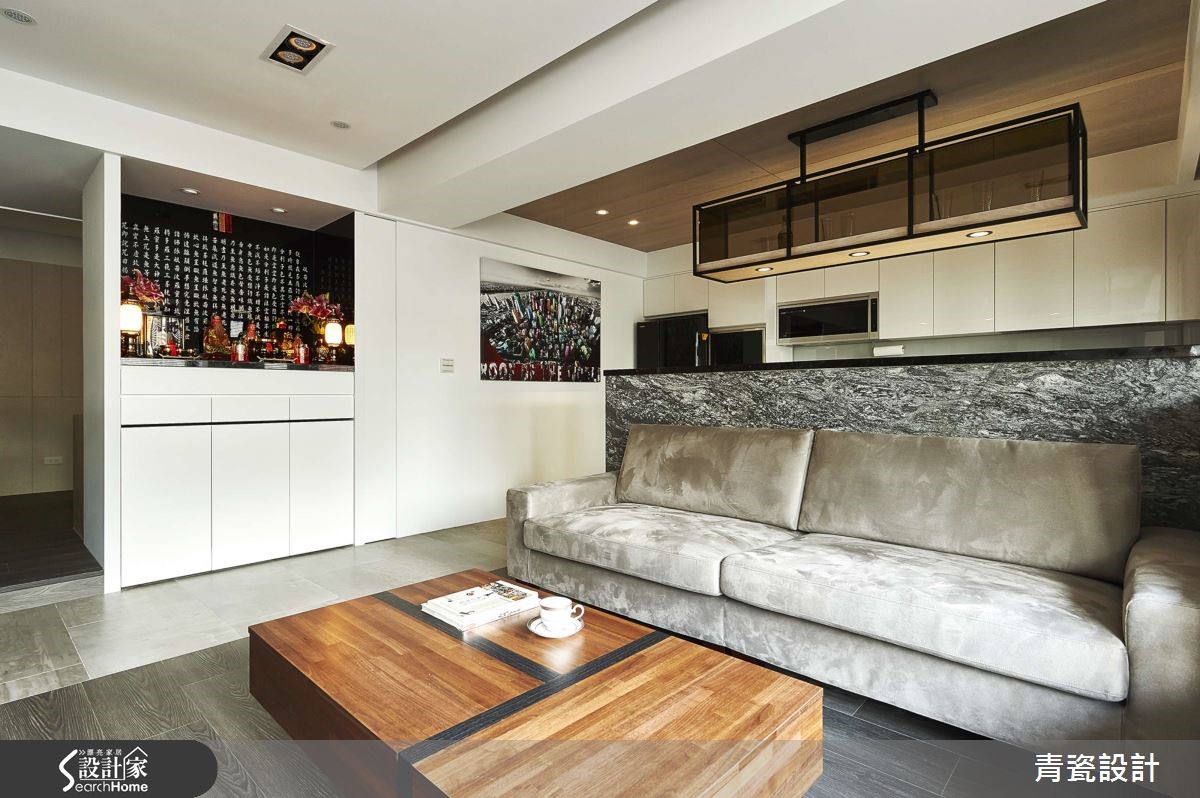 40几年的空间,在设计师重划之下,划分三室三卫与开放公共区的新格局,成就宽敞明亮的空间基调;同时添入现代线条,藉由自然材质与细节收边,提升设计感,将老屋彻底改头换面,网罗风格与机能,重展新面貌。【造矮墙、破隔断,扩容视觉】在居家的公共领域中,设计师给予流畅的开放动线,规划带有展示机能的电视墙界定玄关与厅区,并采以矮墙规划,赋予延伸的视觉感,搭配放大开窗与飘窗设计,让客厅延展放大。原有的封闭厨房则拆除隔断,改以开放处理,备有电器柜与水槽、炉火区,以吧台搭配铁件茶玻吊柜作出场域分野,避免宽敞视线受阻。沿着居家立面规划开放式佛龛,除了讲究尺寸方位外,更以素雅黑白底调、搭配右侧墙面挂画,减缓传统佛堂的突兀感。 此外,设计师在公共地带转进私密区的过渡处,将走道稍作放大,搭配桌面与书柜规划,不仅提供一处开放阅读书房,也替卧室区争取更大的缓冲空间。主卧的床头设计则以灰咖啡色调为呈现,两侧妆点茶镜,铺陈出时尚高雅感。