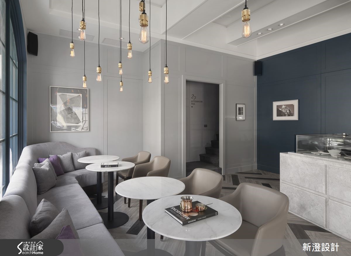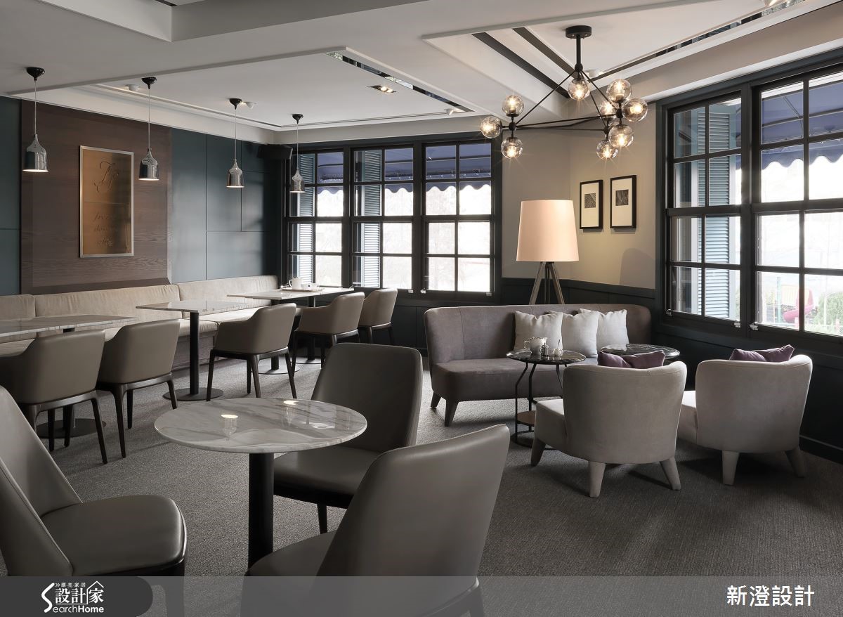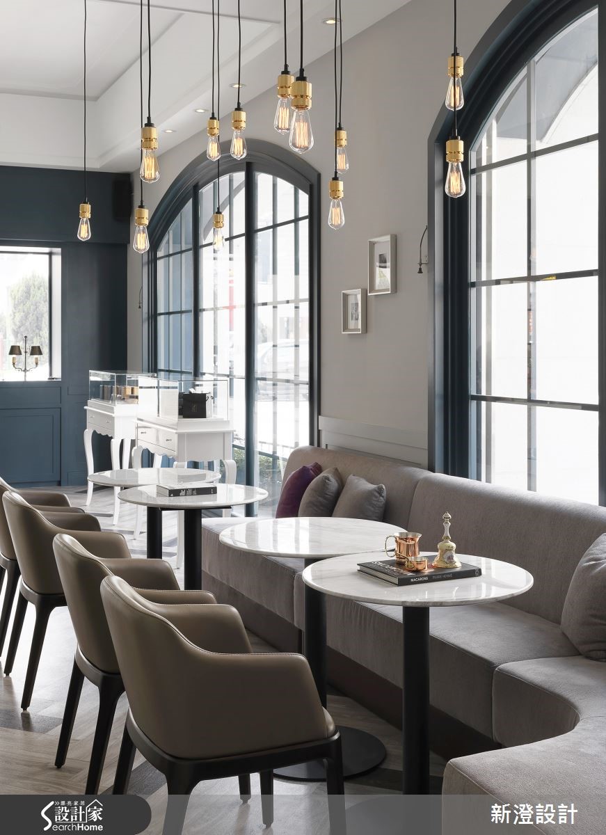 富有明丽田园风光的台湾郊区,竟也有着宛如身处法国巴黎般细腻典丽的建筑,以纯白与湛蓝的姿态向街道上的人们招手,演绎优雅高贵的法式风情。【复古建筑外观,型塑欧式印象】外观以大航海时代常见的大面积拱型窗棂与顶棚作为视觉亮点,外墙的雕刻与层叠的线条造型突显了细致韵调,并加入墙面灯光,在夜晚时闪亮彷佛贵族少女的珠宝盒。【以精品展示设计,精致陈列商品】一楼柜台区域延续了外部雍容典雅的湛蓝色调,陈列了宛如各色宝石的精致法式甜点,在沿窗区域摆放定制长型沙发与造型优美的纯白蛇型家具,在仿木纹地板的衬托下,流露法式宫廷氛围。【仿古欧风家具,营造法式风情】二楼为主要用餐区域,利用仿古家具与经典格状窗设计营造法式大使馆的复古气息外,同时利用天花的镜面线板与现代灯饰平衡怀旧感,窗边木作吧台更散发慵懒闲适的欧式情调。