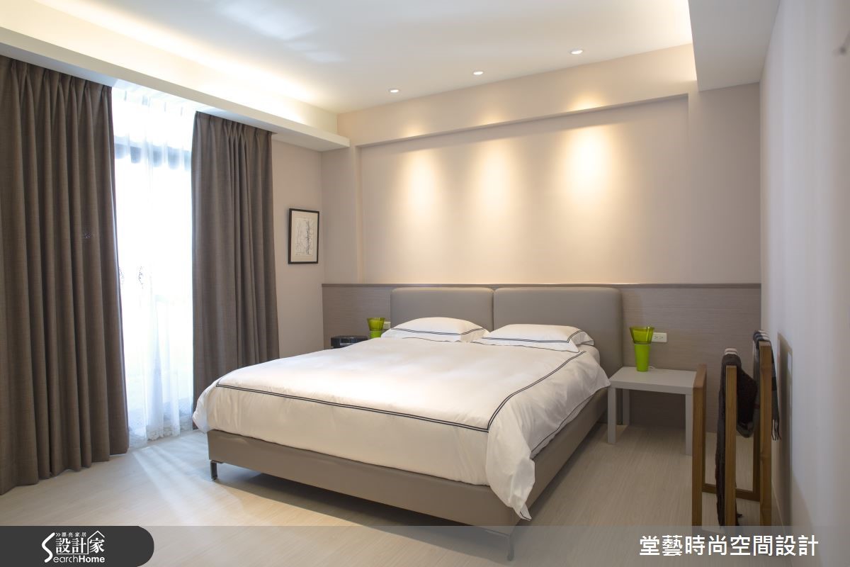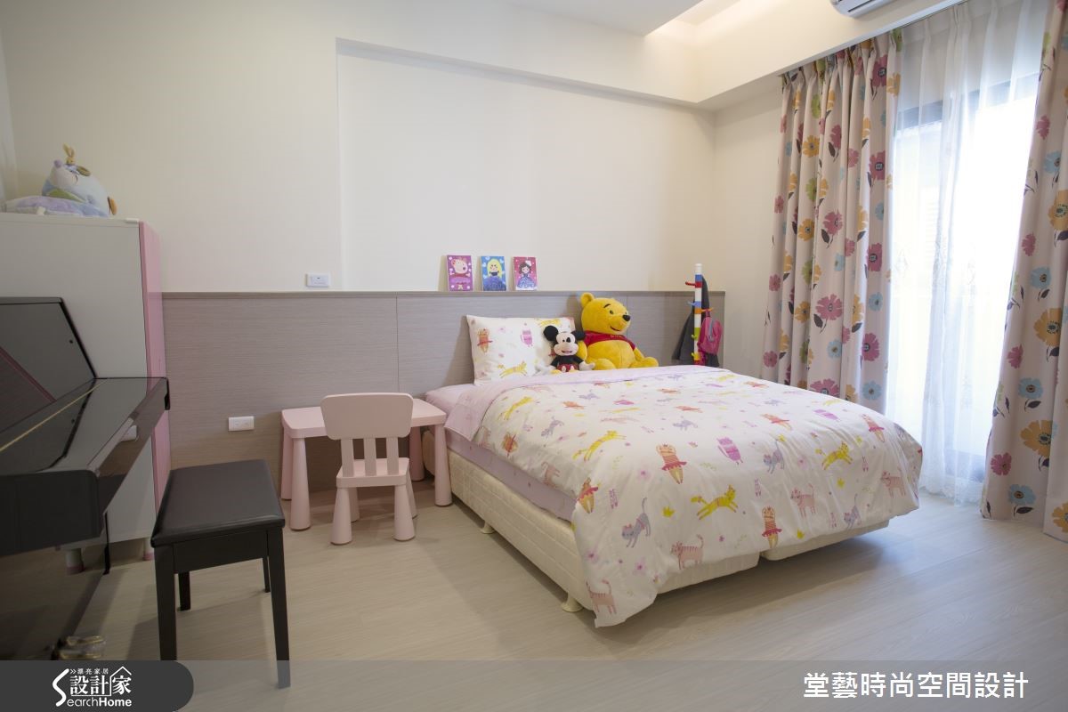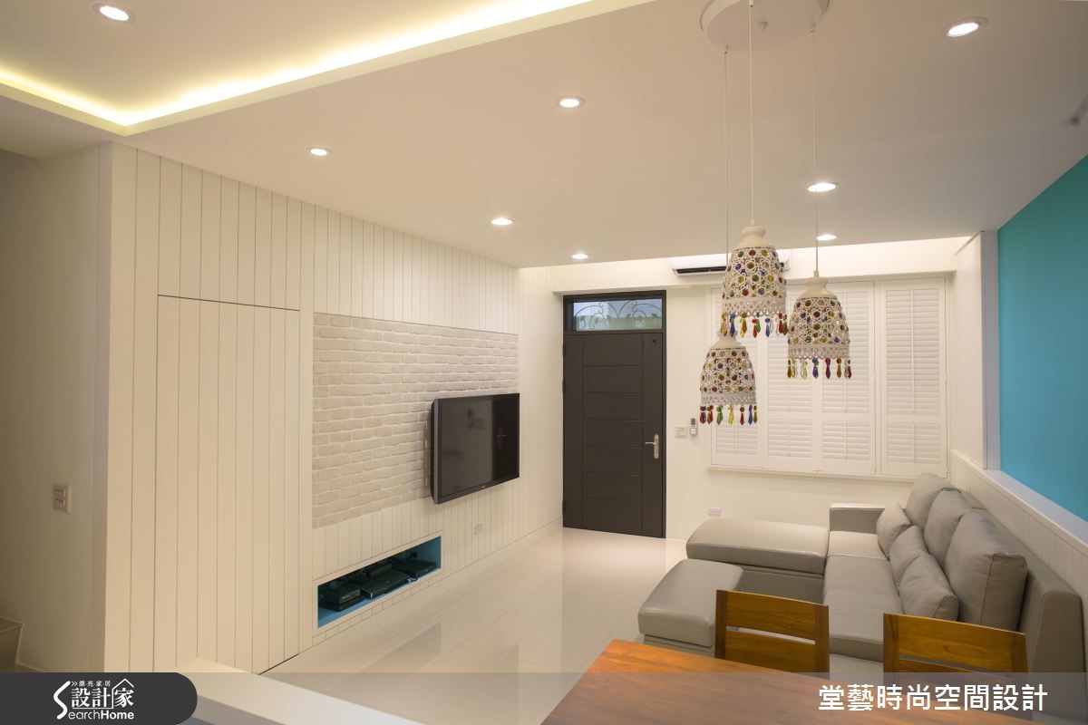 职业为飞官的丈夫喜爱刚毅的工业风格,而妻子则钟情轻乡村的温煦气息,要如何为夫妻与小女儿居住的四层独栋楼进行完整规划,同时满足夫妻两人截然不同的想望呢? 【色彩整合空间,灯饰活化气氛】客厅以天蓝与纯白构筑轻乡村基调,利用单纯的垂直线条填满墙面与背墙腰带部分,搭配文化石电视墙更添层次感。此外,善用隐藏式门片,将空间隐于无形,抹除视觉突兀感。开放式客餐厅与厨房利用矮墙作为隔屏,并利用纯白系统家具搭配天蓝色烤漆玻璃,使整个公共空间色调一致,也暗喻屋主在青天中飞翔的开朗意象。空间灯饰选搭相当用心;例如餐桌上方以缤纷的流苏吊灯增加用餐乐趣、楼梯间则以雅致的泡泡悬灯创造时尚感,透过多样的造型与光影平添变化,也丰富了日常生活气息。特别规划的阅览室呈现了轻工业风格,利用轨道照明、落地灯与单品营造个性化的私人空间。主卧卧回归简约气息,而儿童房则带着孩子独有的童心,以轻盈的软装进行修饰。