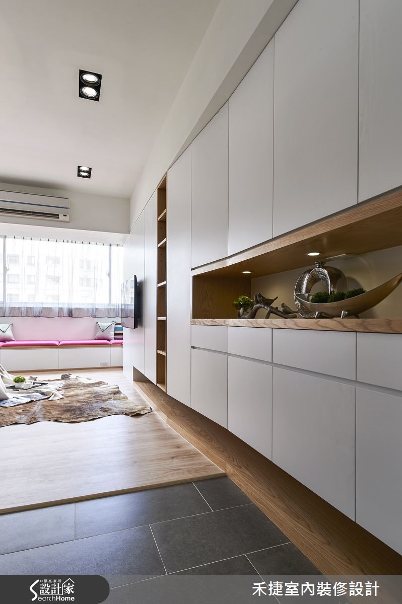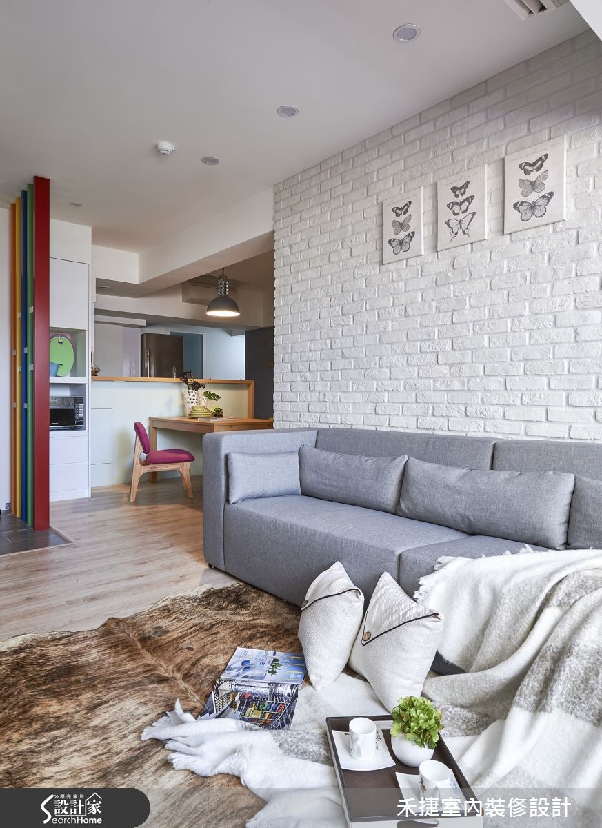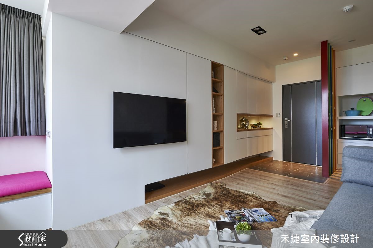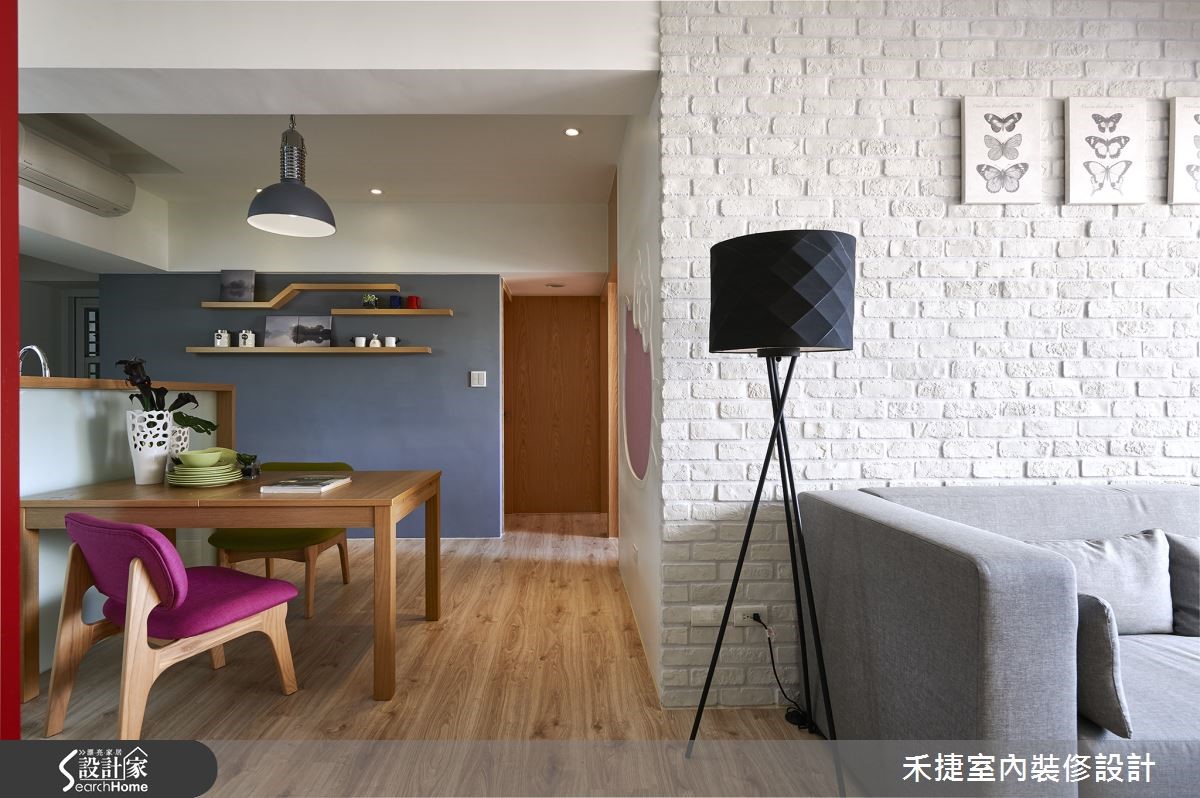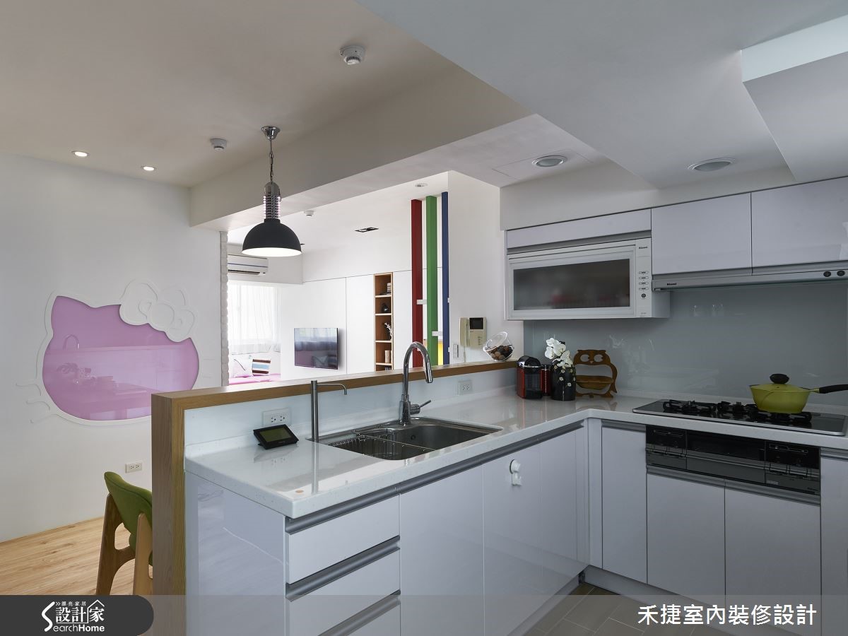面对20年老屋的改造,更要符合屋主夫妻对于格局分配与风格营造的想望,设计师以专业视角,平衡公领域与色彩的搭配,适当的保留并进行格局调度,给予夫妻两人明丽清亮的甜密窝。 【对调格局,顺畅开放动线】因应屋主对于宽敞公领域的需求,设计师巧妙以柜墙及天花高度落差,化解梁柱过多问题。保留原本三室格局,并将客浴与厨房位置对调,以利开放格局安排。入口玄关利用五彩格栅作为屏隔,并将悬柜向后推10厘米扩大空间感。利用纯白色调覆盖电视墙面与沙发背墙,接着以木作与文化石让空间更具层次。飘窗上亮丽的软件布置更增添活泼生机。开放餐厨区为女主人定制 Hello Kitty 粉红烤漆玻璃留言板,利用木作框设烤玻,区隔双人餐桌与烹饪空间,同时也与墙面的猫型烤玻相呼应。大量的纯白与木作,不仅有效放大公领域视觉,亦创造明快的生活空间。