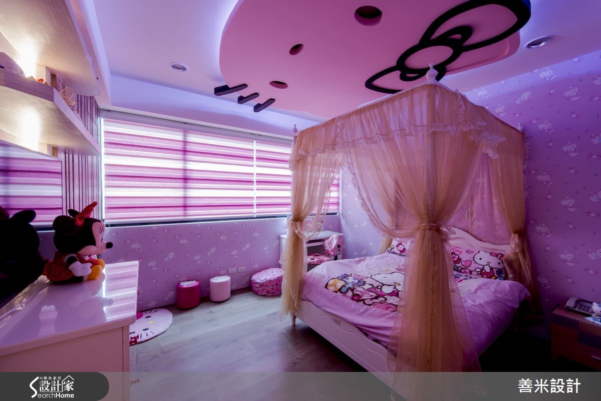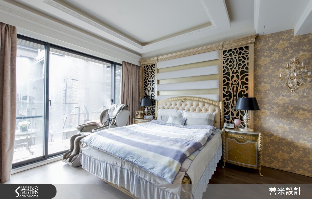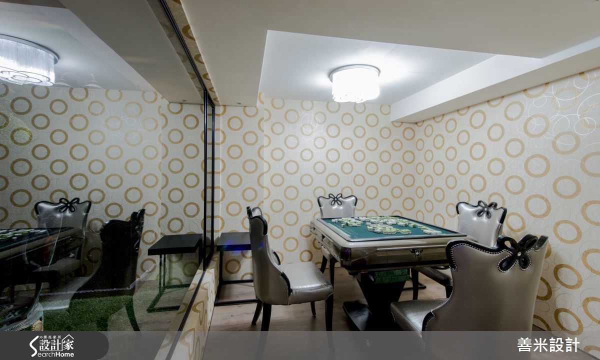 396平米的别墅,屋主期望在有限预算之内,达成欧式古典的设计风格,于是设计师针对屋况予以重整规划,以H钢构加盖与螺旋梯、美耐板及亮面贴纸建材,再搭配浪漫紫调的光影效果,营造高贵不贵的时尚格调! 【华丽紫色调打造新古典宫廷格调】厅区呈挑高格局,透过窗帘、沙发等铺述华丽的紫色魅力,并结合大理石、水晶灯等,构筑令人惊艳的宫廷格调,同时于沙发墙加入立体闪电状造型,天花妆点细致线板,体现现代几何、古典语汇的交融。【半圆形吧台塑造奢华用餐质感】厅区一侧以半圆型吧台规划开放餐厨领域,兼具轻食与料理机能,吧台内部融入灯光型塑量体轻盈感;麻将间墙面则铺陈普普风壁纸,替平凡空间注入活泼视感,外侧采人工草皮搭配红砖元素做出户外造景,结合按摩设备与庭园椅,打造惬意放松的休憩场域。【主卧以金色雕花创造酒店级感受】主卧注入金色主调,并融入雕花、线板、壁纸、古典床头柜等元素,赋予雍容具对称美的床头表情,配置弹性玻璃拉门界定睡眠与更衣空间,在自在动线、宽阔场域之中,挹注高级酒店般星级待遇!