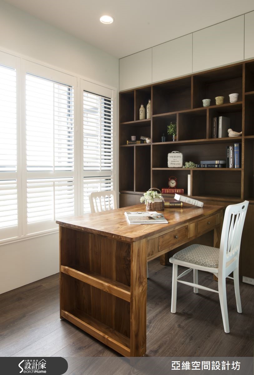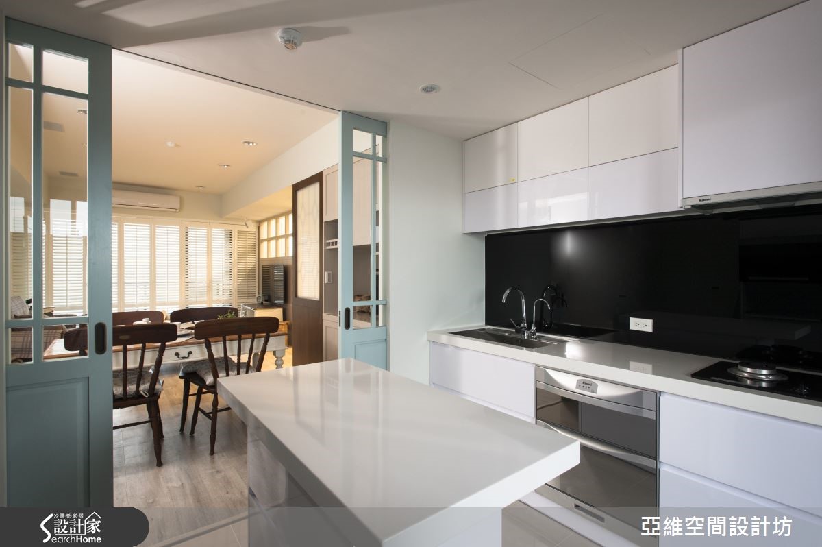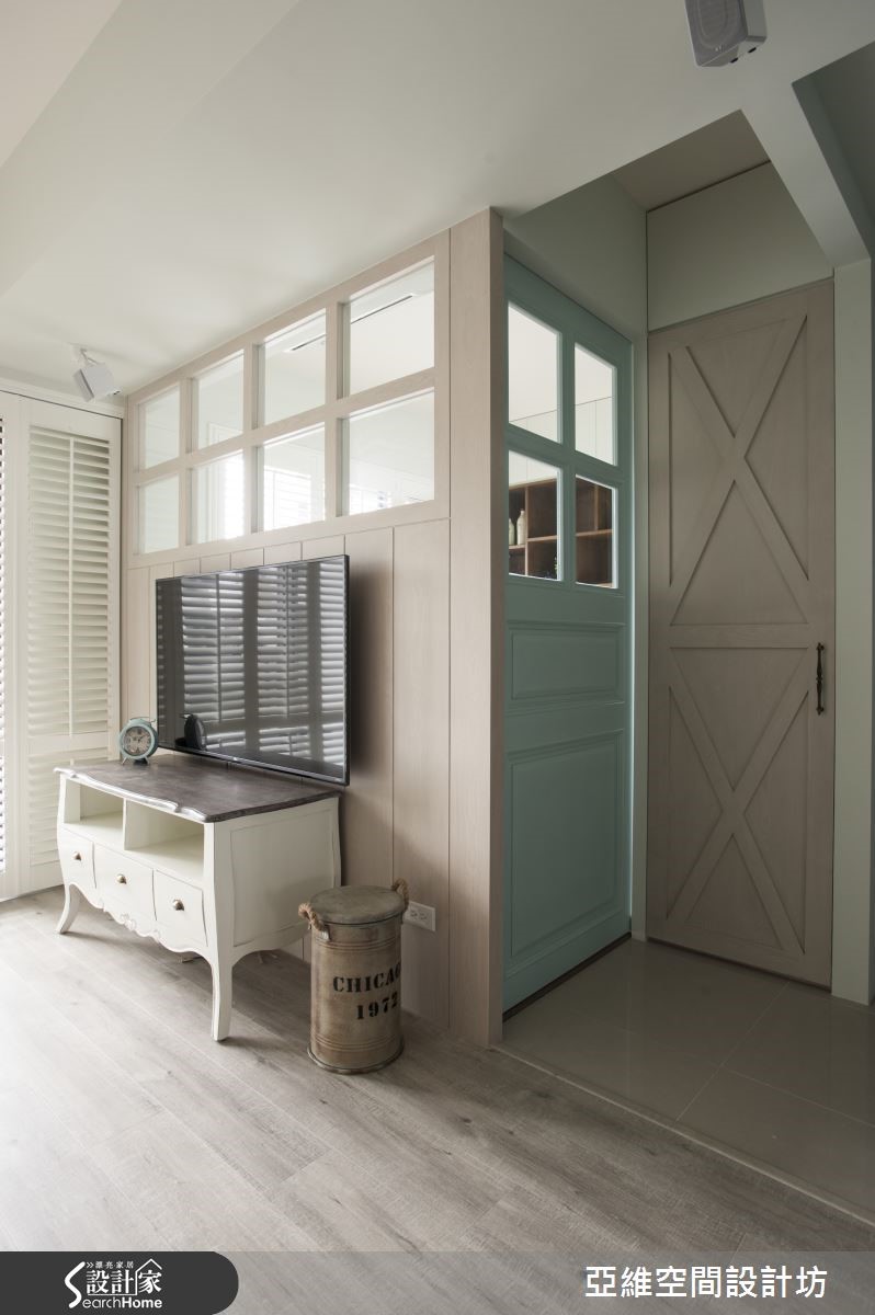 在此116平方米的住宅内,设计师即加入日光、百叶窗、格子门、木质调等呼应春天气息,打造出温煦的空间表情,且透过柜体铺排挹注机能,将线条与立面整合得利落干净,让家盈满宜人氛围。【格子布沙发,涌现美式乡村情景】客厅做出大面百叶窗引导充沛日光,且在立面妆点浅灰色漆料,不着痕迹地与木地板相契合,搭配舒适的格子布沙发,自然涌现美式乡村情境,电视墙上方加入了清玻材质,让厅区可与后方书房保有通透、共享自然光线。【浅蓝、淡紫,引注春天气息】画蓝色格子门呼应鞋柜色调,将餐厅、厨房予以区划,门扇融合玻璃保有穿透视感,并规划展示格柜,增强置物机能;寝卧于床头墙铺陈花漾墙纸,床尾整合柜体,型塑简练利落线条,透过浅蓝、淡紫的色调比例,引注春天的的清新质感!
