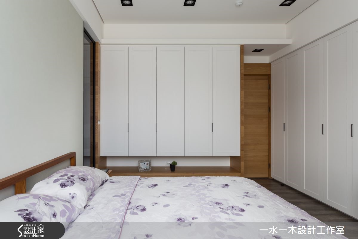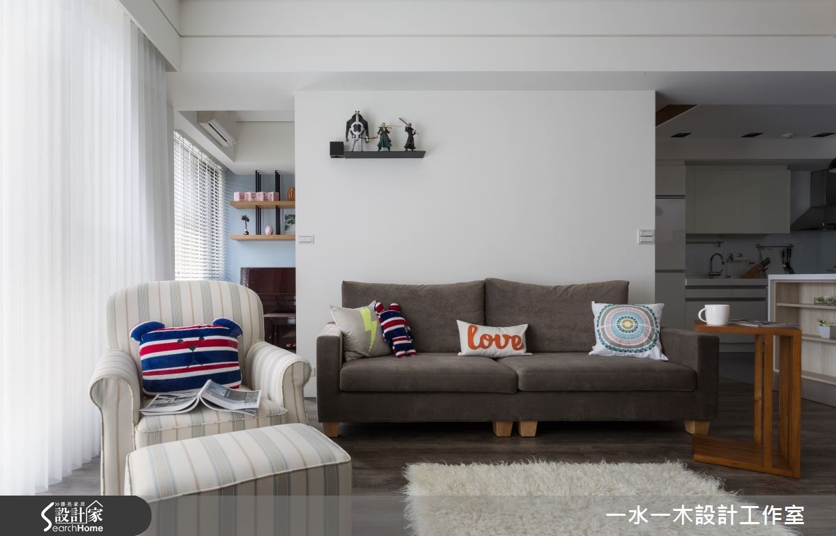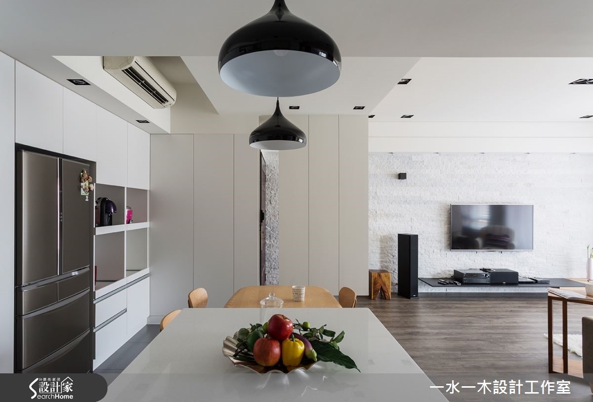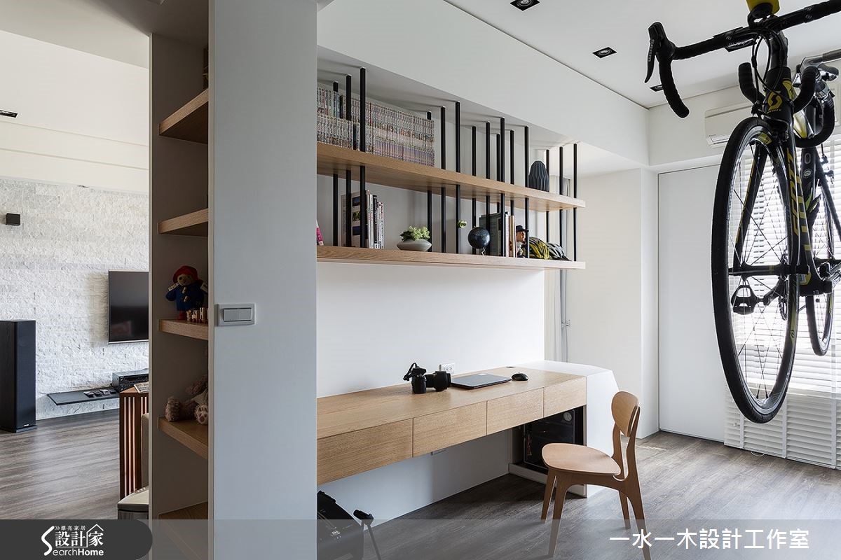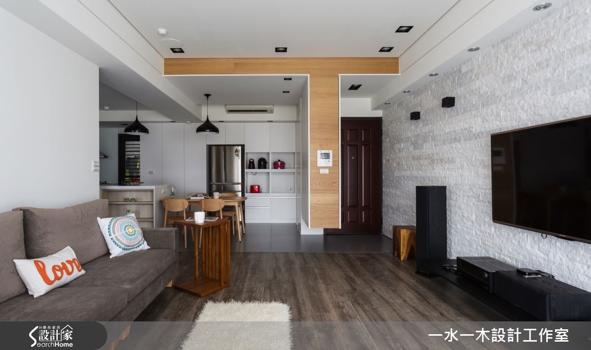 跳脱隔断的局限思维,适度解放居家空间中界线,将公共空间放大,并赋予弹性动线,生活也更加自在不受拘束。纯白色系的基底再加入木元素装饰,添加自然清新感,让居住者徜徉在无压舒适的空间中。一回家,烦恼都消散无踪了。 【柜体悬空设计,减轻视觉沉重感】进入室内,便能感受到纯净色调和宽广空间带来的舒适度。玄关与餐厅运用鞋柜区隔,下方悬空的设计减轻视觉沉重感,柜体侧面贴覆木皮,形成趣味的T字线条。客厅墙面采用文化石铺陈,石材的粗糙质理具有丰富视觉的效果。客厅后方也规划了开放式书房,领域间的动线彼此互通,创造生活无拘束的自由度。书房外的侧边墙面规划为收藏品的展示收纳,将屋主的玩偶、公仔珍藏摆入,满足小小童心。卧室则以纯白色收纳柜与木质色系搭配,营造兼具机能与舒适性的私领域。