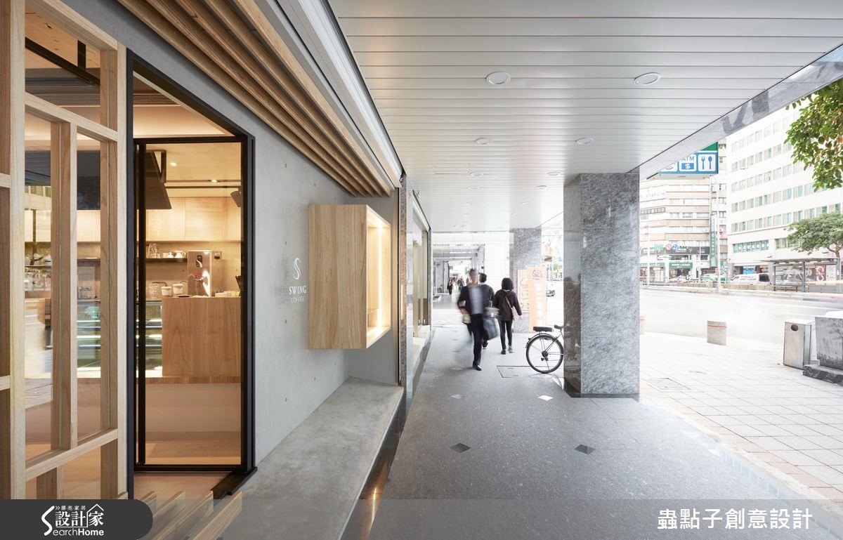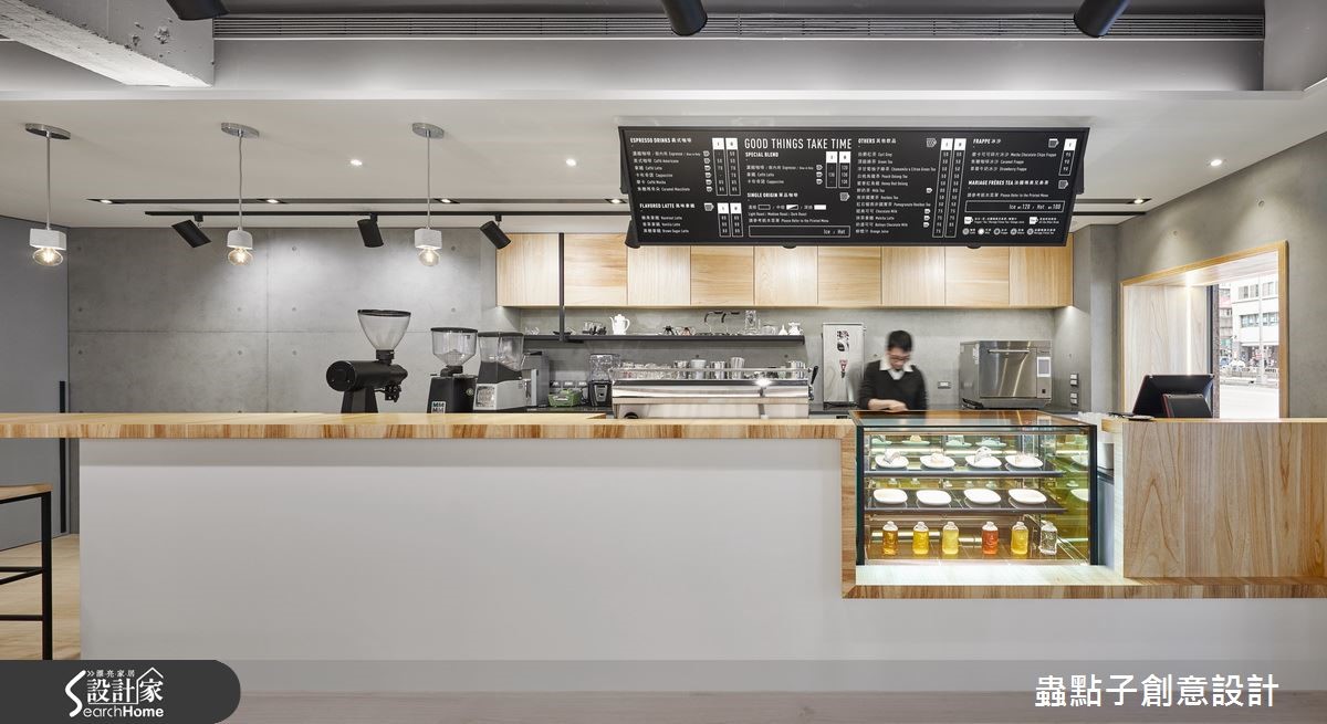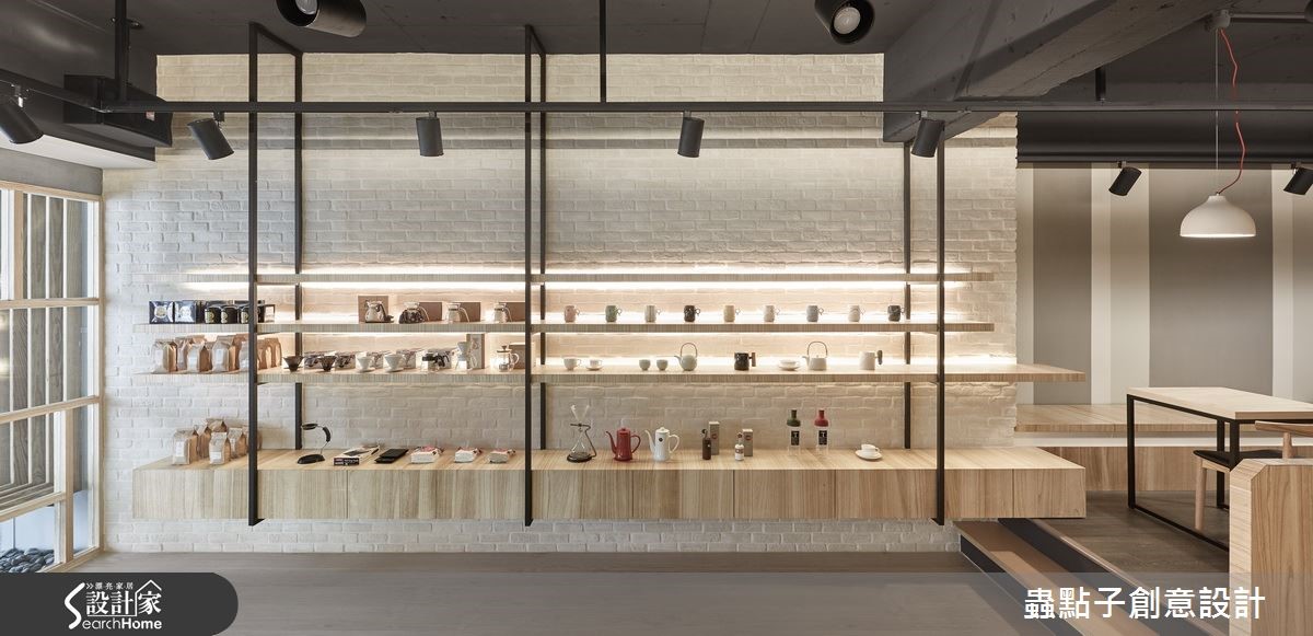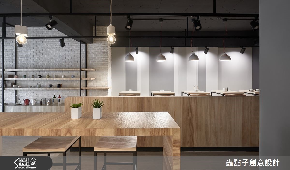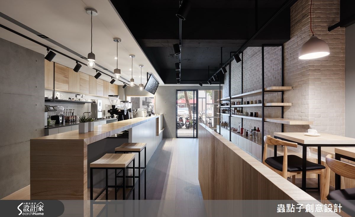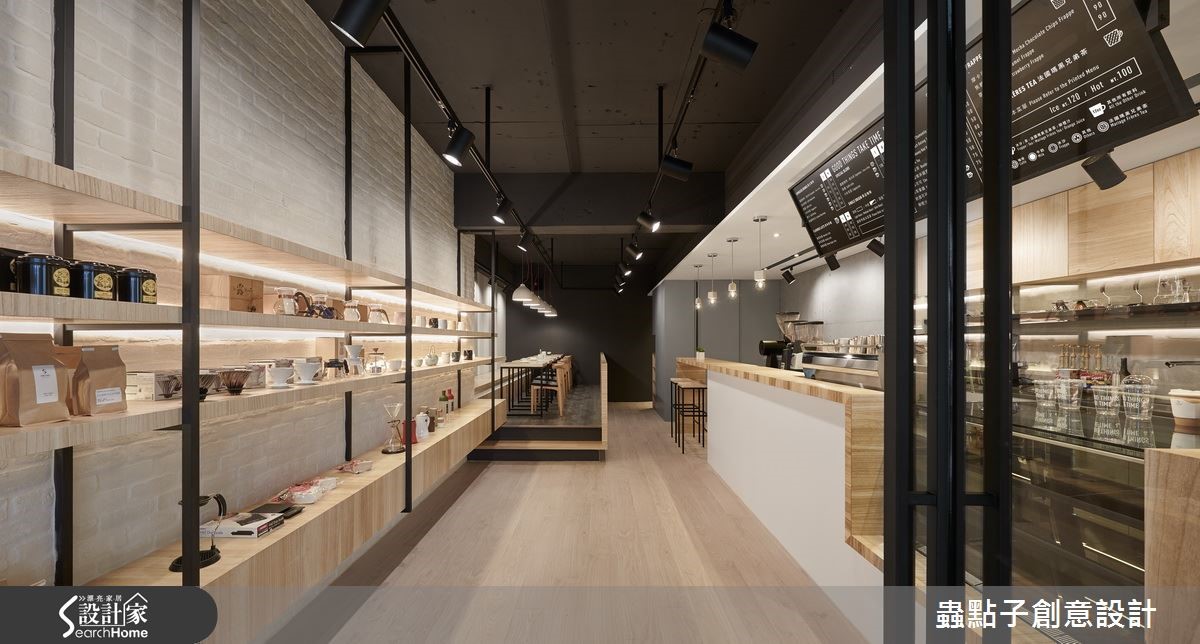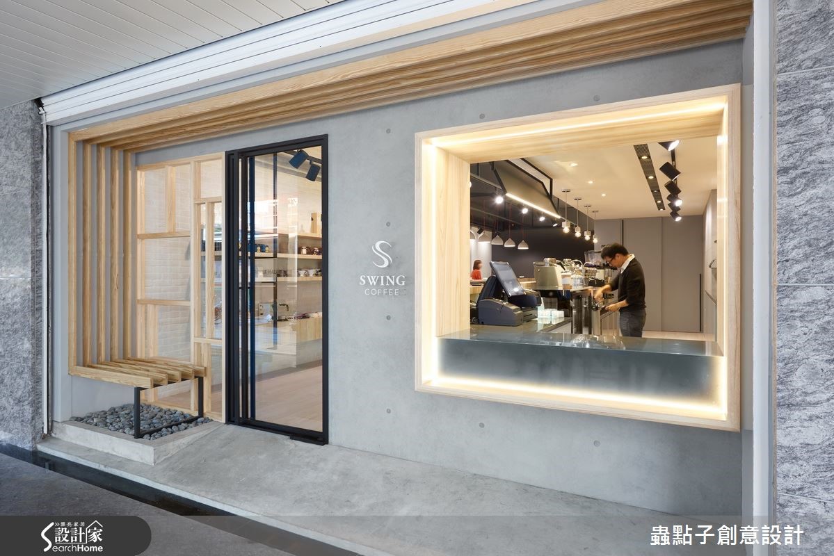 这是一对年轻夫妻的咖啡店梦想,两人找来设计师为其规划店内空间,于66平方米场域内注入Loft风格,除了规划一般餐台,更于角落加入内用座位区,透过灰阶与木质建构轻质视感,让咖啡店多了居家人文味!【多元材质,创造温馨的空间氛围】外观以质朴灰阶营造清水模效果,墙面镶嵌简约立体字样,一旁则架高地面、装饰小圆石营造庭园悠闲感,并以木格栅打造户外候位座椅,连结延伸至天花做出框架造型,阐述静谧且富层次感的门面印象。店内则以白文化石铺叙一侧立面,结合灯光、黑铁与木质展示层架,铺陈复古质感的轻工业风,另一端吧台则连结备餐台,采流畅转折的木作线条包覆,形成自然的导引动线。用餐区则位居一角,架高阶梯且规划整排矮墙界定场域,透过木地板深浅色差强调领域分属,除了配置木餐桌椅,也在靠墙处规划整排座位,墙面则以色块做层次处理,搭配灯光照映,使低调灰阶也具有生动的韵律效果!