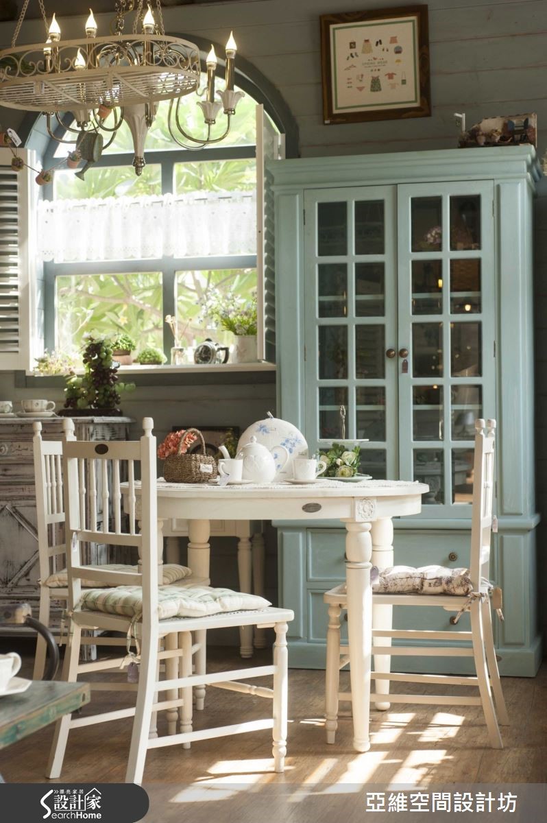 水蓝柜面与白色线板铺陈,乡村宅更显温柔