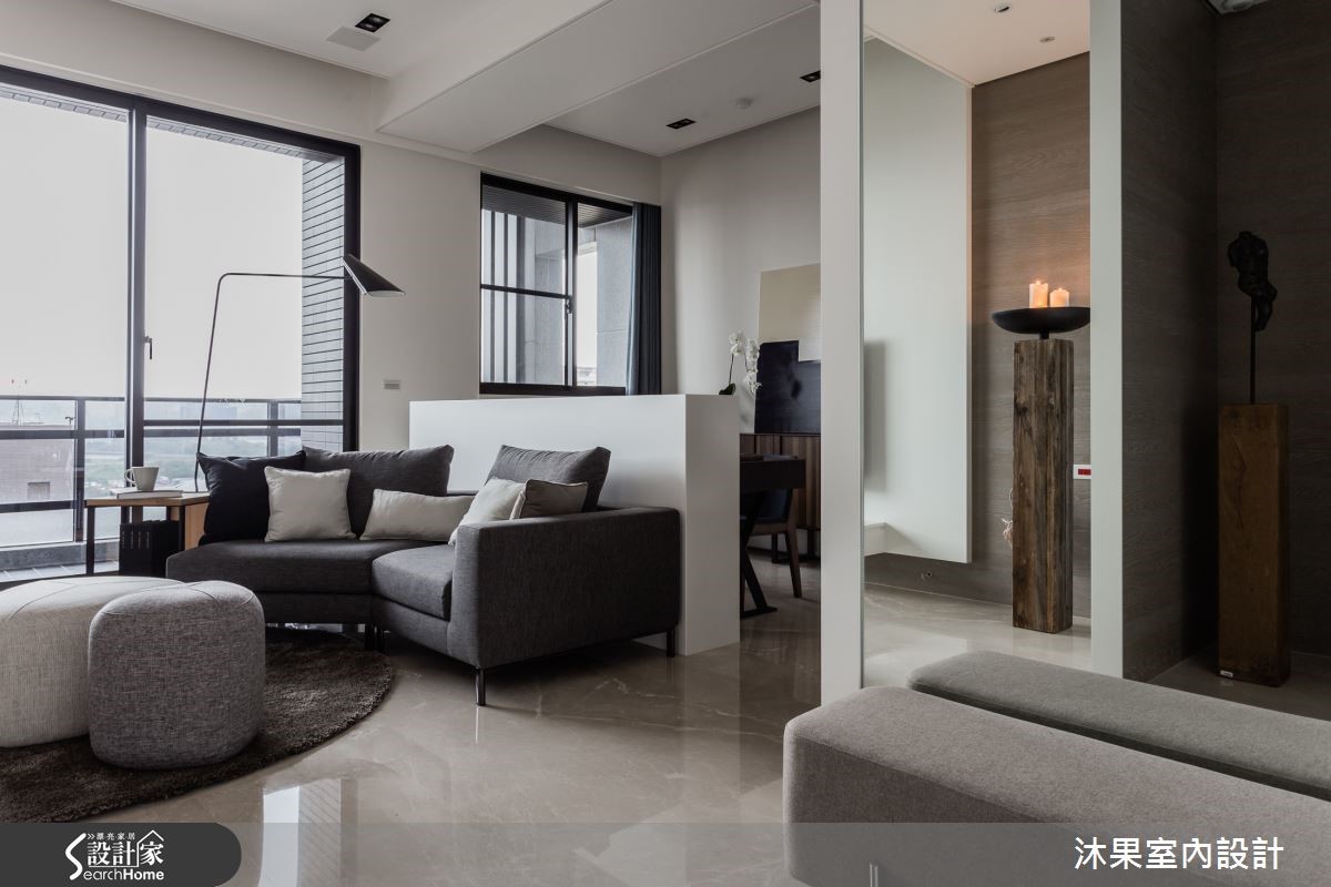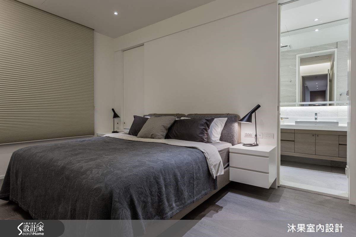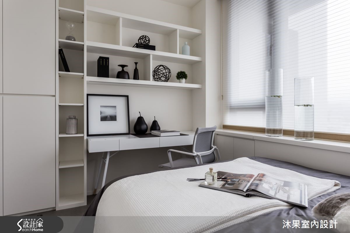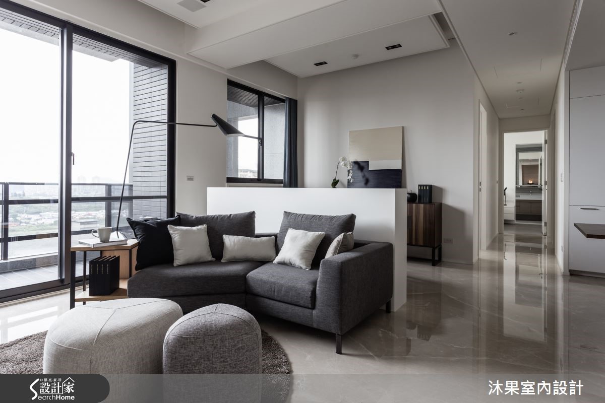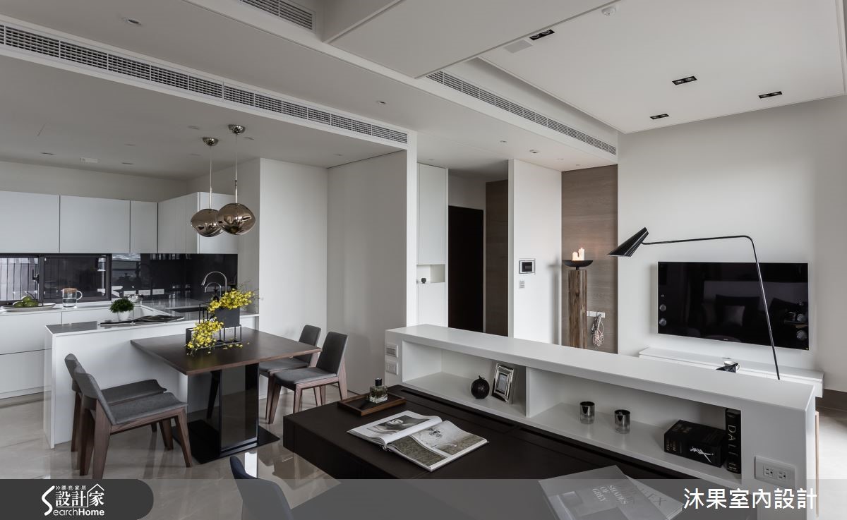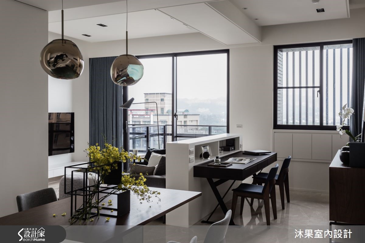 像是从美国影集出现的清新空间,拥有一大面的落地窗,搭配简约黑白色系,以及合宜的空间规划,展现出干净明快的时尚风度。至於家具布置上,则利用织布材质与柔和灯光的装饰,增添日常生活的温馨感。【造型天花,创造高挑深邃感】走进公共区域,利用梁柱区分客厅与书房的界线,而天花板边缘留下沟缝,让空间看起来更加深邃高挑。沙发背墙同时也是书房的收纳格,创造机能。开放式空间的串接,也更方便父母照看孩子的功课进度。而厨房设置中岛吧台并连结餐桌,让一家三口更贴近彼此。穿越廊道来到臥室,延续一贯的低调内敛的色彩安排,天花板加嵌光灯照,消弭大樑的压迫感。此外也纳入屋主的收纳需求和卫浴空间,将门板改为可隐藏于墙后的拉门设计,除了节省空间,动线也更加顺畅无阻。