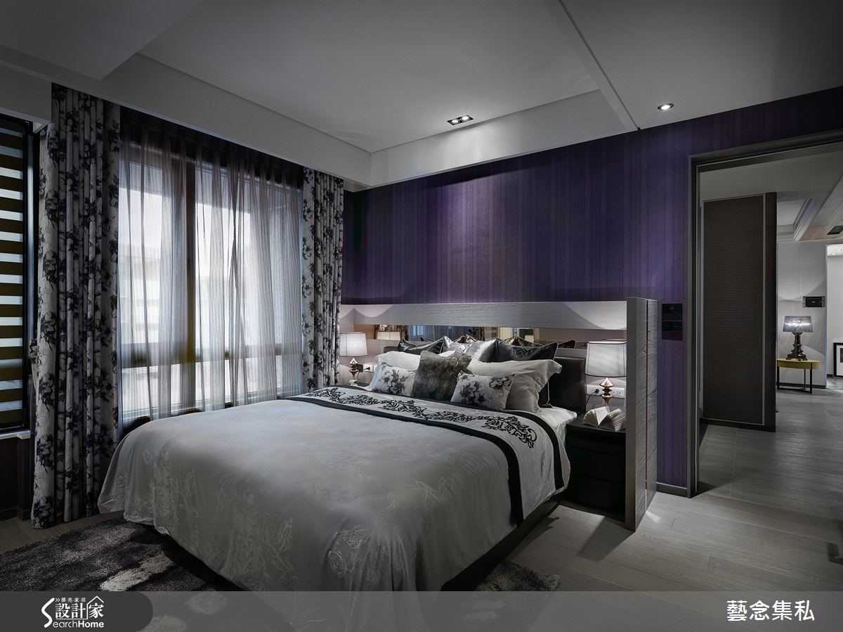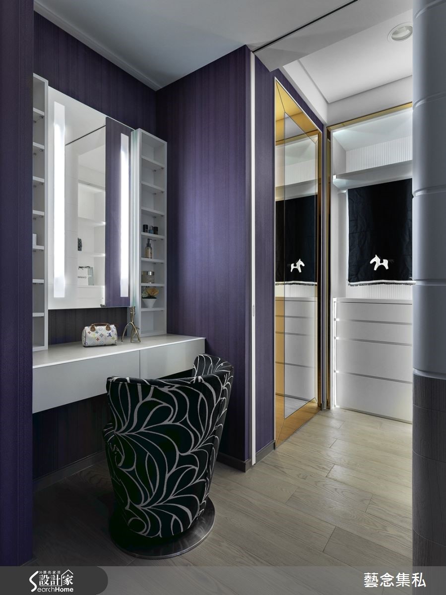 215平方米含有阳台的住宅空间,设计师让公领域呈开放格局,使客厅、餐厅、厨房与和室相互连贯通透,打造出一人独享的宽敞场域,同时考虑到长辈偶尔暂住,于是重整私领域机能,加入更衣与梳妆空间,打造更为精致的起居生活。【陈设软装让家的表情更多彩】设计师于客厅加入屋主指定的地图墙设计,让立面表情更显精彩,并透过色调挹注低奢的清丽,加入软件轻柔妆点,使空间洋溢优雅的人文质感,并在电视墙加入高级皮革材质,透过双入口回字动线规划,让厅区、和室之间享有流畅穿透的动线。【多机能的动线设计,生活好弹性】餐厅则在天花加入高低不齐的立体木作设计,形成导引视线效果,同时内嵌灯光做出简约感灯饰,餐椅则可见奢华的动物皮纹,展示时尚品味与个性;电视墙背向是和室专用的收纳立面,一旁将和室折门收整隐藏,打造开阖自如的弹性场域,兼具隐密及开放性。