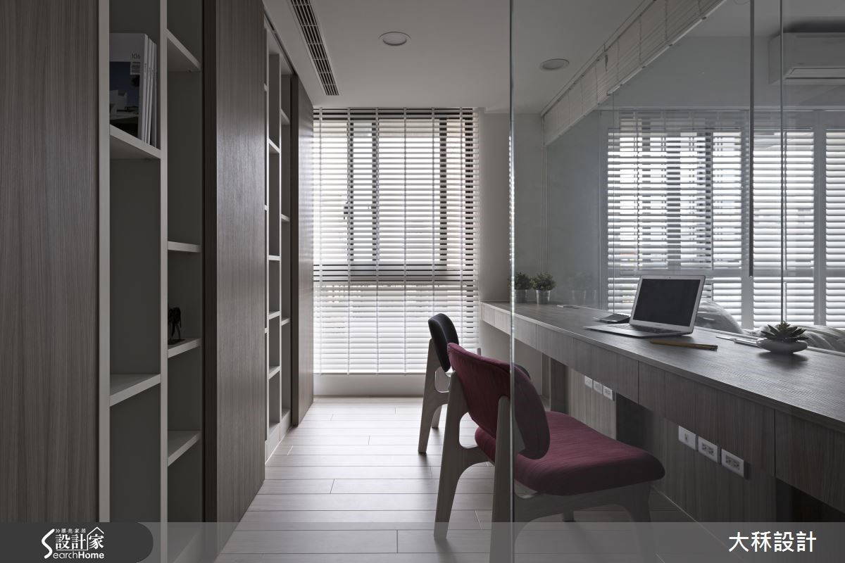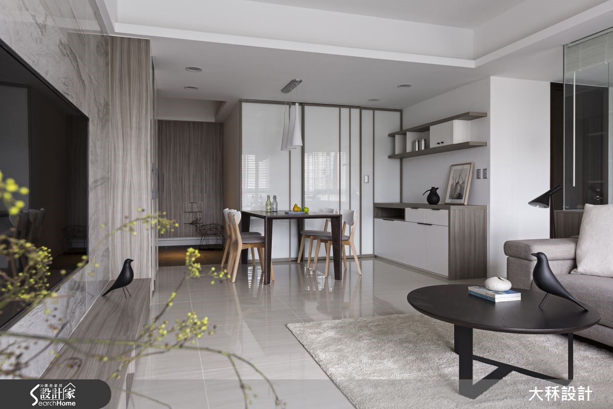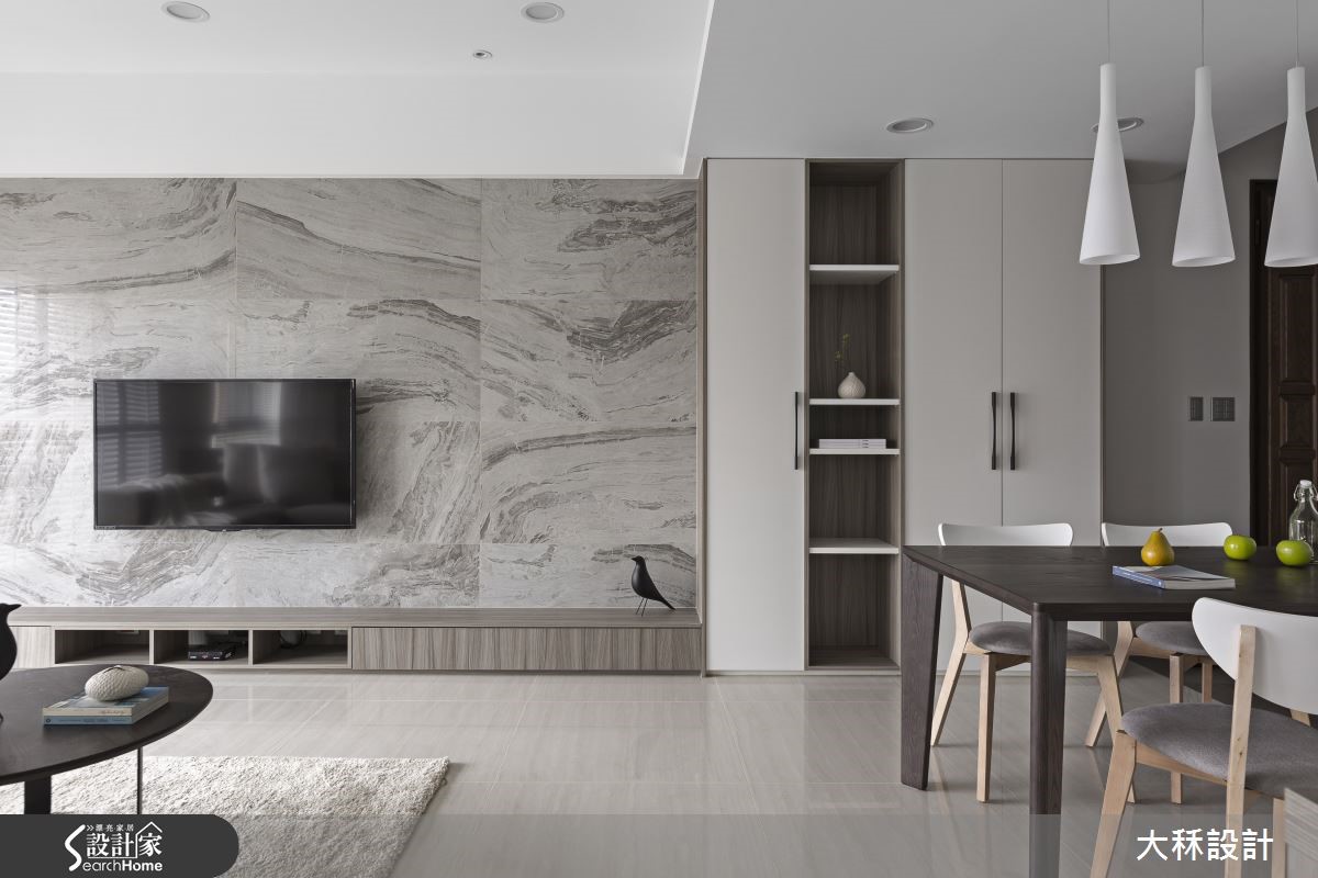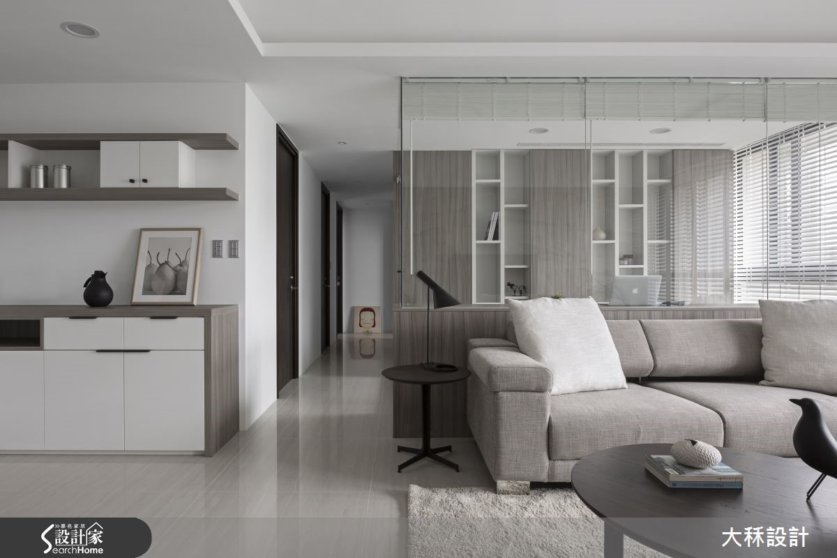 188平方米的住宅空间,设计师以简约清爽的现代风格,透过木皮、砖材等呈现低调灰阶的视觉感,同时拆解隔断打造通透视野,让采光、灰调相得益彰,创造沉稳不沉重的美好温馨感。【隐藏式设计,延展居家视野】入口处地坪铺设深色进口磁砖,界定出玄关与室内场域,并规划隐藏衣帽鞋柜于背墙,将柜体不着痕迹地隐于木纹之间;一旁则是餐厅领域,以优白玻璃作为收纳柜材质,巧妙将厨房入口隐藏其中,营造简约又聚焦的立面设计。客厅则采用建材、软件营造灰阶层次,且考虑预算限制,以银灰石砖材打造犹如大理石质感的电视墙,并拆除客厅后方隔断,以清玻璃作为墙面,不仅扩大整体空间感,让采光可彼此互通,同时藉由通透的格局设定,让生活中充满对话与互动可能。