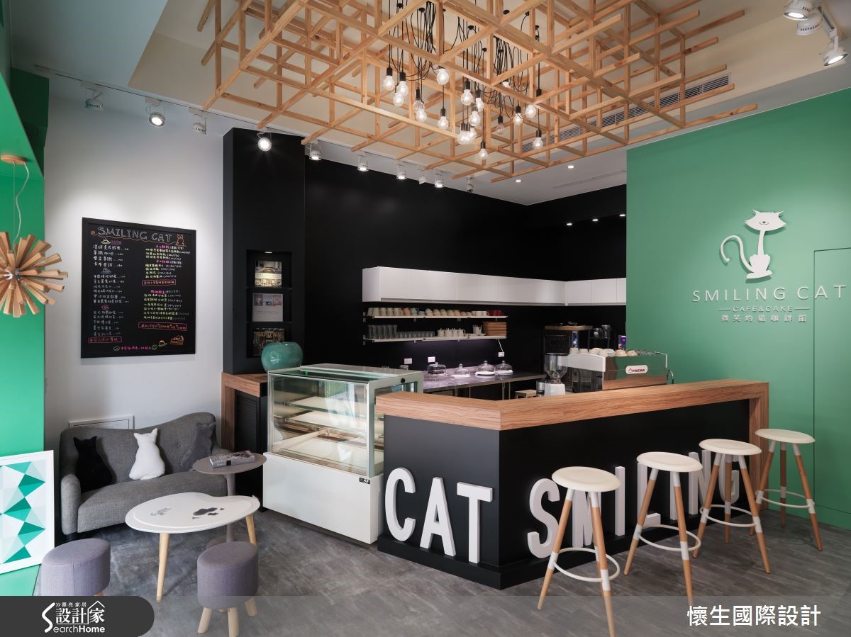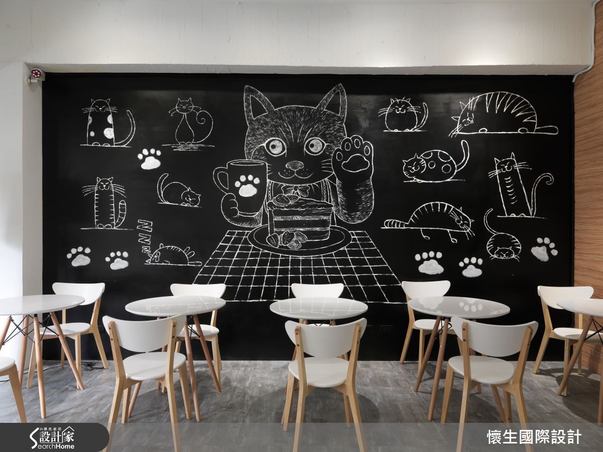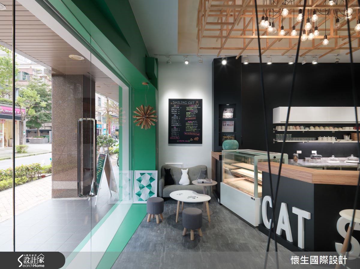 放假就到咖啡厅里享受美味的甜点和咖啡吧!从走进室内开始,清爽薄荷绿搭配浅木色系,相当有清新感受,很适合找个下午,与好姊妹们相约,开心地享受舒适自在的氛围。【大幅玻璃窗,引渡明亮阳光】楼下利用透明玻璃窗将阳光引渡,让柜台及吧台区浸沐于明亮的光感中,天花板以木质立体格栅凸显视觉焦点,再加入温暖明晰的灯光,点亮清新氛围。通往二楼的楼梯侧边,彷佛积木般层层堆叠,相当具有活泼童趣。【黑色线性交错,营造时尚质感】而除了普通的扶手设计,设计师也加入黑色不规则线性交错穿插,保留楼梯间的采光,形成利落划分的视觉效果;沿着指标向上前进,以几何切割的缤纷色块迎接顾客雀跃期待的心情。【黑板墙作装饰,增添涂鸦趣味】木质色调轻柔地包覆了卫生间,并降低视觉上的突兀感,二楼主要配置为公共座位区,以大幅黑板墙作为墙面,绘上可爱猫咪图样意象,更增添俏皮趣味。