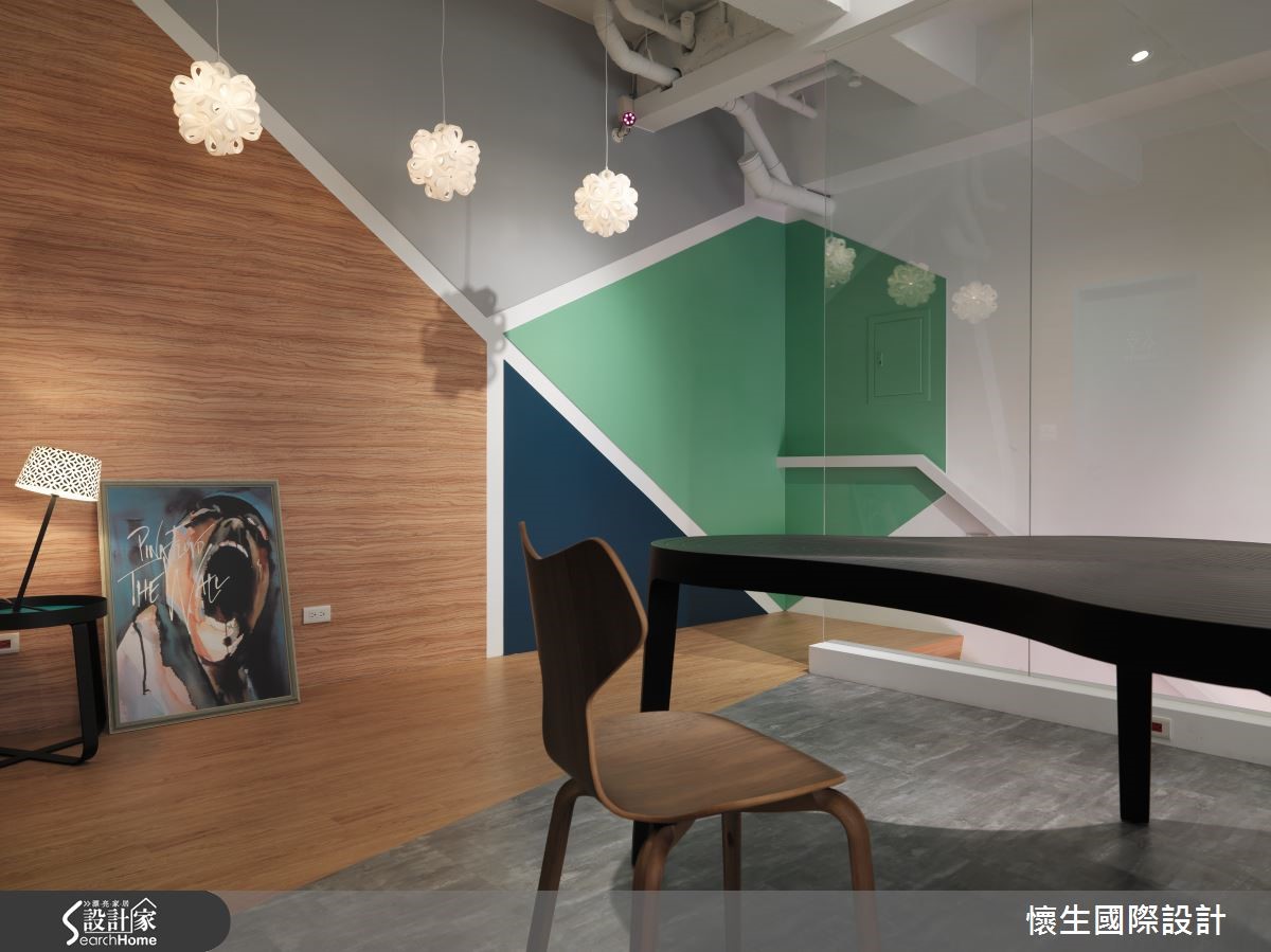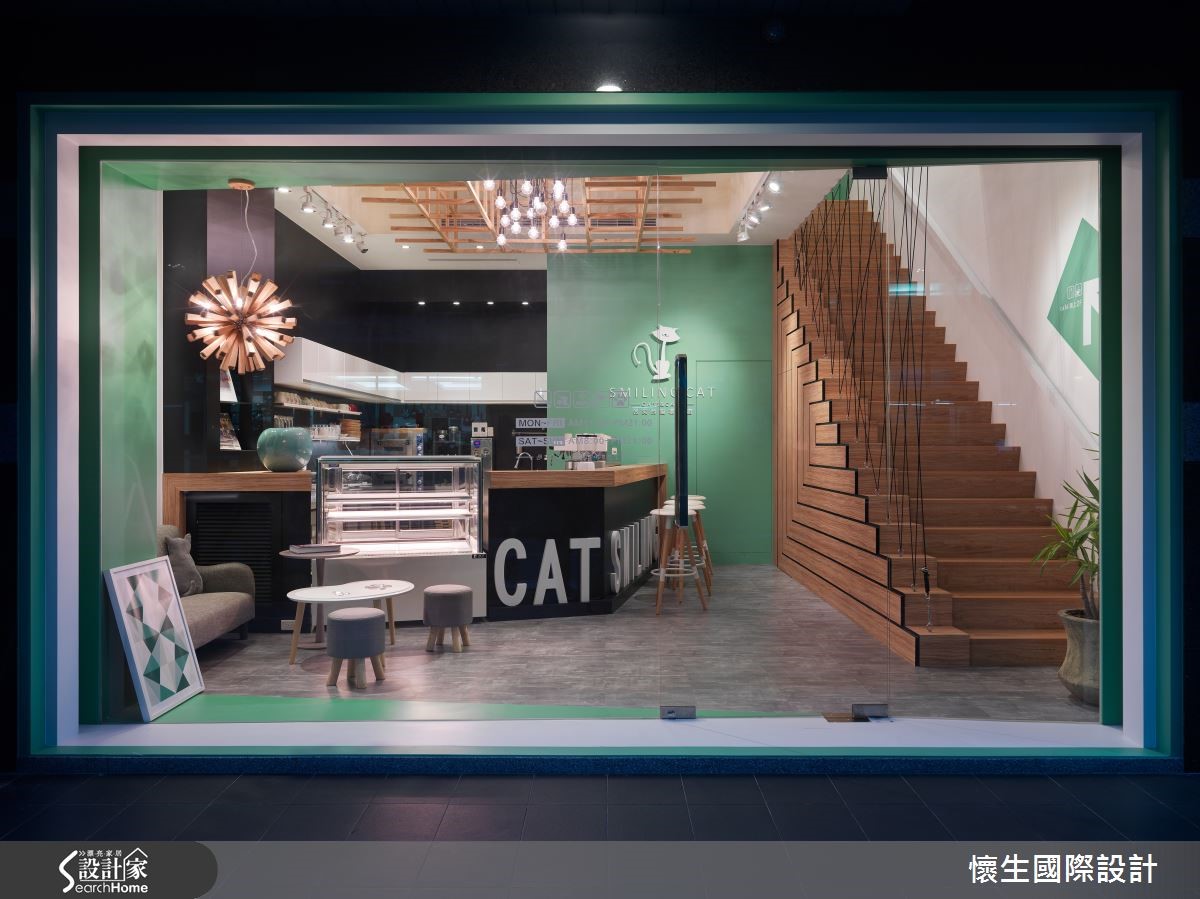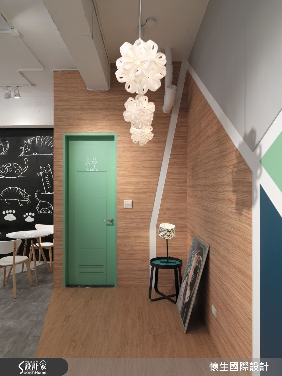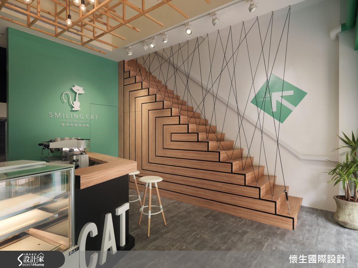 放假就到咖啡厅里享受美味的甜点和咖啡吧!从走进室内开始,清爽薄荷绿搭配浅木色系,相当有清新感受,很适合找个下午,与好姊妹们相约,开心地享受舒适自在的氛围。【大幅玻璃窗,引渡明亮阳光】楼下利用透明玻璃窗将阳光引渡,让柜台及吧台区浸沐于明亮的光感中,天花板以木质立体格栅凸显视觉焦点,再加入温暖明晰的灯光,点亮清新氛围。通往二楼的楼梯侧边,彷佛积木般层层堆叠,相当具有活泼童趣。【黑色线性交错,营造时尚质感】而除了普通的扶手设计,设计师也加入黑色不规则线性交错穿插,保留楼梯间的采光,形成利落划分的视觉效果;沿着指标向上前进,以几何切割的缤纷色块迎接顾客雀跃期待的心情。【黑板墙作装饰,增添涂鸦趣味】木质色调轻柔地包覆了卫生间,并降低视觉上的突兀感,二楼主要配置为公共座位区,以大幅黑板墙作为墙面,绘上可爱猫咪图样意象,更增添俏皮趣味。