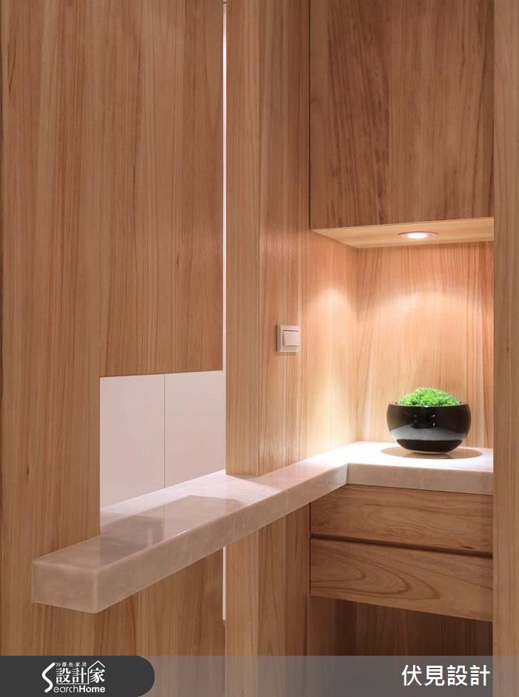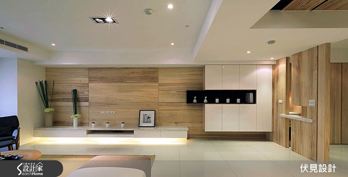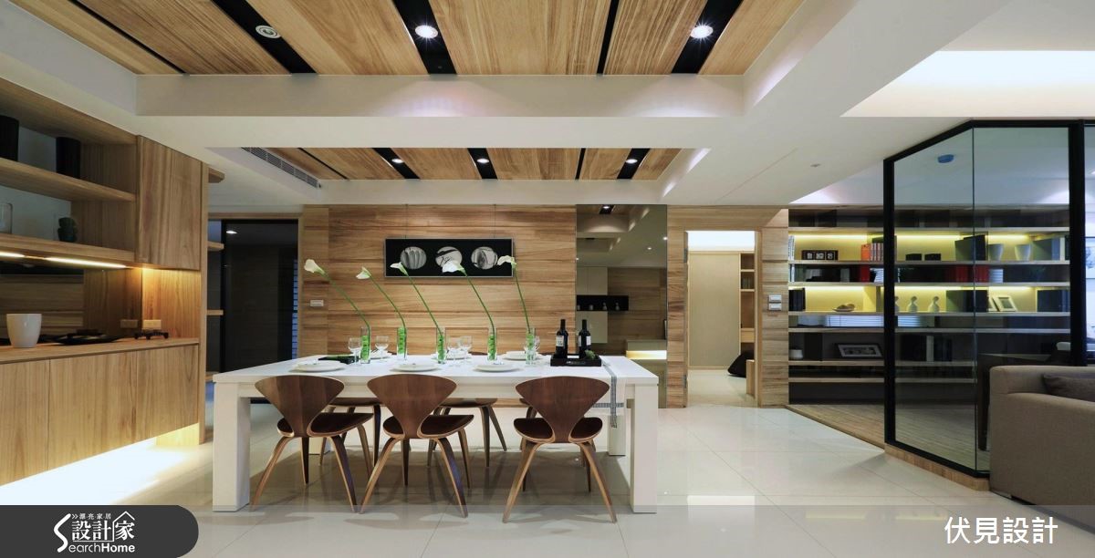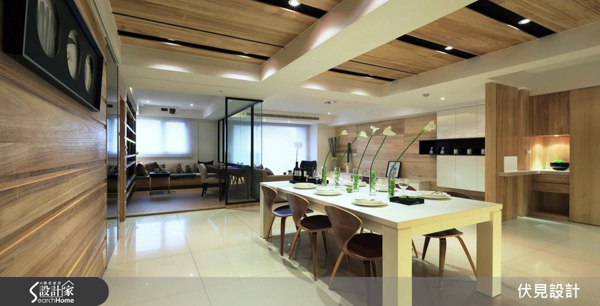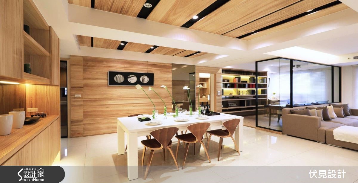 设计师依屋主生活需求格局,给予开放式与通透隔断规划,让空间充满明亮视野,且加入淡雅木皮与灯光妆点。让居宅在大器之余,充满温馨氛围。【统一材质,空间视觉更俐落】走进居家,可见全室木质颜色、纹理的一致性,让空间少了复杂感受、多了舒适氛围。且采用木皮陈设整个客厅电视主墙,其间穿插白色与黑色展示凹柜,配置光源强化轻盈感受。沙发背墙以玻璃隔断取代,串联起客厅、书房视线,让书墙成为空间中的焦点。餐厅则延续一贯木质色调,大面积地运用于天花、柜体、墙面等处,衬托出白色长餐桌作为空间的中心。且在墙面局部点缀镜面材质,延伸放大空间视觉,展现出宽阔的生活。