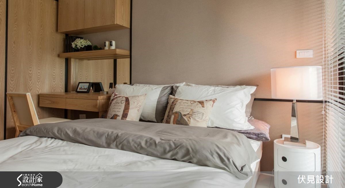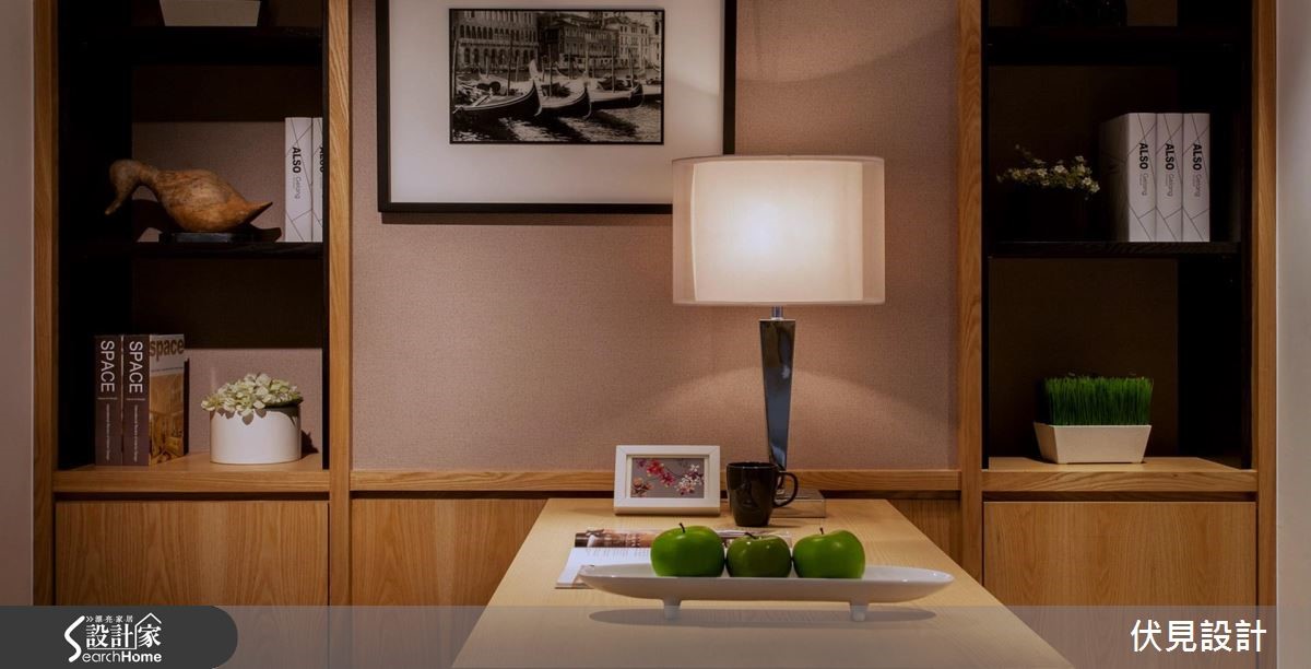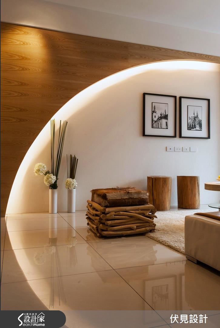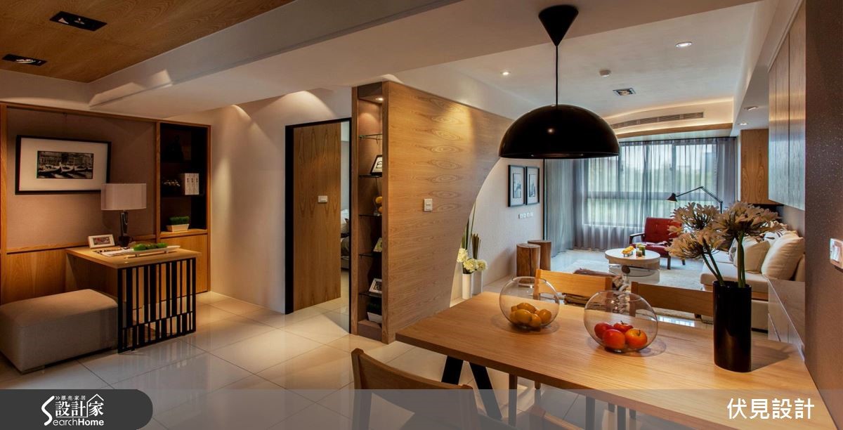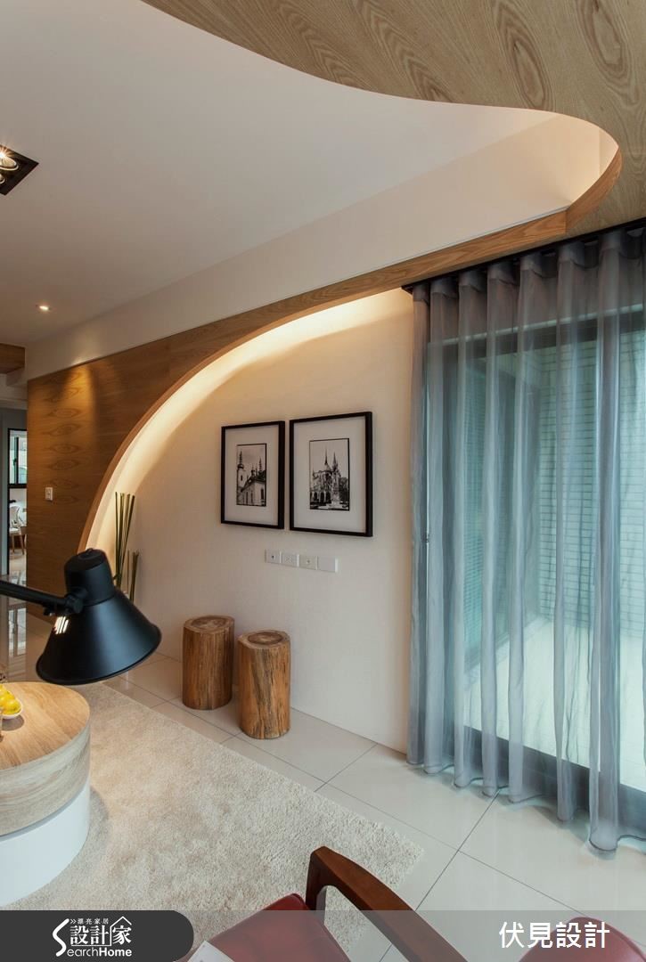 客厅主墙安排一道柔性弧线,并藉由嵌灯加强光影层次,以优雅的姿态,顺着墙面向上延伸,如涟漪般向天花与角落延伸。天花边缘则延续像是裙襬的波浪曲度,改变了冷硬方正的空间,更增添温柔浪漫的情调。【双开窗客厅,引入明亮光线】公共区域采开放式设计,搭配木质调的温润特性,在日常生活中融入自然元素的舒适感。拥有双面开窗的客厅,拥有大面采光,也彷佛浸沐绿意的怀抱中。沿着弧线,来到转角处,安排为展示收纳区,利用灯光点缀,兼具艺廊展示柜与空间界定功能。餐厅与阅读区则设定在同一区域,动线串连上也更流畅,简约的餐桌和书桌,降低视觉沉重感。另外,书桌旁的书柜,以优雅的色调与平衡对称的美学呈现,加上一幅画作妆点,打造知性迷人的生活风景。