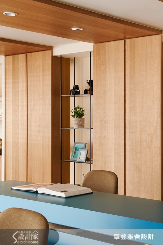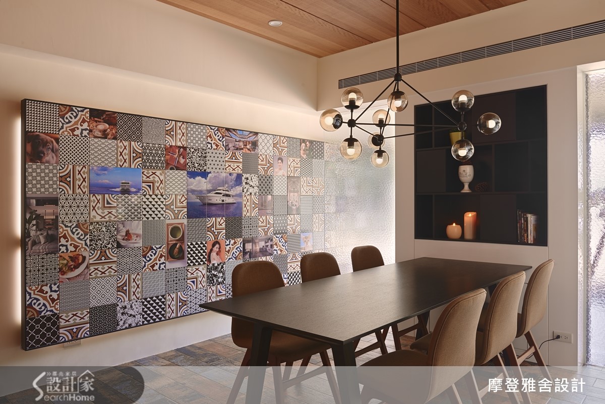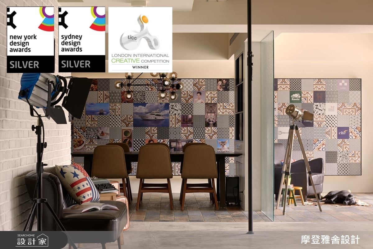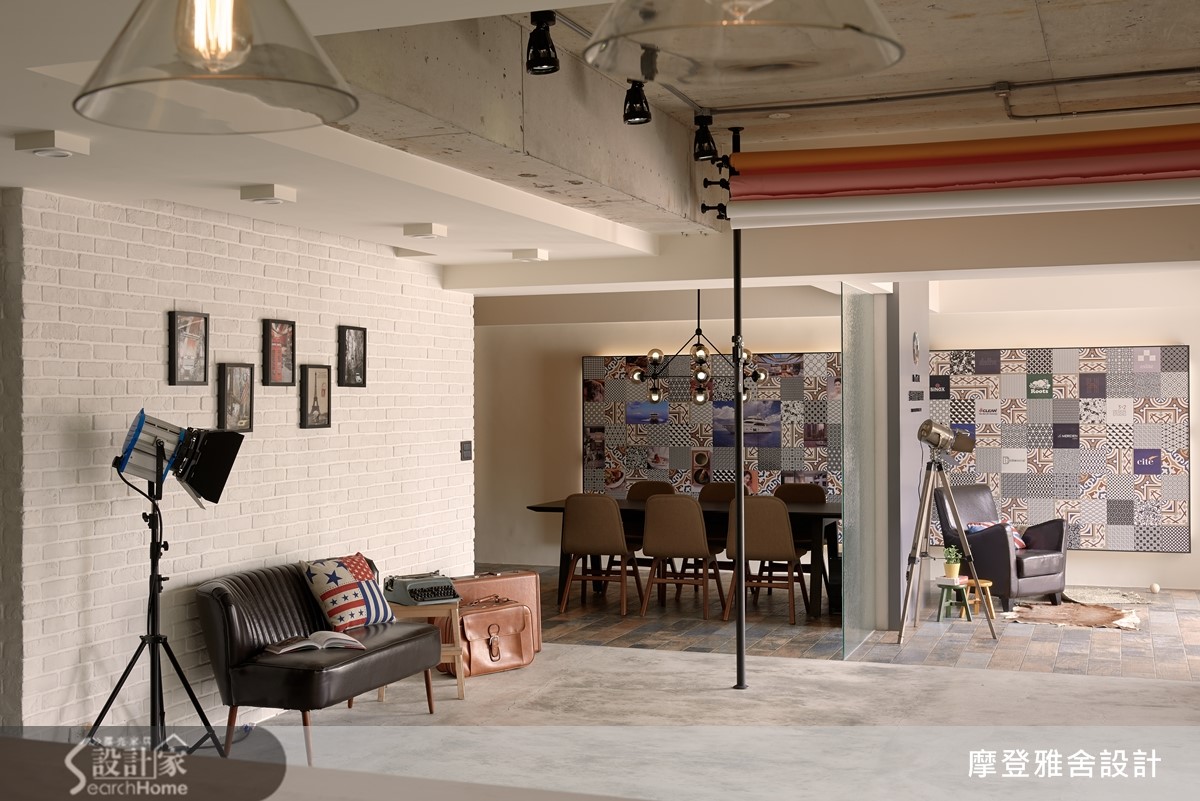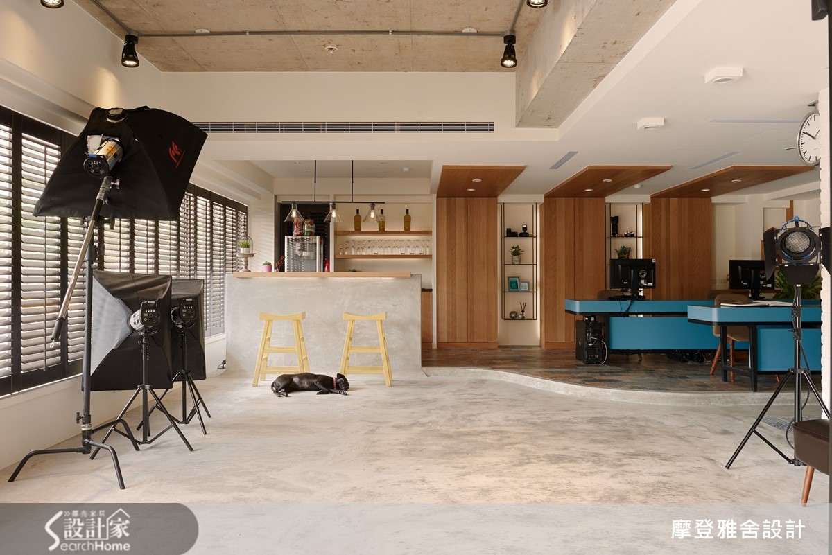 摄影师购下闲置十馀年的一楼店面做为自用工作室,原本无隔断的开放场域,在重新规划后,区划为洽谈区、摄影棚、吧台区兼休憩区以及工作室,同时融入工业风与乡村风格,让每个角落皆充满视觉惊喜! 【砖材变化花样,带出人文暖度】玄关入门处,设计师规划结合收纳机能的局部隔断,做出场域界定,并在墙面拼贴花砖与数码印刷定制瓷砖,串联整排壁面,创造视觉焦点,而洽谈区的电视墙,则采锯纹木皮搭配仿旧木纹砖,以材质带来人文暖度。【整合多元风格,展现视觉新意】同时整合风格元素,融入乡村感的文化石墙与木百叶,搭配 Loft风不封板天花、水泥粉光地面等,使乡村风完美揉合工业感,展现视觉新意;工作区则让桌体呈亮眼的土耳其蓝烤漆,在中性底调之中,形成醒目富有朝气的亮点!