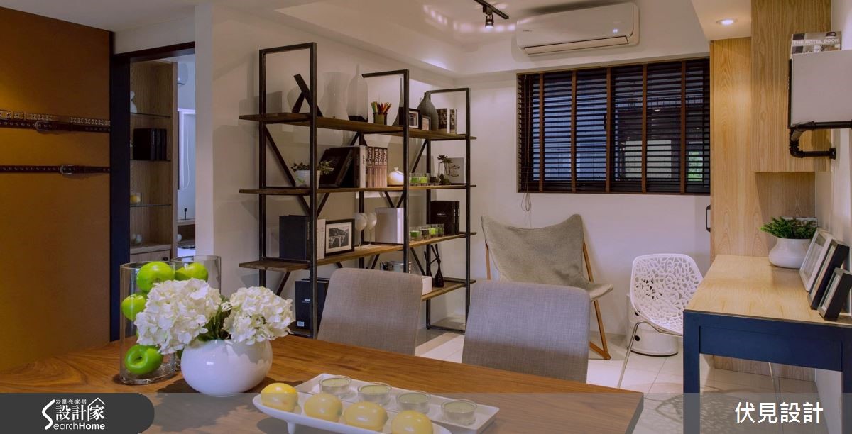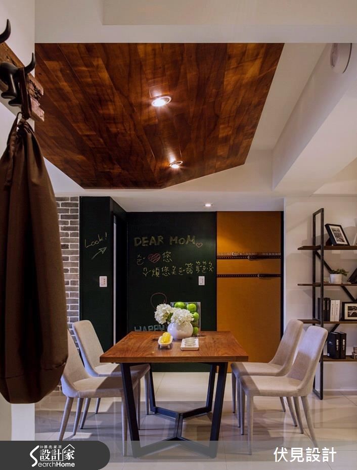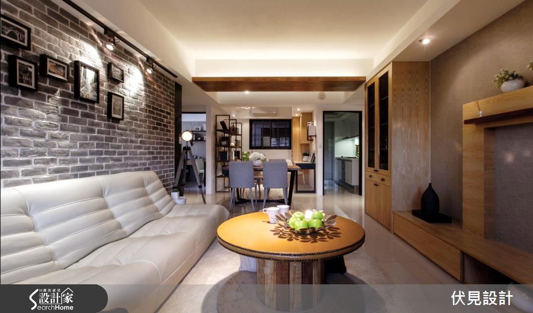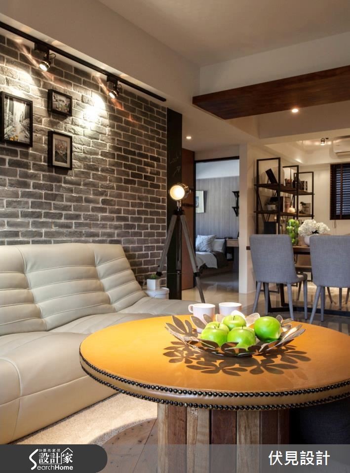 设计师将客厅、餐厅与书房动线以直线串连,开放式空间展现通透无碍。巧妙将装修重点放在素材选用,包含文化石、轨道照明与色调搭配,成功抓出工业风格定位,打造粗犷朴实的氛围。【实木巧妙遮梁,兼顾照明机能】客厅背墙以色调粗犷自然的文化石作为基底,搭配轨道照明投射显露光影层次。同时墙上妆点画作,搭配定制铁件与皮制家具,彻底发挥复古而时尚的特色。客厅与餐厅之有大梁经过,为了达到遮梁效果,利用实木吊顶作为修饰。更延伸至餐厅上方成为照明设置。位于直线末端为独立厨房与开放书房,铁制书架相当利落,也提供了一处个性的阅读所在。